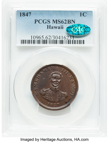 1847 Hawaii 1c PCGS MS62 BN CAC
