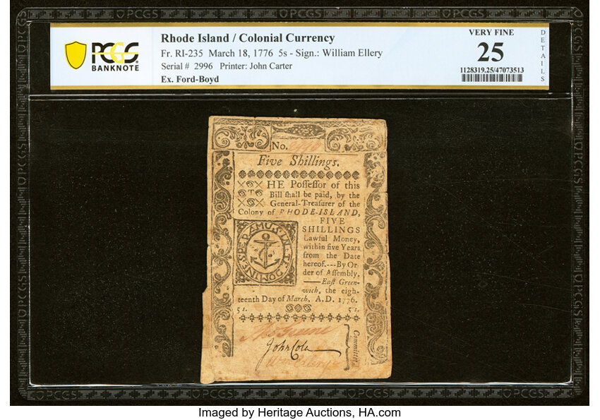 Mar 18, 1776 Rhode Island 5s PCGS VF25 (Fr. RI235)