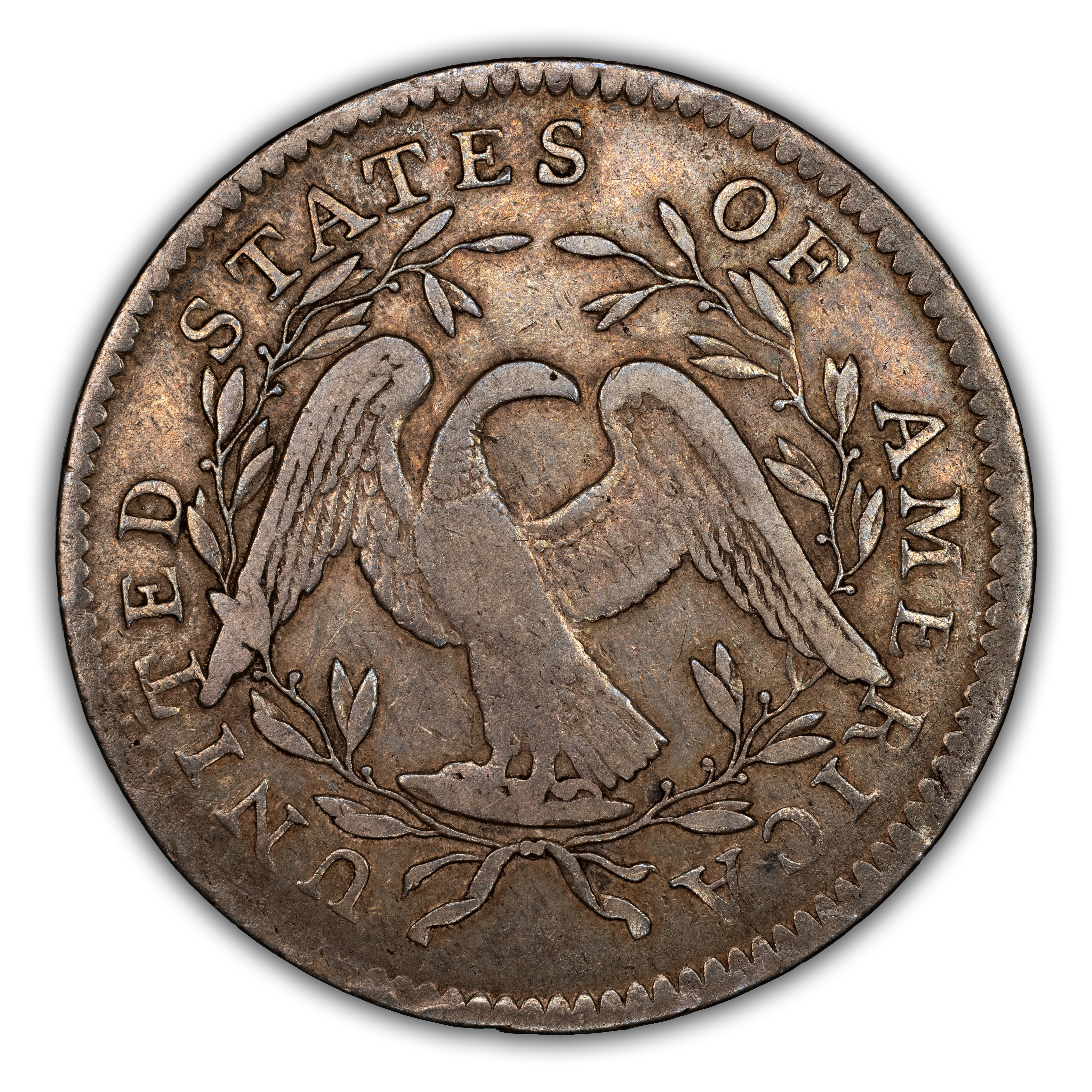 Obverse: The original design of Liberty, facing right, with hair flowing as if facing a slight breeze. 8 and 7 stars on the left and right periphery, respectively with the word LIBERTY across the top and the date positioned in the bottom center.