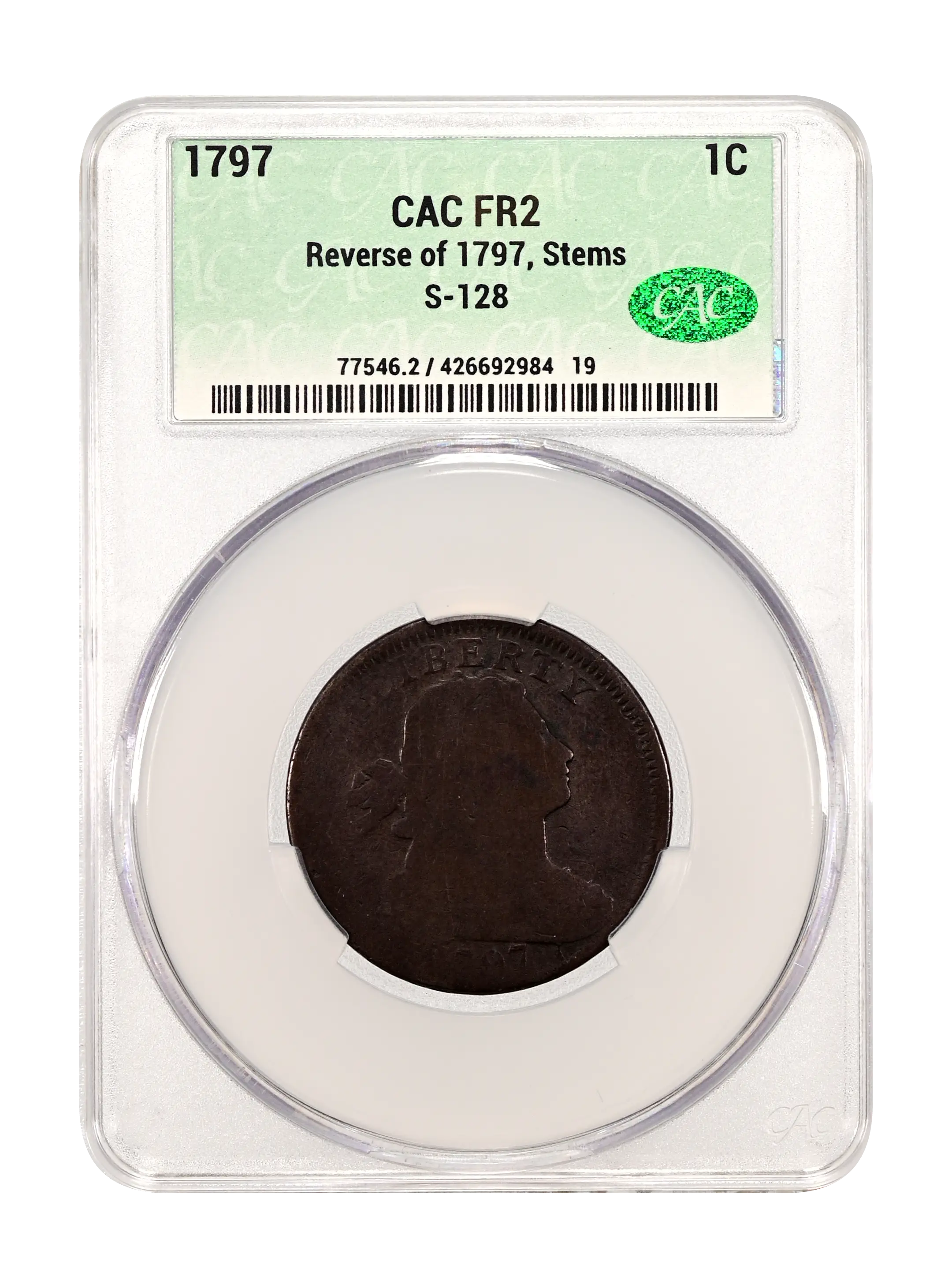 1797 1C Reverse of 1797, Stems AU53 NGC. S-128, B-23, R.3. Our EAC Grade XF40....