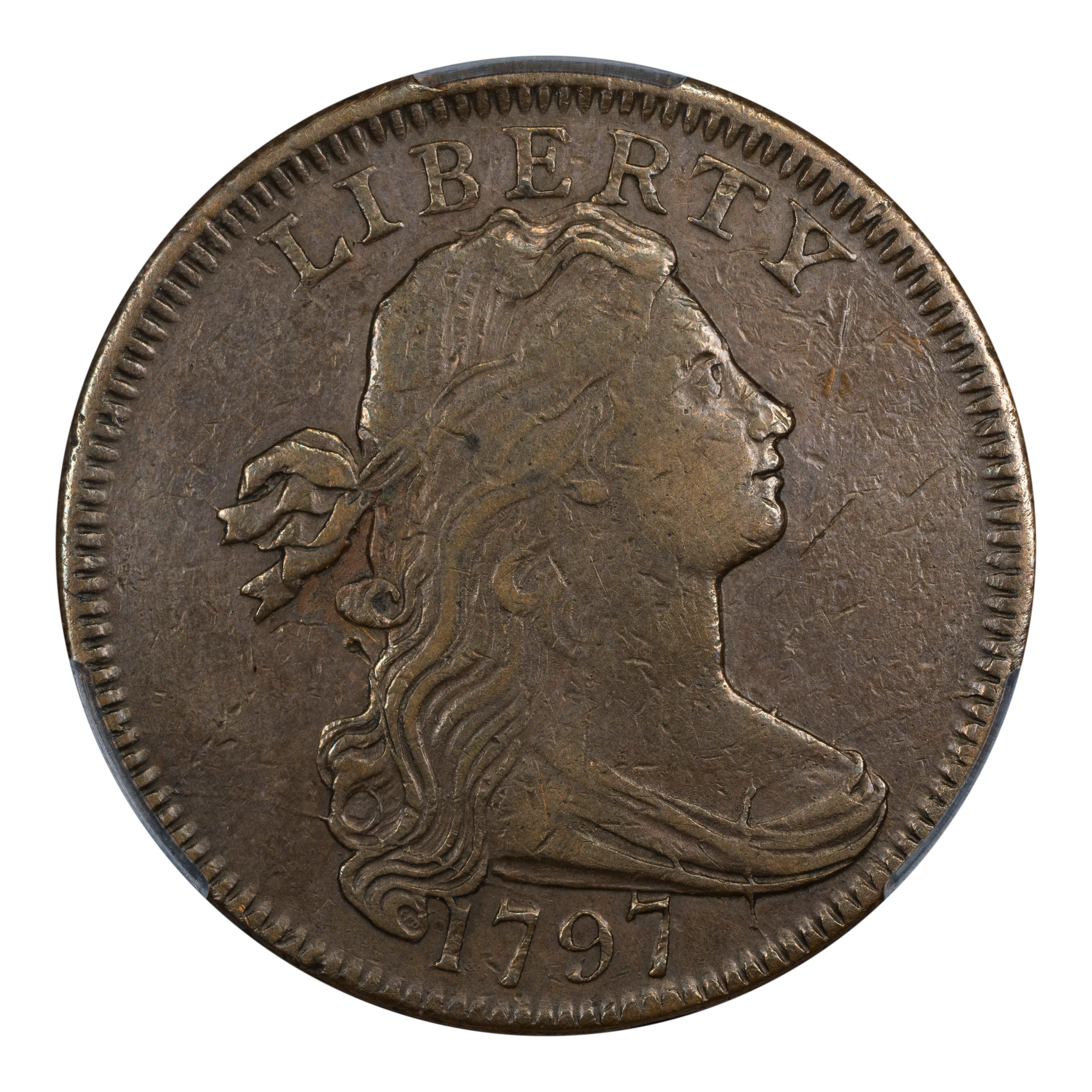 1797 Draped Bust Cent. S-128. Rarity-3. Reverse of 1797, Stems to Wreath. EF-40 (PCGS).