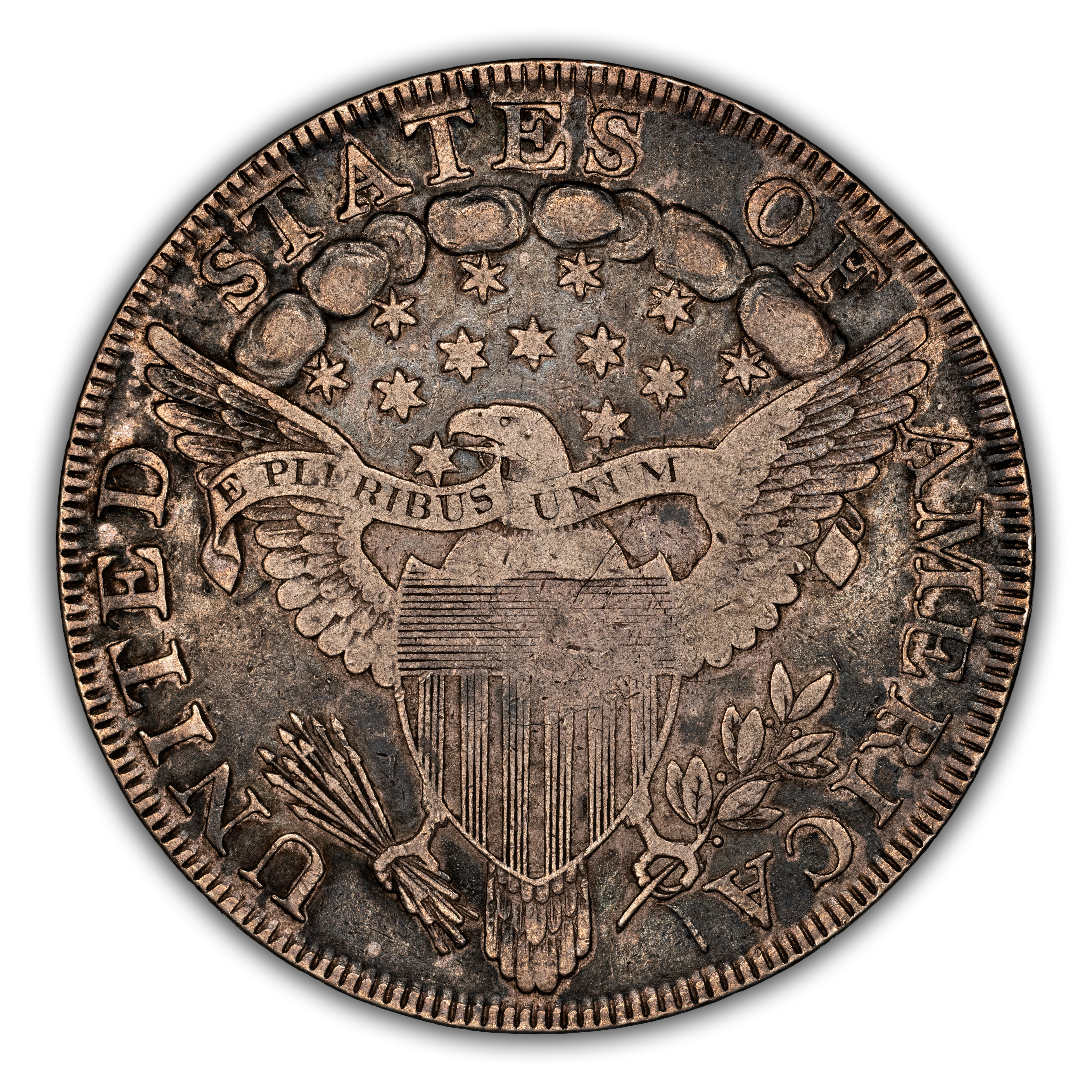 Reverse: The centerpiece of the reverse is the so-called "heraldic eagle" with wings fully spread and emblazoned with a shield replacing the chest. A ribbon bearing the motto E PLURIBUS UNUM hangs from the beak. The eagle's right talon holds bundle of arrows and an olive branch in the right. Above the eagle's head are a group of stars and clouds with the words UNITED STATES OF AMERICA at the periphery.