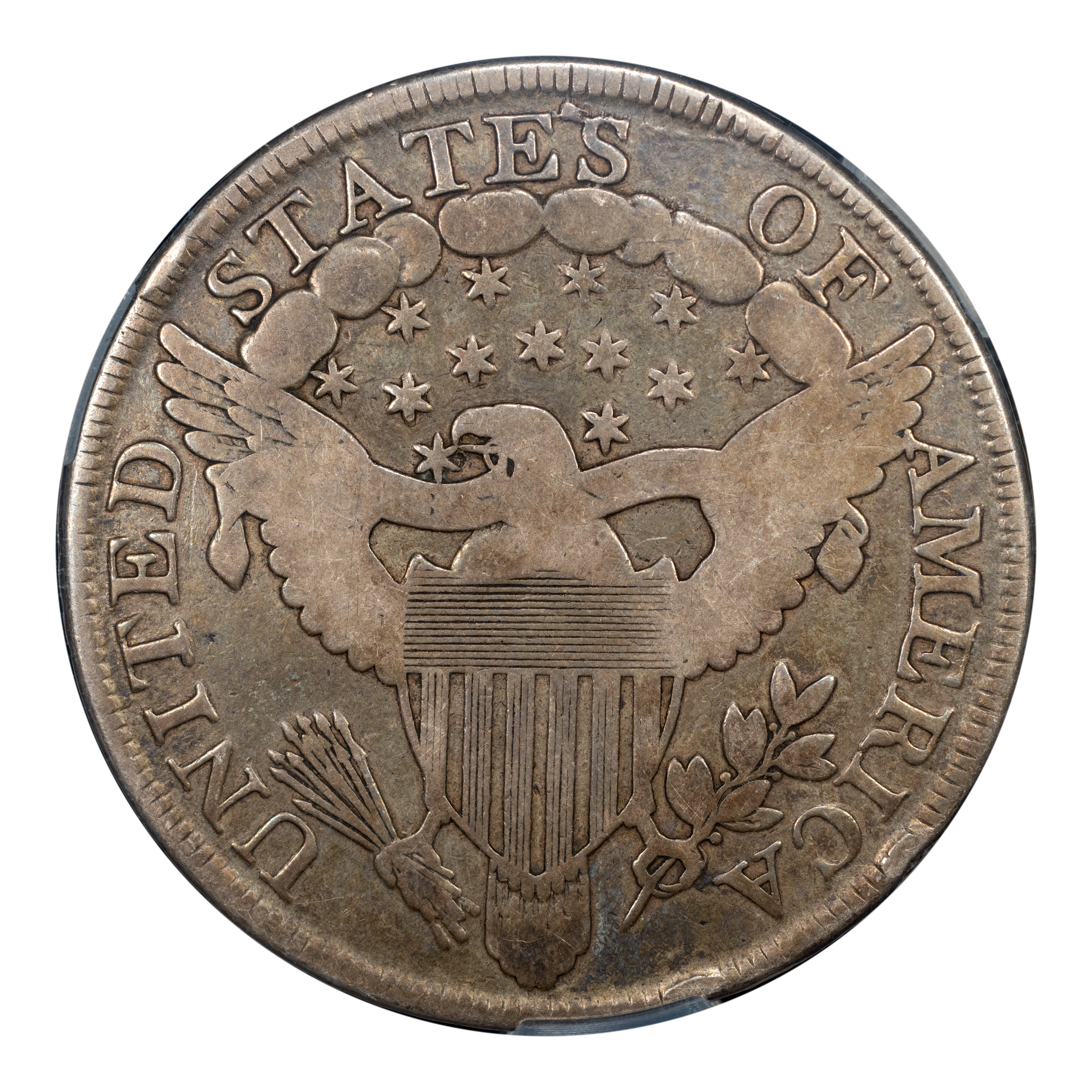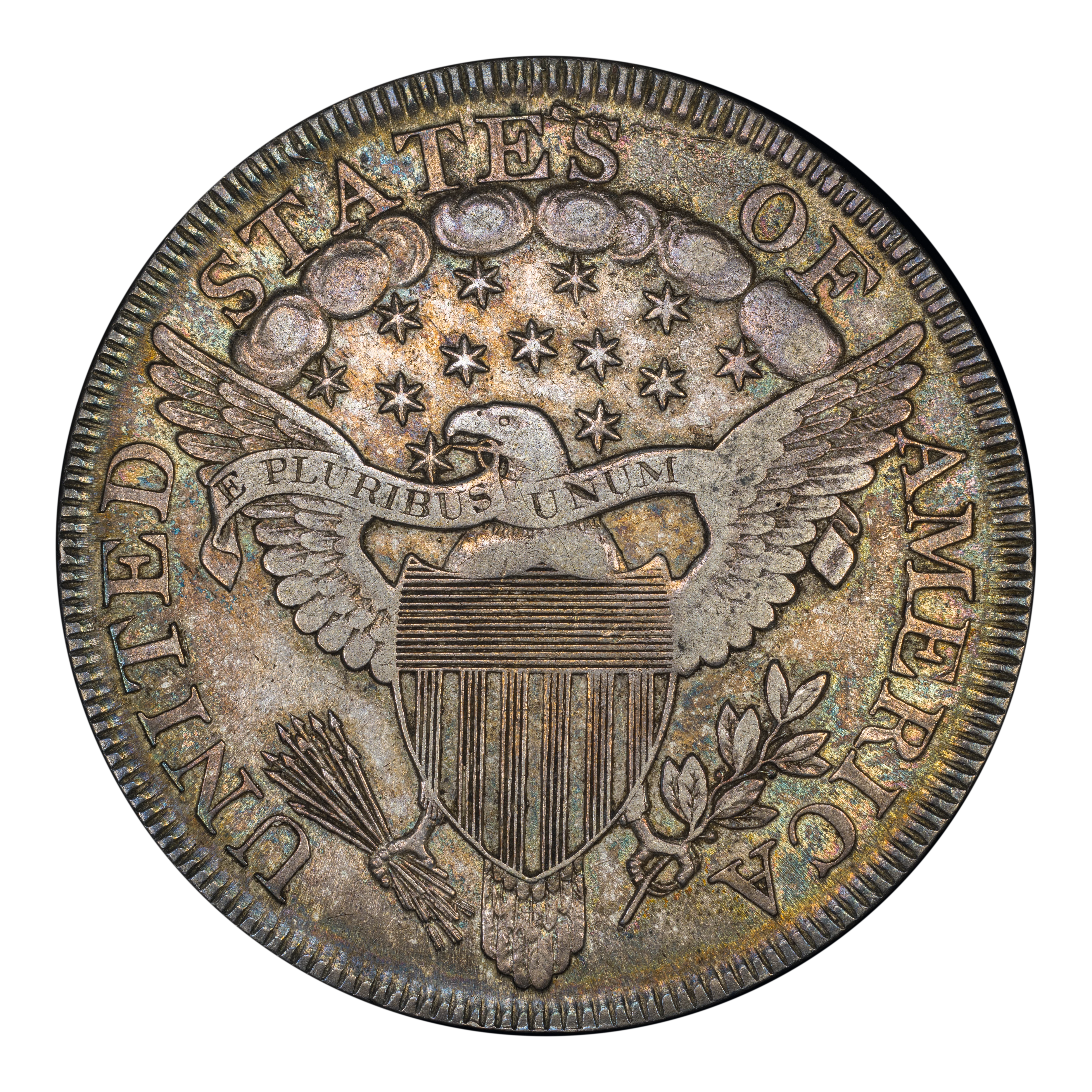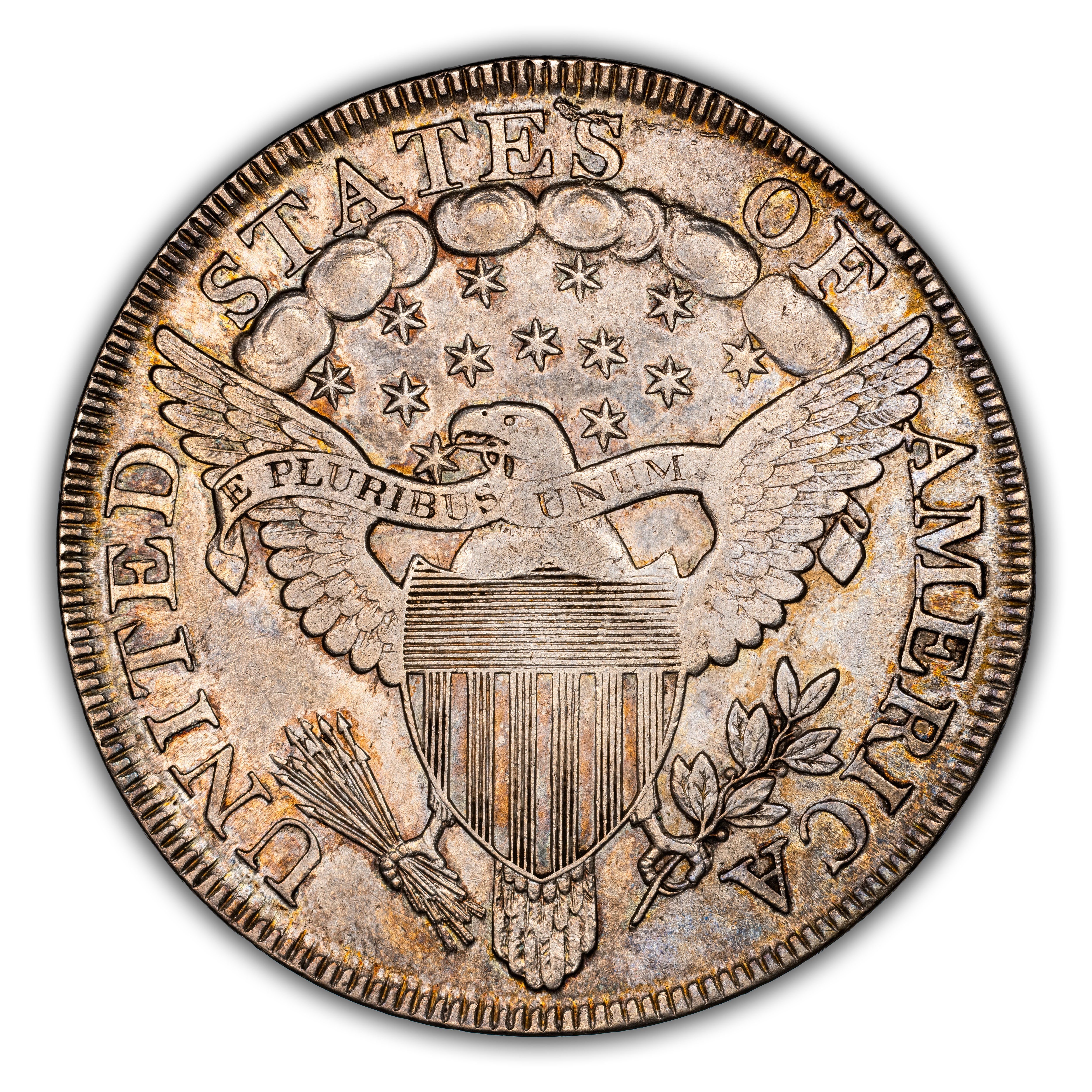 Reverse: The centerpiece of the reverse is the so-called "heraldic eagle" with wings fully spread and emblazoned with a shield replacing the chest. A ribbon bearing the motto E PLURIBUS UNUM hangs from the beak. The eagle's right talon holds bundle of arrows and an olive branch in the right. Above the eagle's head are a group of stars and clouds with the words UNITED STATES OF AMERICA at the periphery.