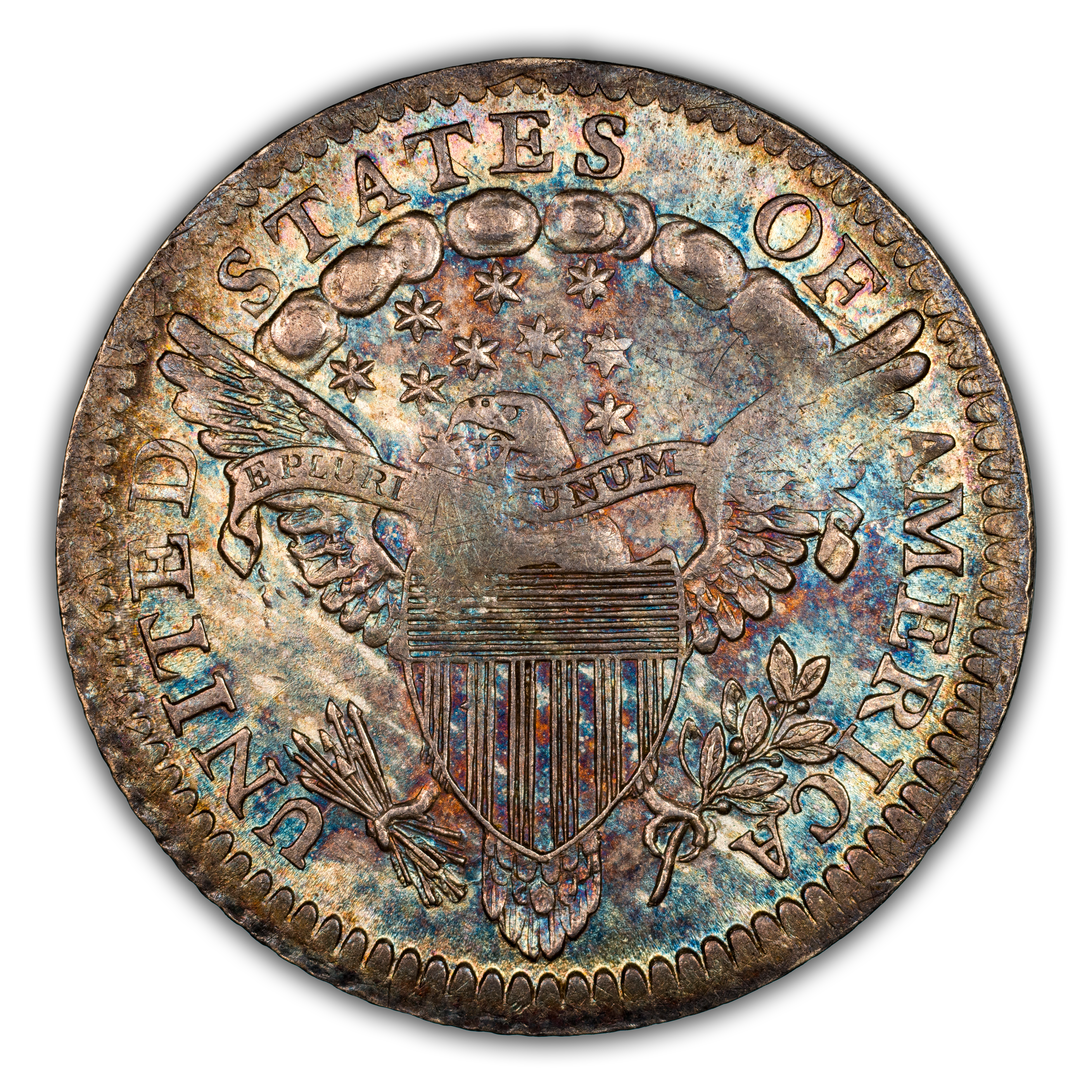 Reverse: The centerpiece of the reverse is the so-called "heraldic eagle" with wings fully spread and emblazoned with a shield replacing the chest. A ribbon bearing the motto E PLURIBUS UNUM hangs from the beak. The eagles right talon holds bundle of arrows and an olive branch in the right. Above the eagle's head are a group of stars and clouds with the words UNITED STATES OF AMERICA at the top periphery. No denomination is mentioned.