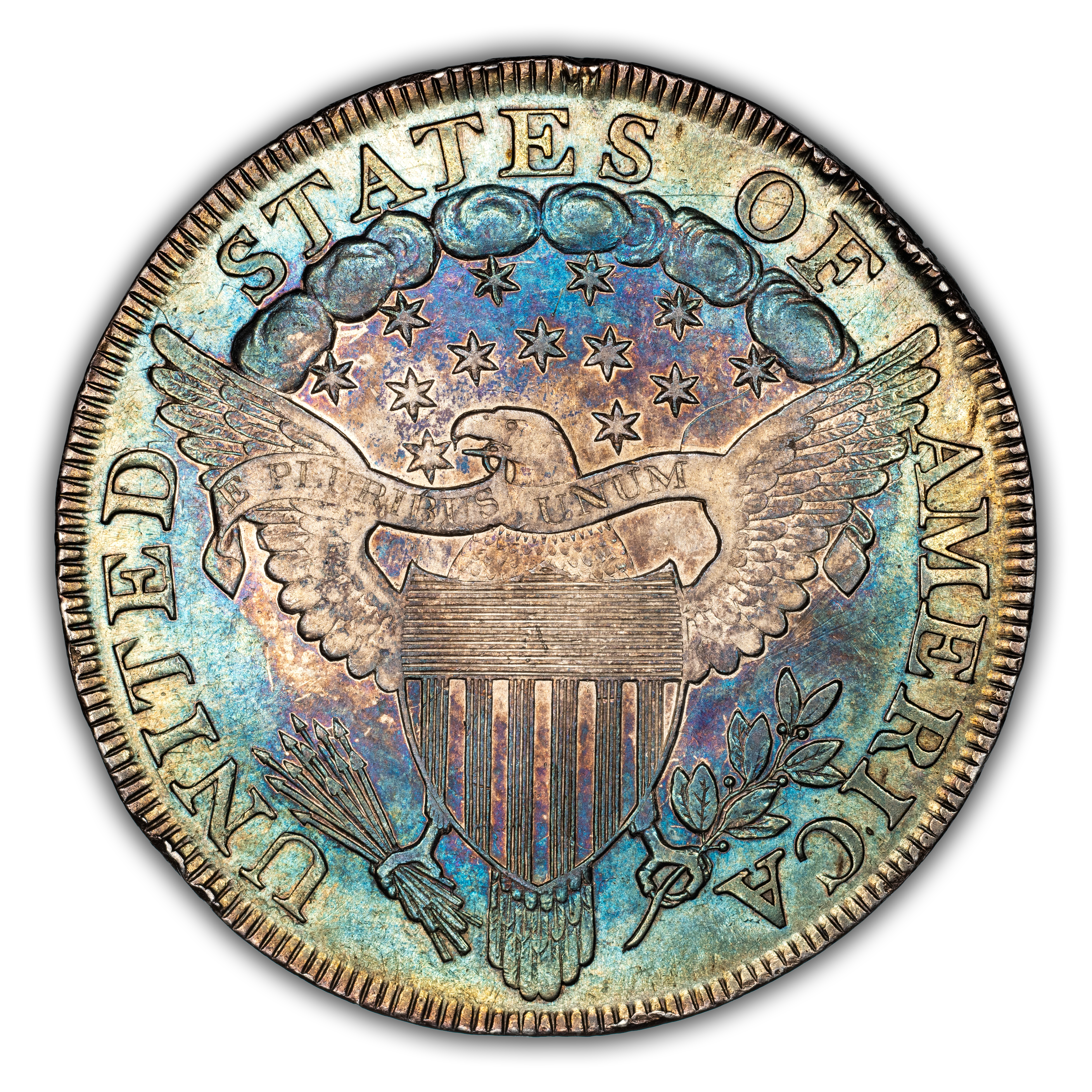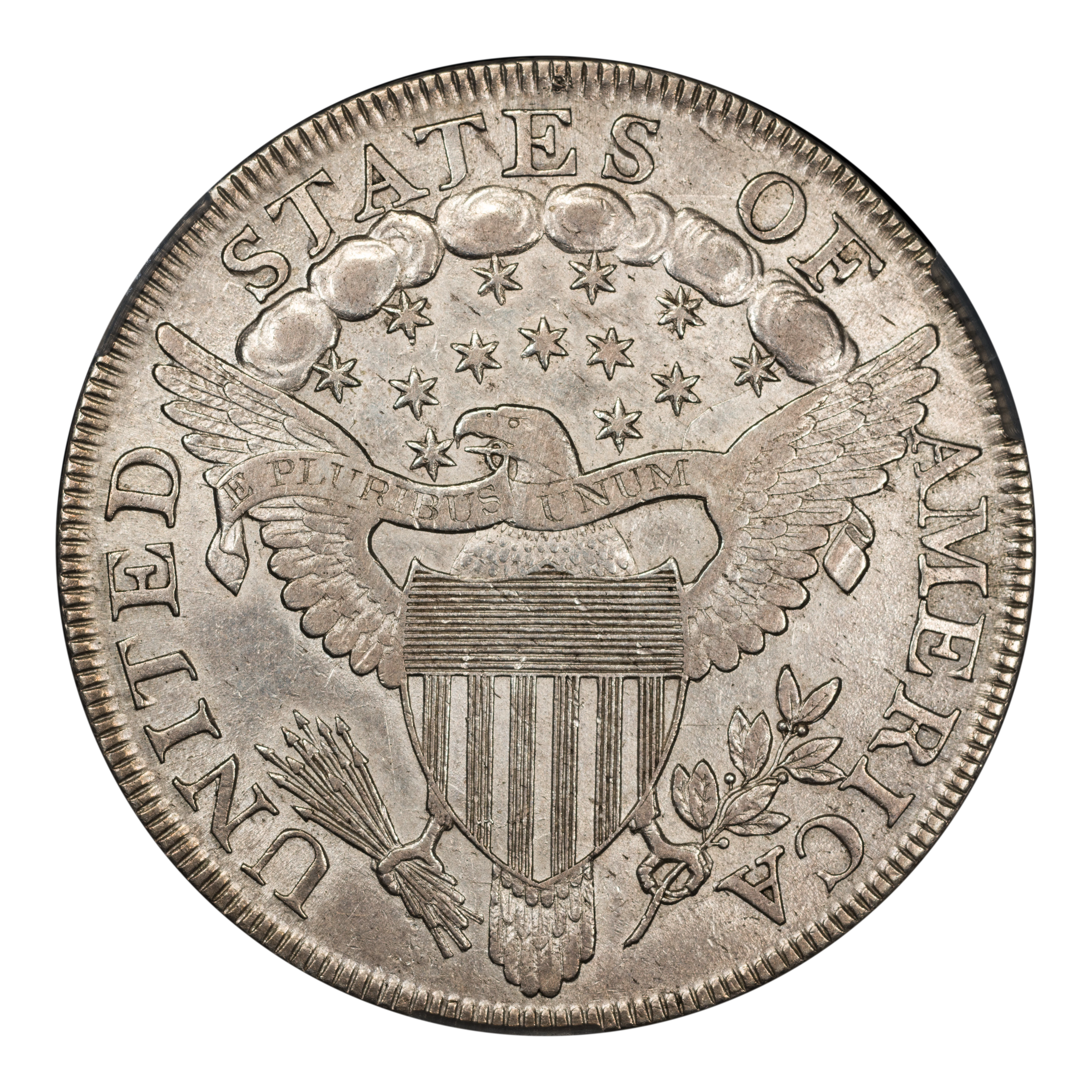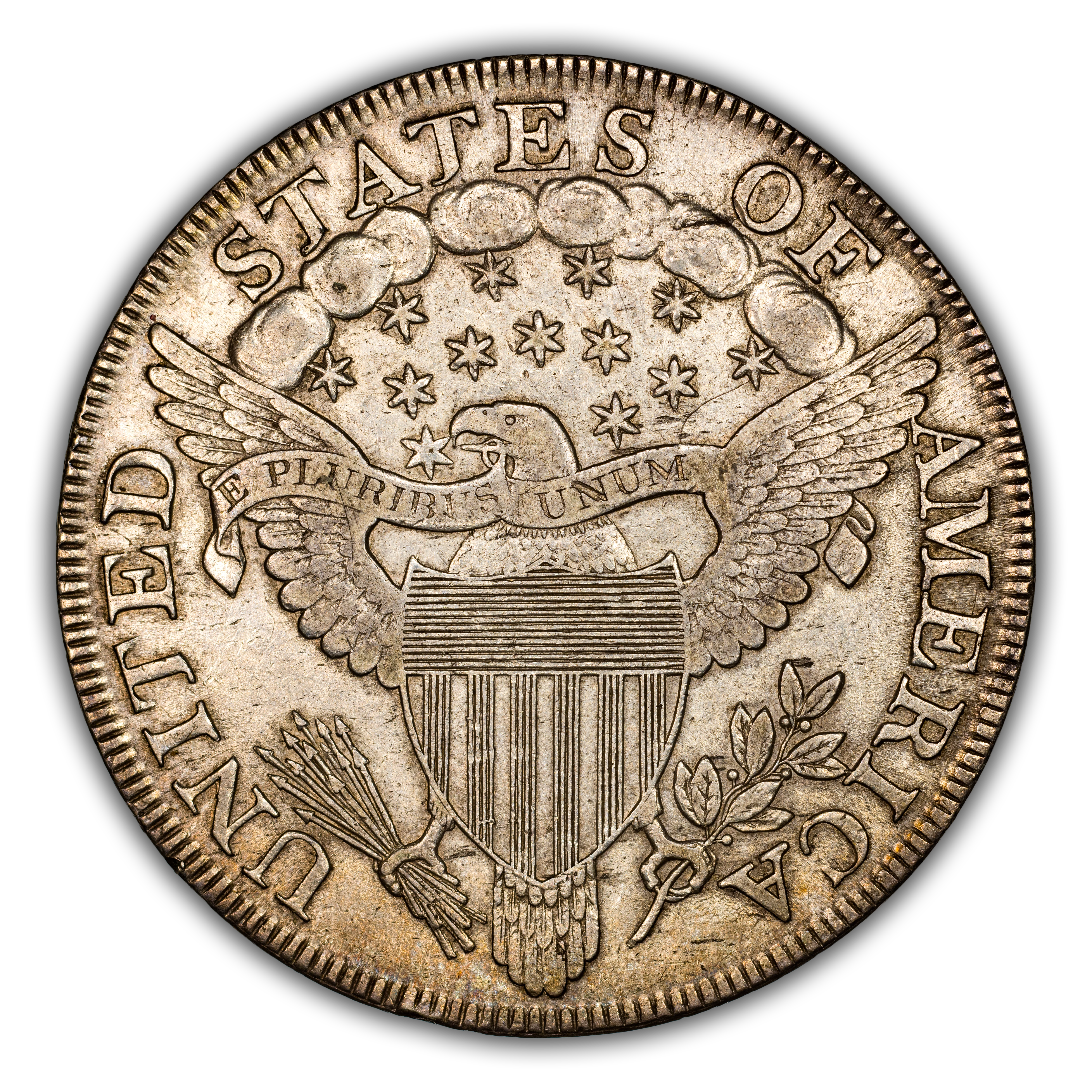 Reverse: The centerpiece of the reverse is the so-called "heraldic eagle" with wings fully spread and emblazoned with a shield replacing the chest. A ribbon bearing the motto E PLURIBUS UNUM hangs from the beak. The eagle's right talon holds bundle of arrows and an olive branch in the right. Above the eagle's head are a group of stars and clouds with the words UNITED STATES OF AMERICA at the periphery.