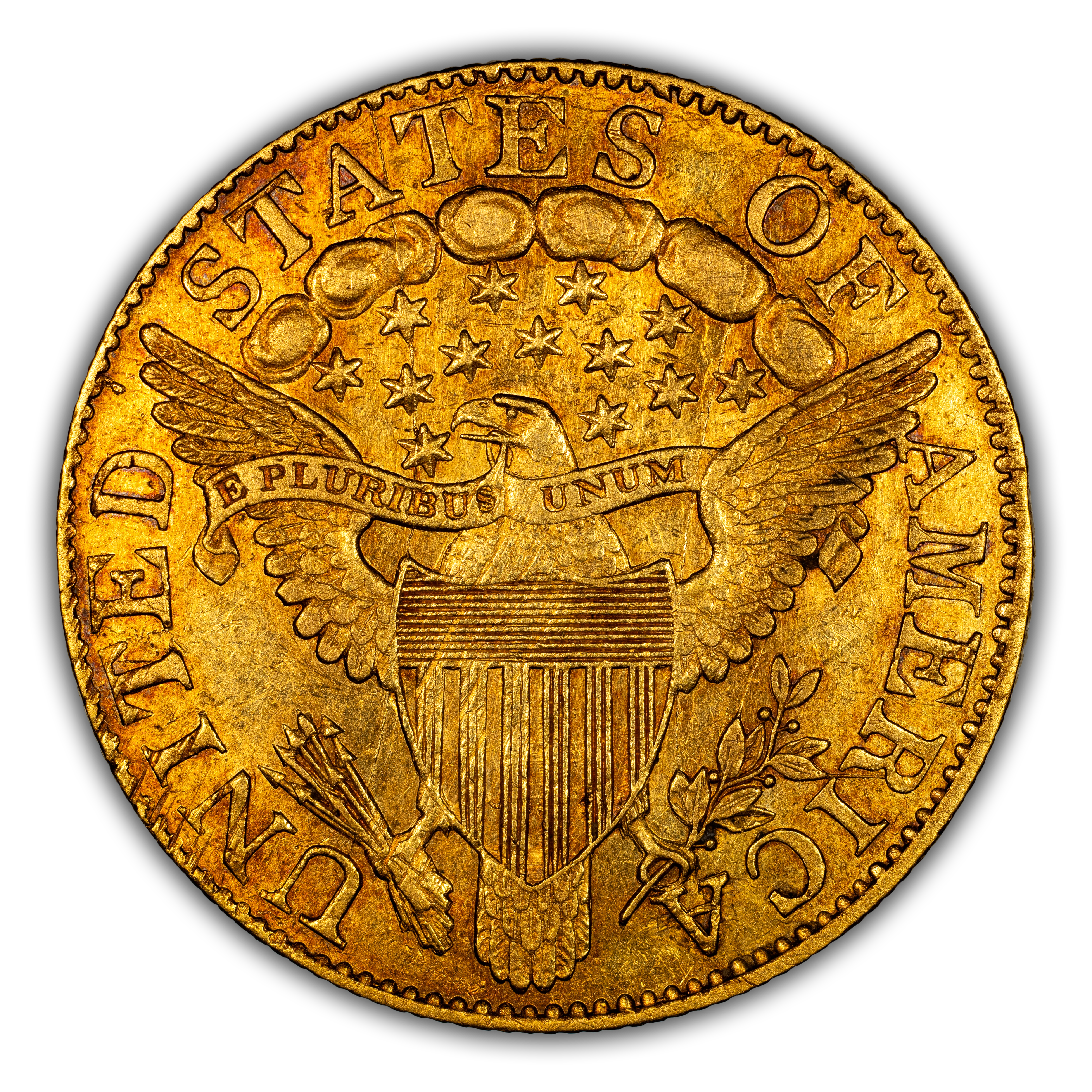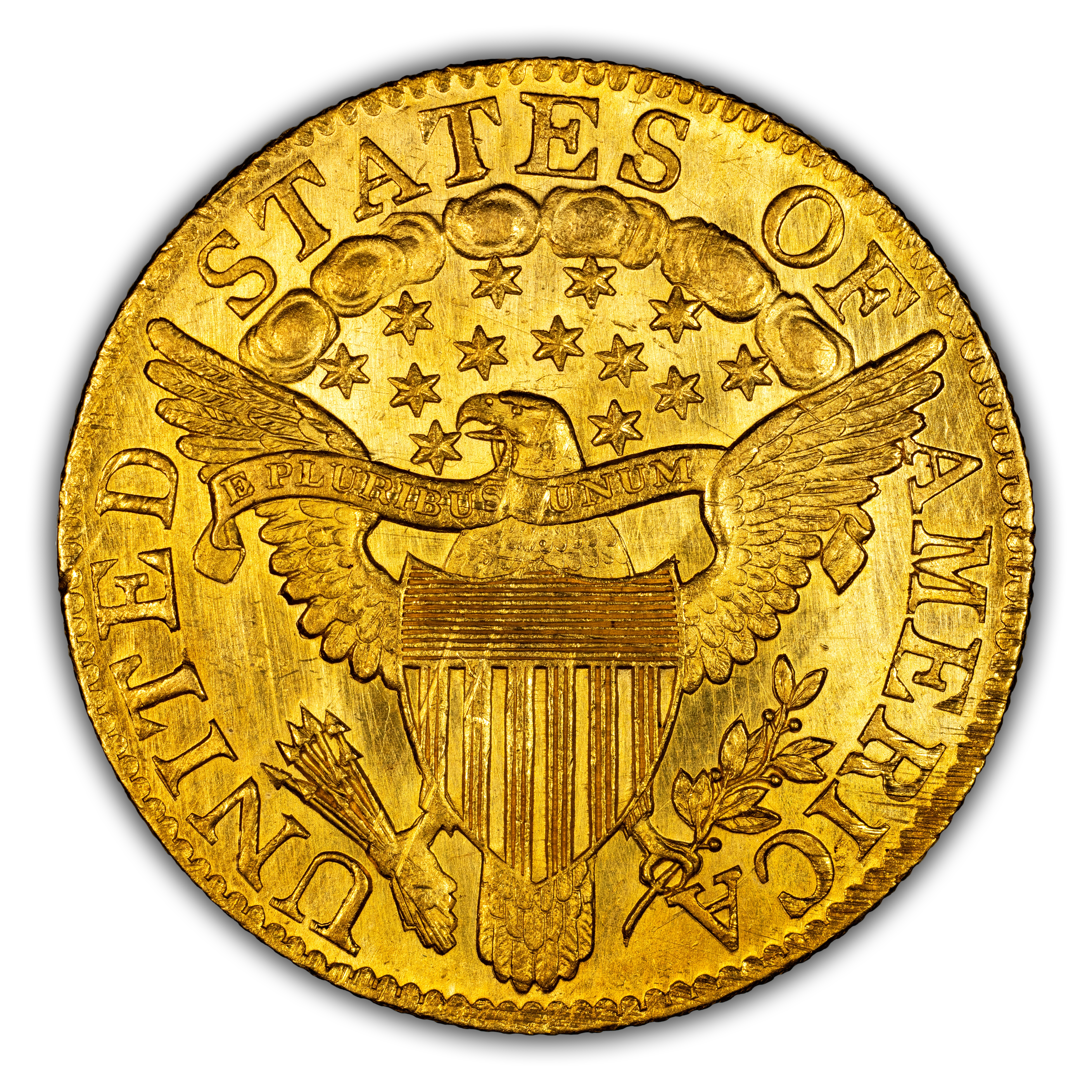 Reverse: The centerpiece of the reverse is the so-called "heraldic eagle" with wings fully spread and emblazoned with a shield replacing the chest. A ribbon bearing the motto E PLURIBUS UNUM hangs from the beak. The eagle's right talon holds bundle of arrows and an olive branch in the right. Above the eagle's head are a group of stars and clouds with the words UNITED STATES OF AMERICA at the periphery.