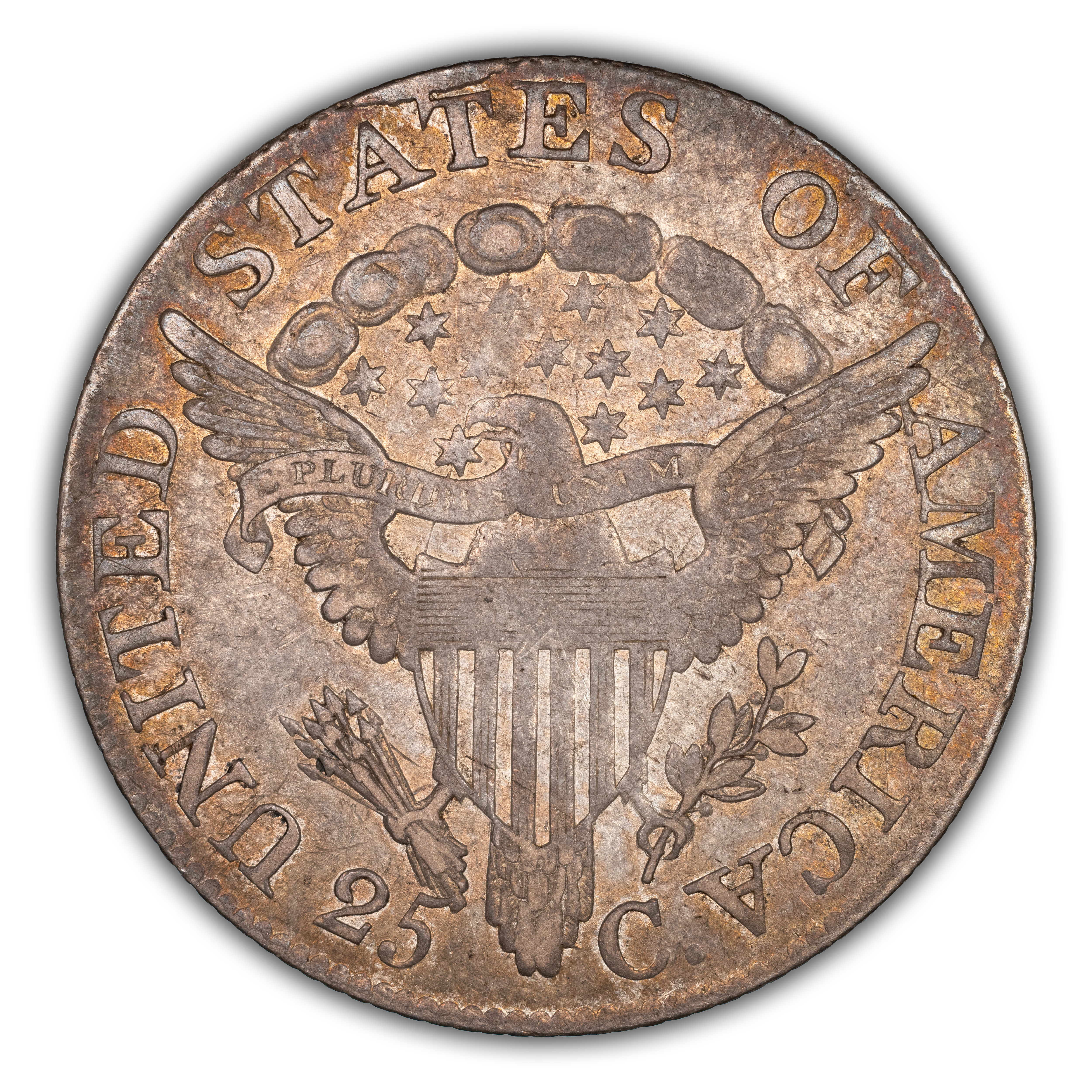 Reverse: The centerpiece of the reverse is the so-called "heraldic eagle" with wings fully spread and emblazoned with a shield replacing the chest. A ribbon bearing the motto E PLURIBUS UNUM hangs from the beak. The eagles right talon holds bundle of arrows and an olive branch in the right. Above the eagle's head are a group of stars and clouds with the words UNITED STATES OF AMERICA at the top periphery. The denomination of 25 C. appears at the bottom.
