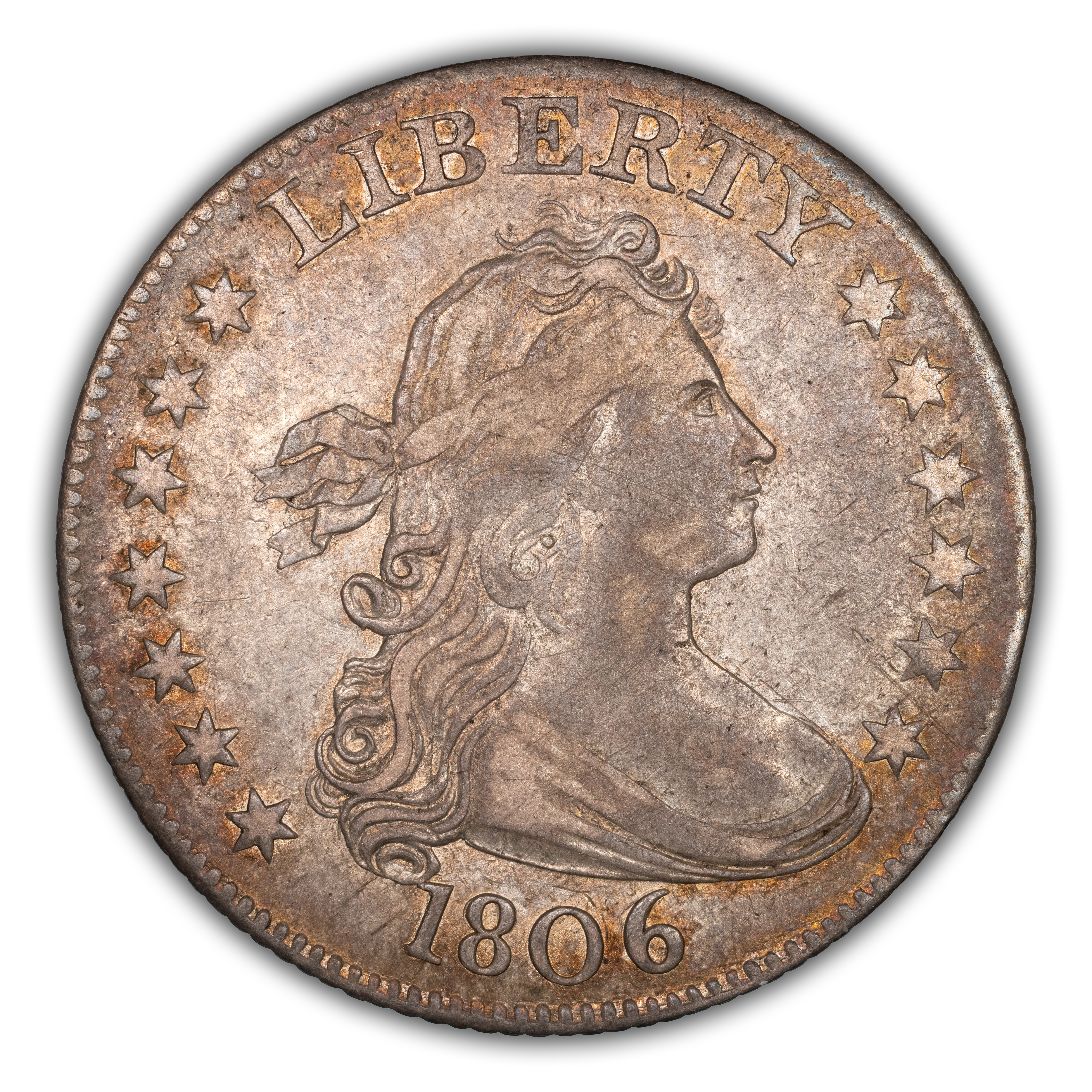 Obverse: Liberty is portrayed with a so-called "draped bust," facing right, with her hair tied back with a ribbon. She is flanked by stars on the left and right periphery with the word LIBERTY on top, and the date positioned at the bottom.