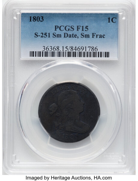 1807 1C Small Fraction, S-274, B-4, R.2, VF25 PCGS. Breen Die State IV, with a repolished obverse die, and the reverse bulg...