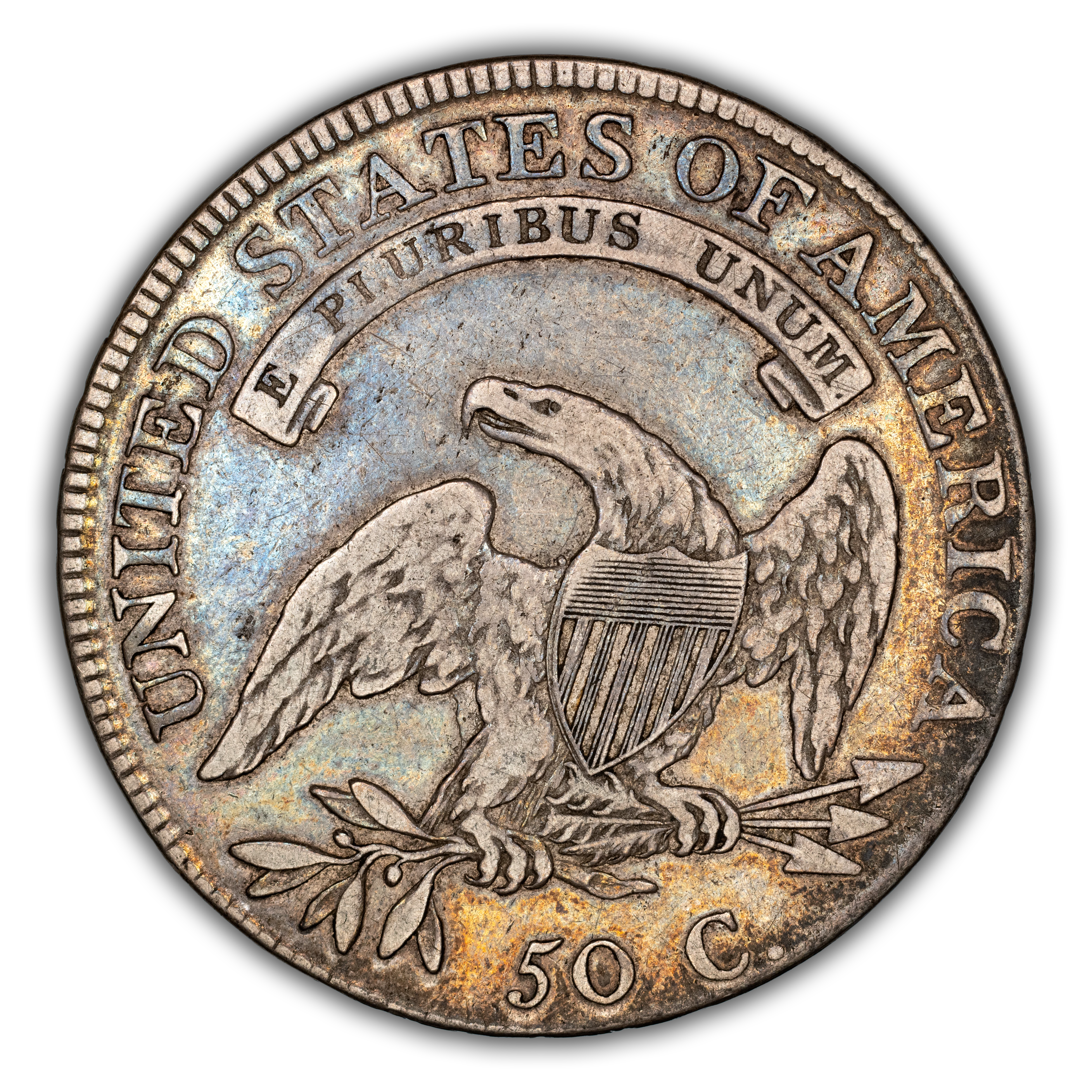 Reverse: An heraldic eagle holding olive branches and 3 arrows in its claws is surrounded by the words UNITED STATES OF AMERICA around the periphery. A ribbon below bears the motto E PLURIBUS UNUM. The denomination of 50C is centered below the eagle.