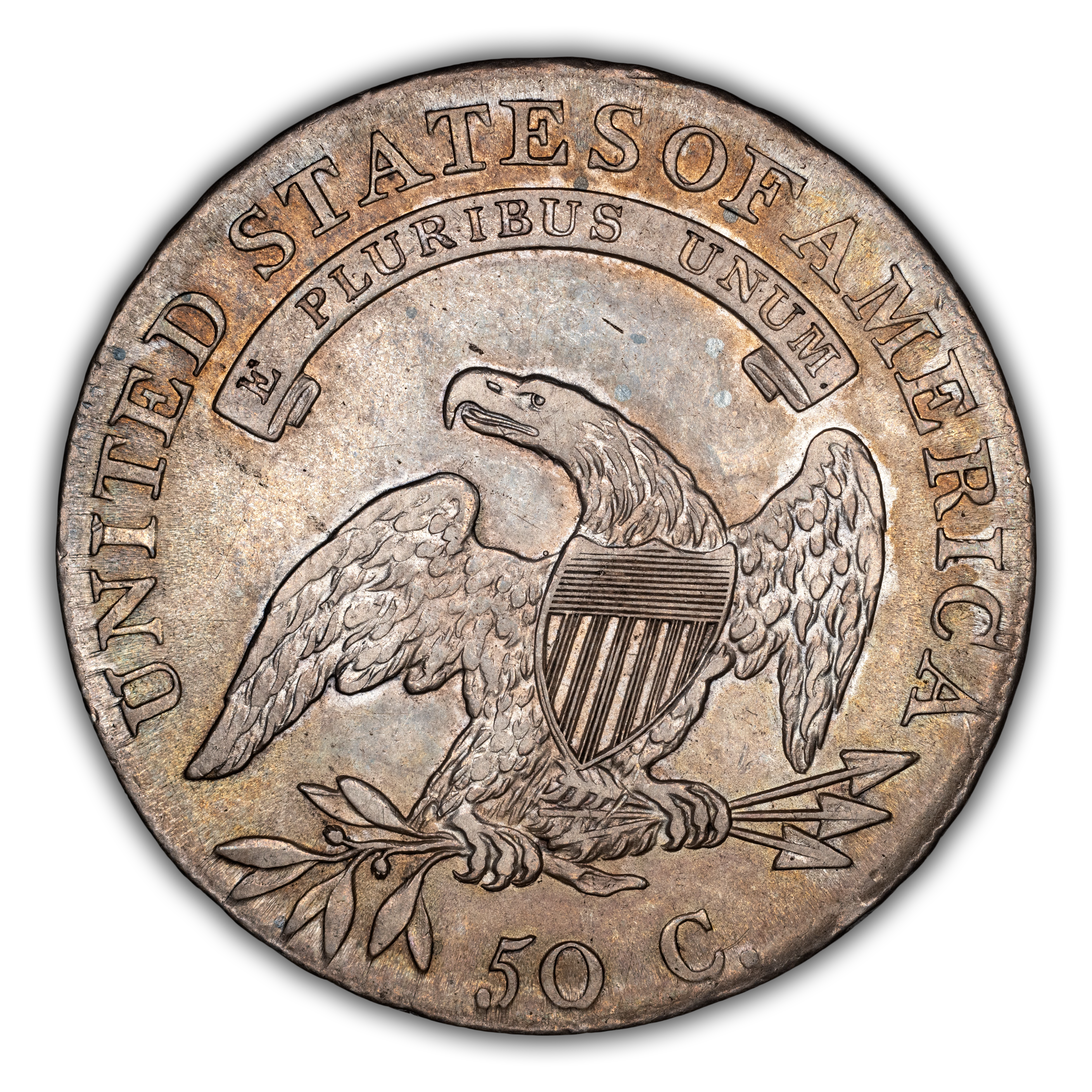 Reverse: An heraldic eagle holding olive branches and 3 arrows in its claws is surrounded by the words UNITED STATES OF AMERICA around the periphery. A ribbon below bears the motto E PLURIBUS UNUM. The denomination of 50C is centered below the eagle.