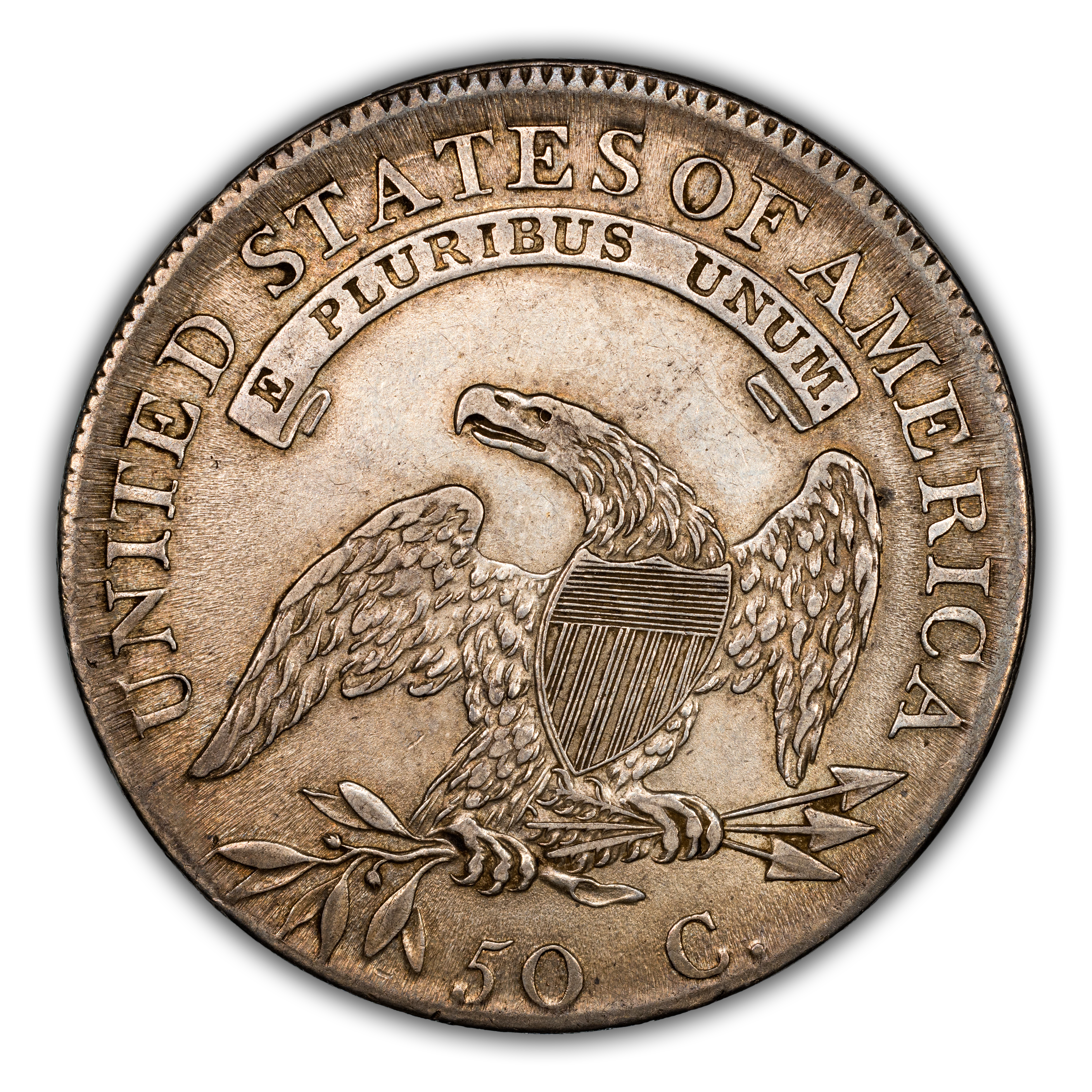 Reverse: An heraldic eagle holding olive branches and 3 arrows in its claws is surrounded by the words UNITED STATES OF AMERICA around the periphery. A ribbon below bears the motto E PLURIBUS UNUM. The denomination of 50C is centered below the eagle.