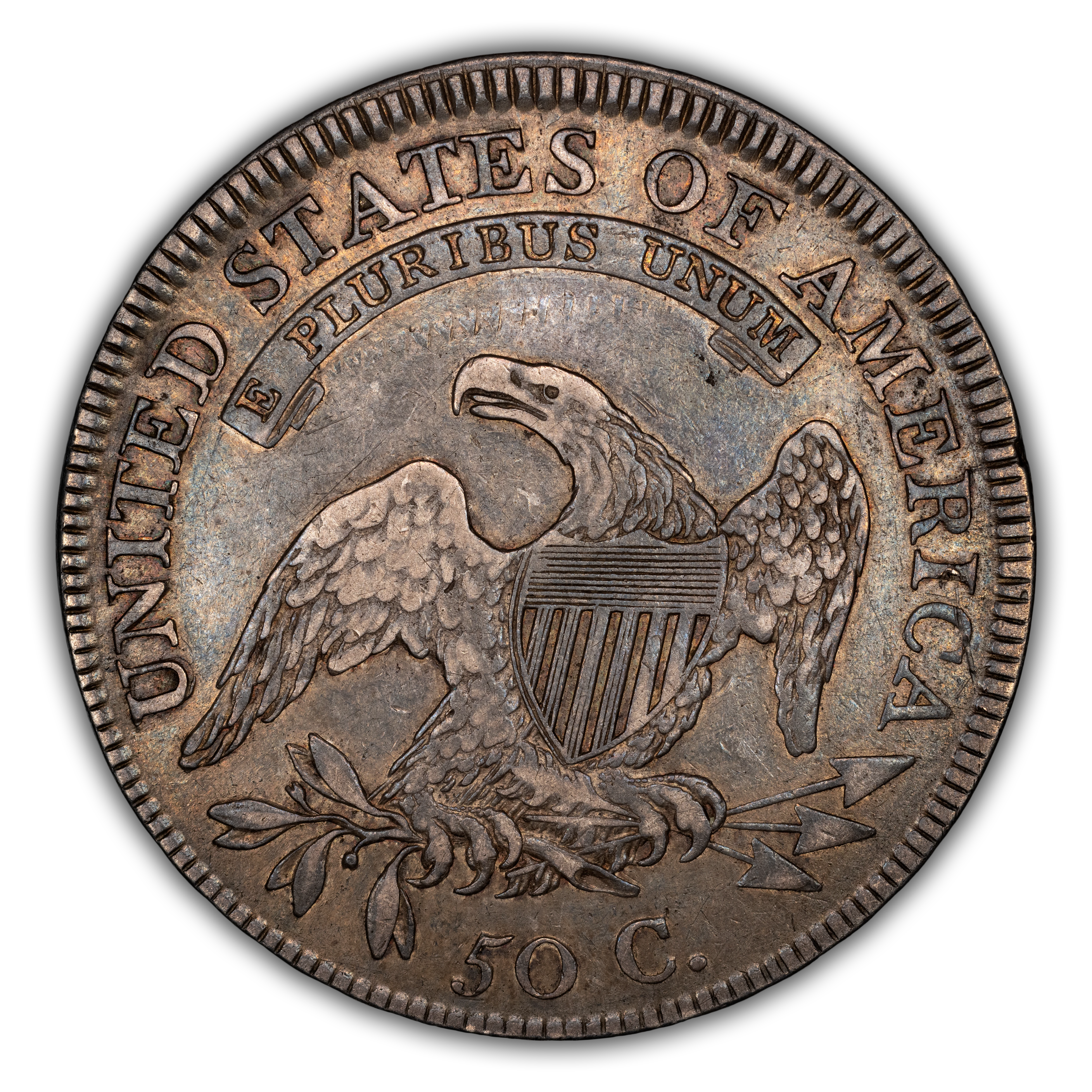 Reverse: An heraldic eagle holding olive branches and 3 arrows in its claws is surrounded by the words UNITED STATES OF AMERICA around the periphery. A ribbon below bears the motto E PLURIBUS UNUM. The denomination of 50C is centered below the eagle.