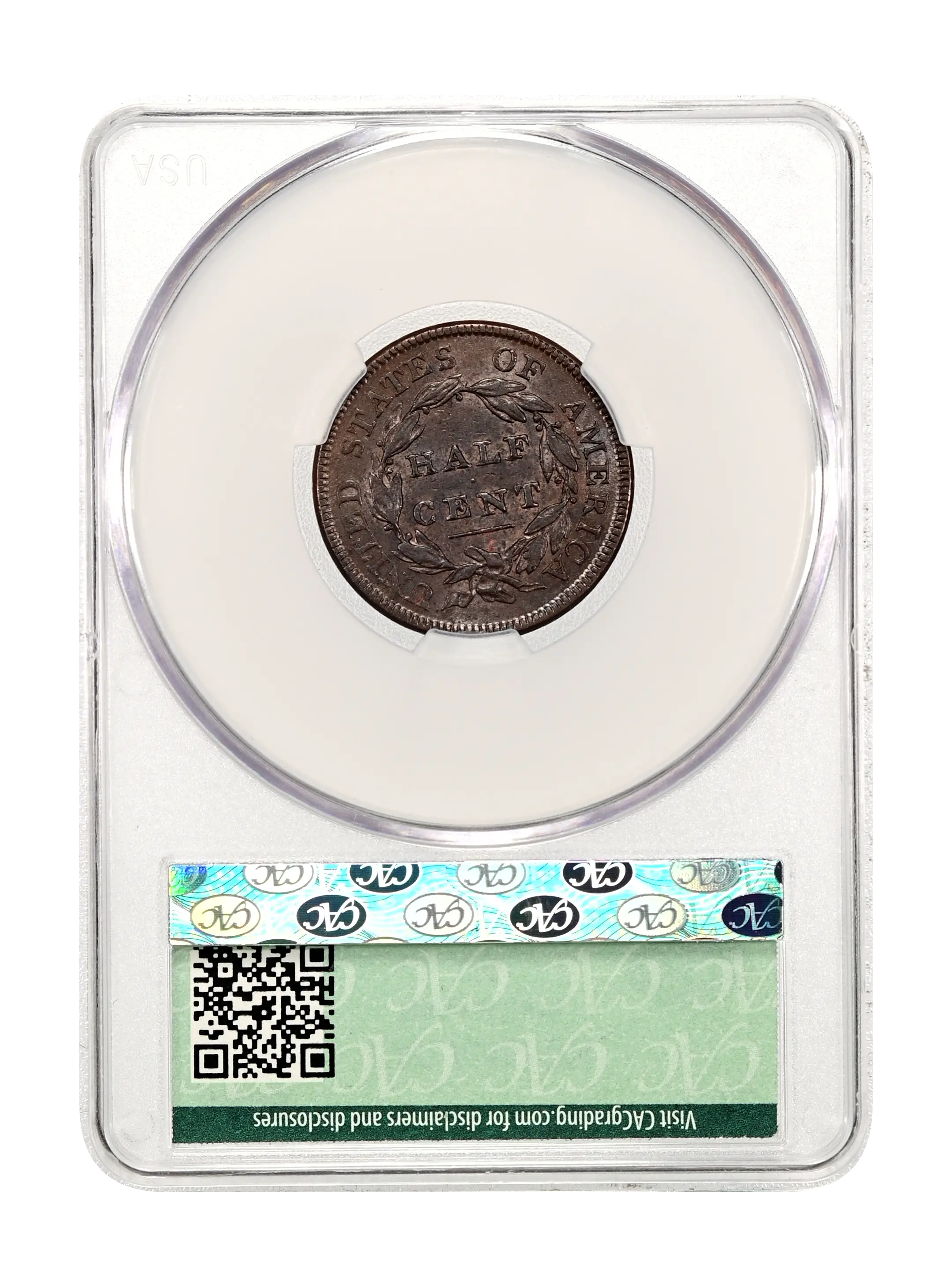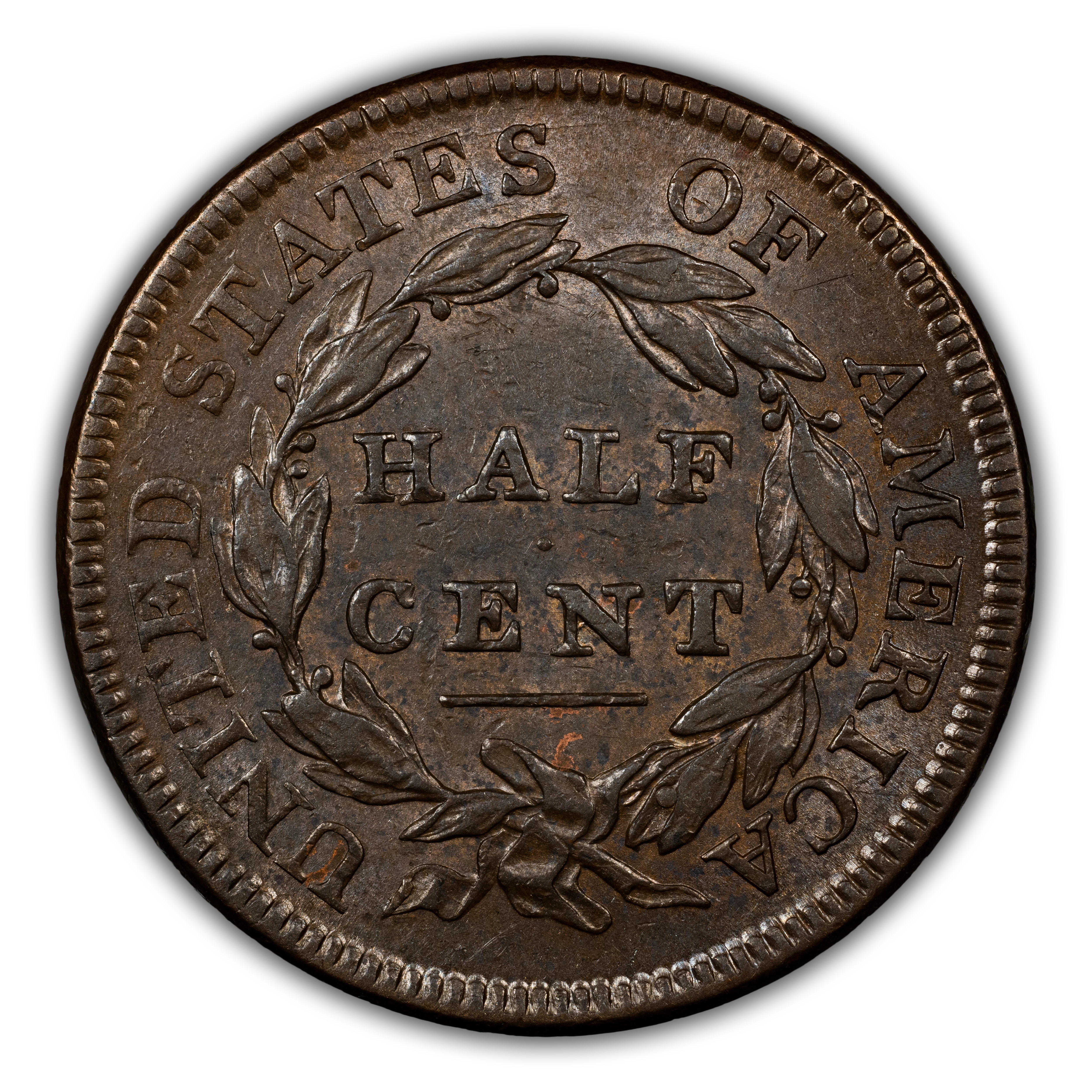 Reverse: The words UNITED STATES OF AMERICA around the periphery surround a wreath framing the words HALF CENT. The wreath is tied by a bow at the bottom.