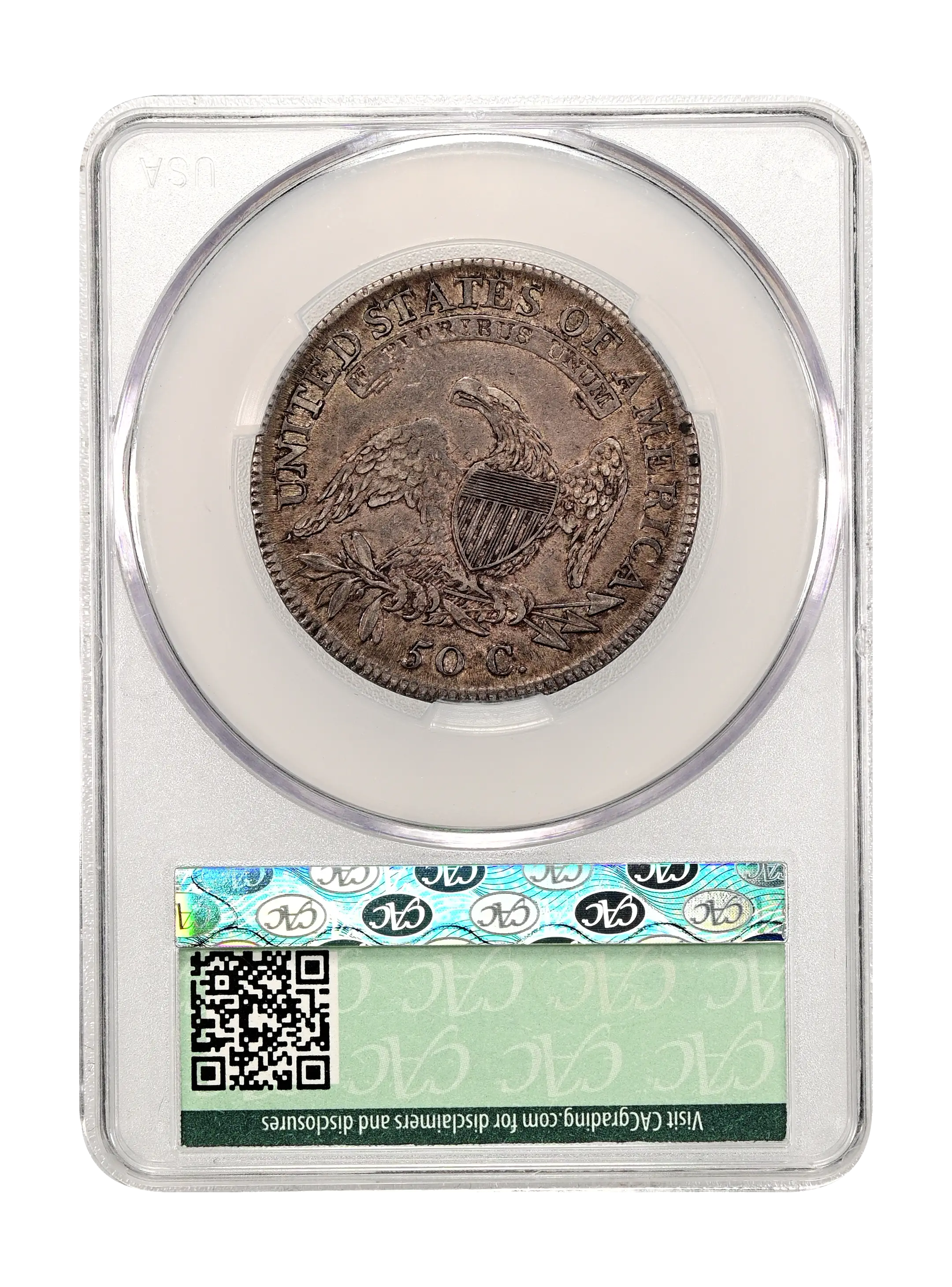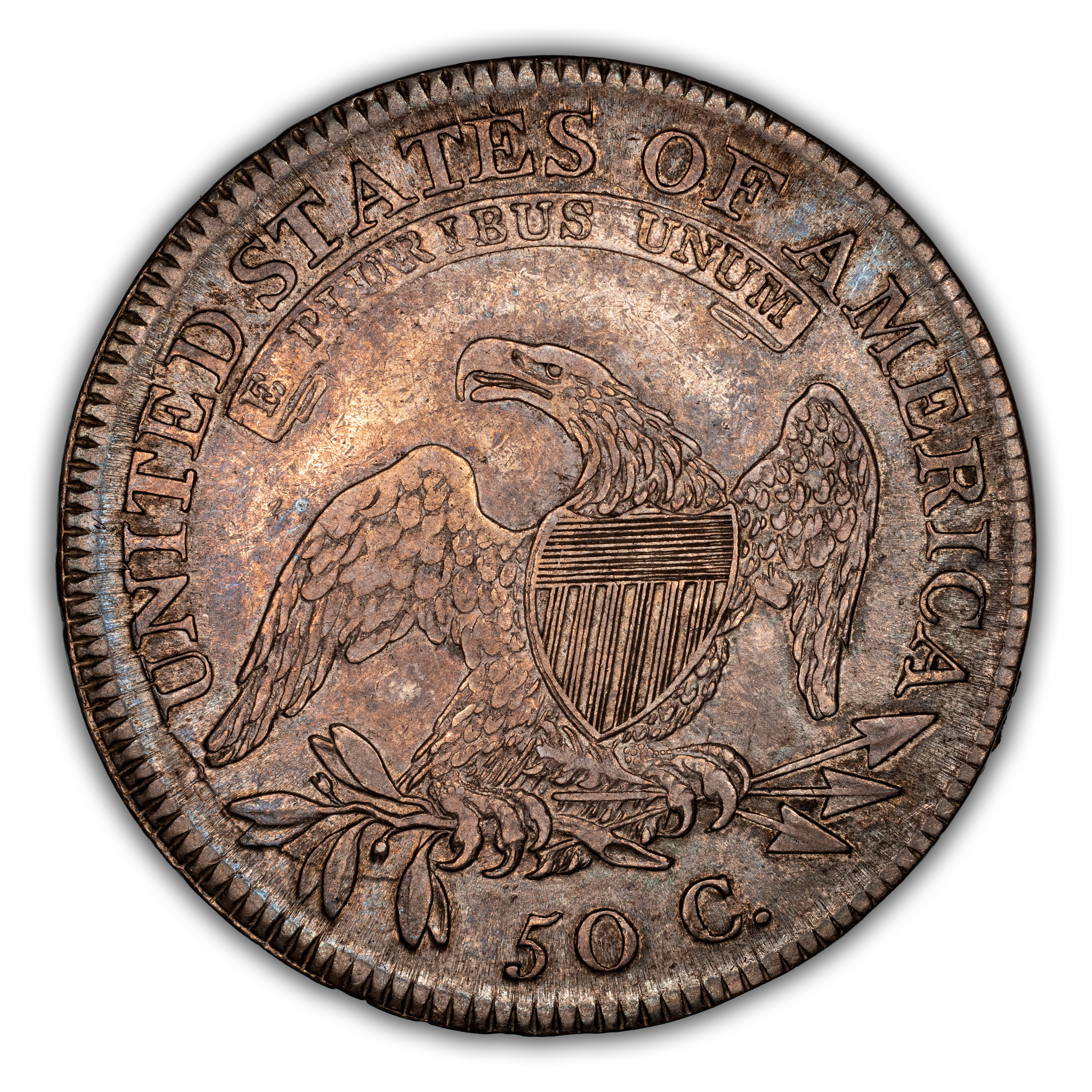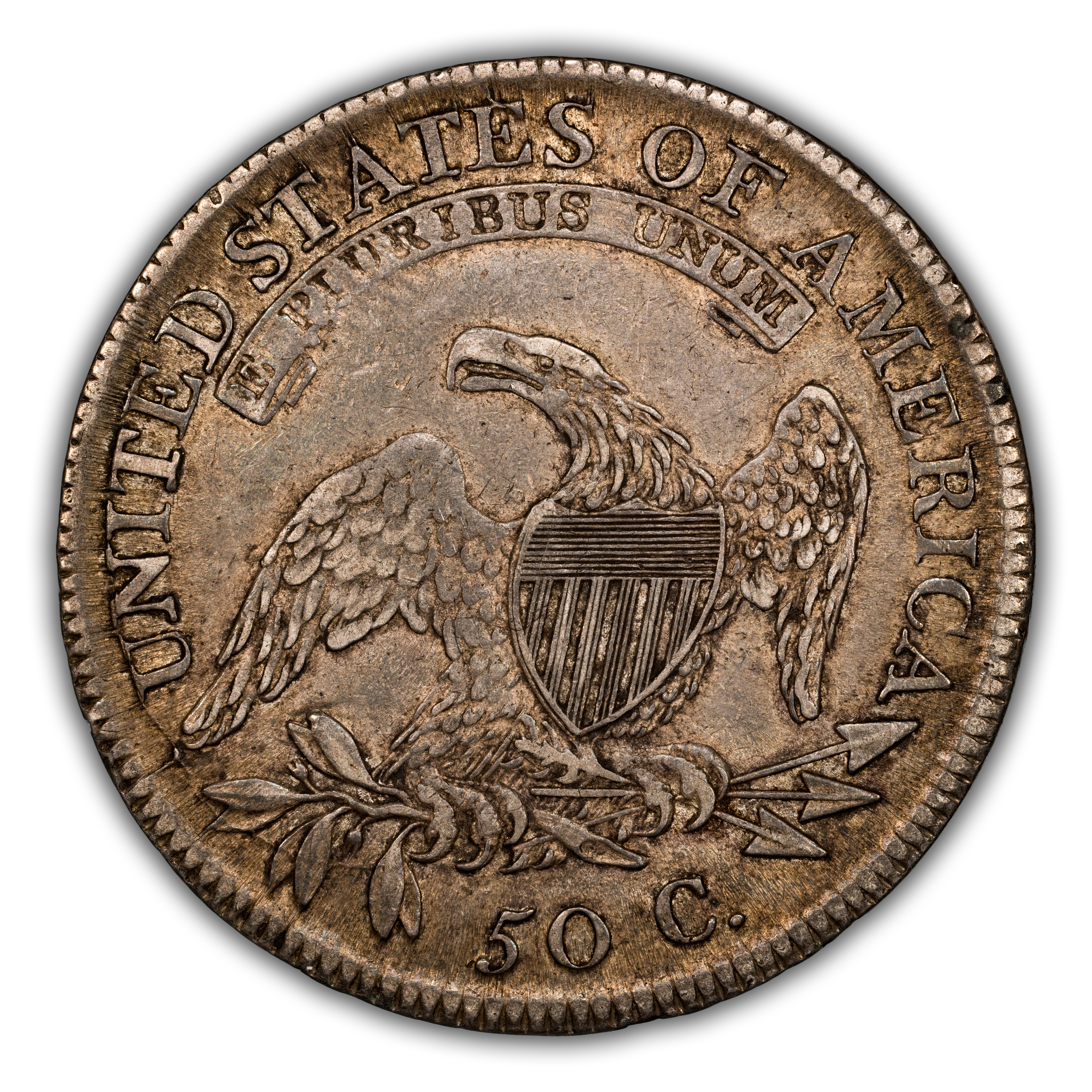 Reverse: An heraldic eagle holding olive branches and 3 arrows in its claws is surrounded by the words UNITED STATES OF AMERICA around the periphery. A ribbon below bears the motto E PLURIBUS UNUM. The denomination of 50C is centered below the eagle.