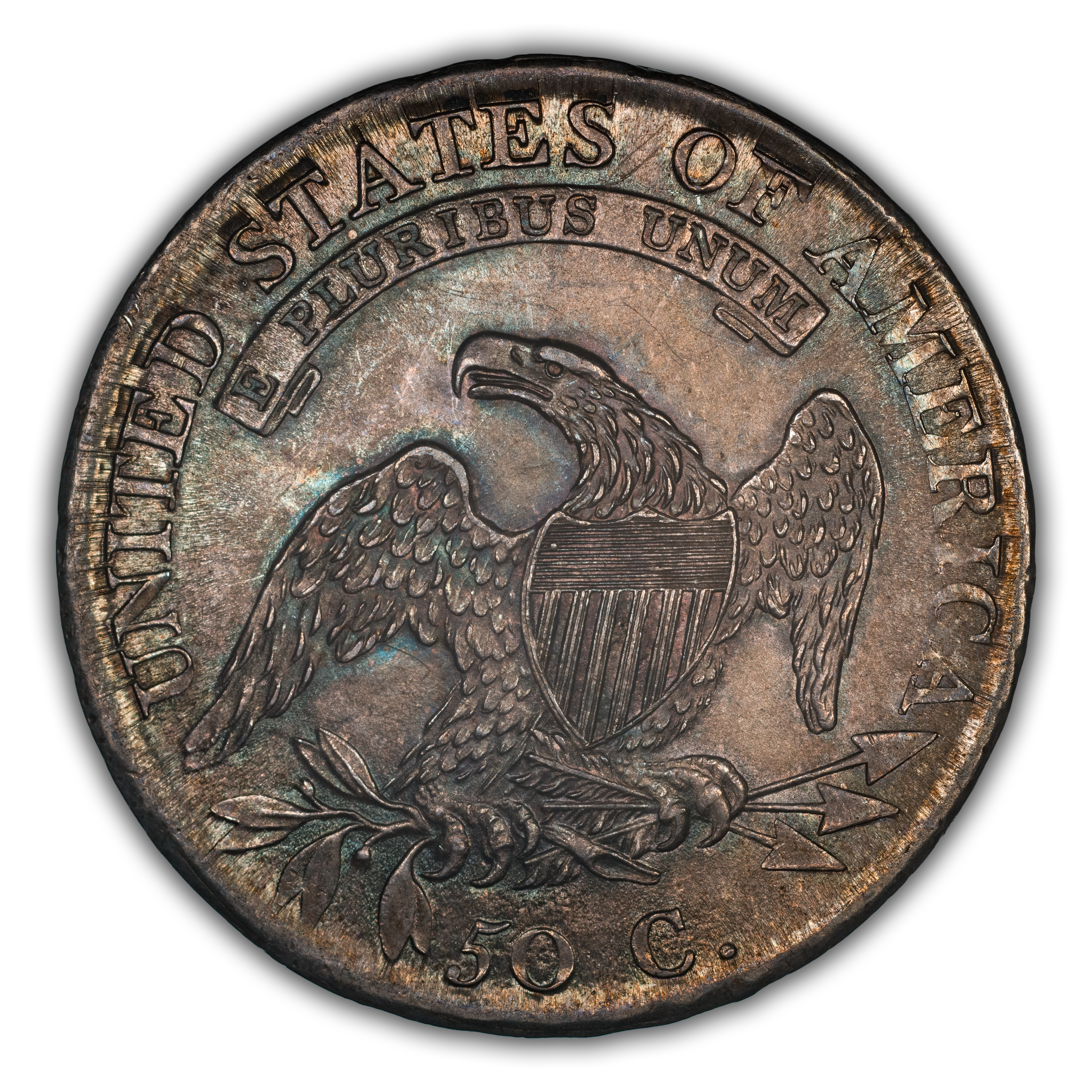Reverse: An heraldic eagle holding olive branches and 3 arrows in its claws is surrounded by the words UNITED STATES OF AMERICA around the periphery. A ribbon below bears the motto E PLURIBUS UNUM. The denomination of 50C is centered below the eagle.