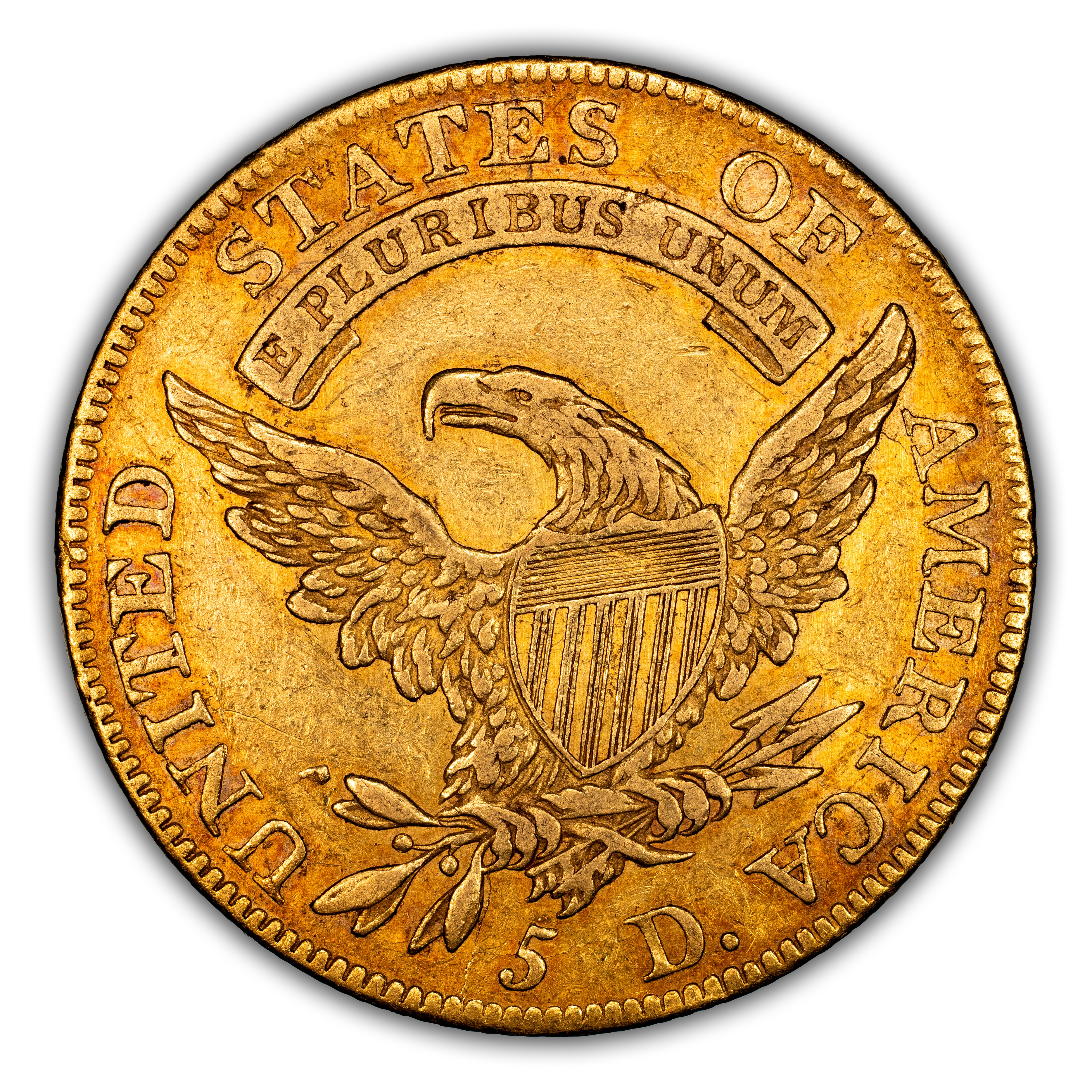 Reverse: An eagle with wings fully spread with a ribbon above its head bearing the motto E PLURIBUS UNUM. The words UNITED STATES OF AMERICA around the periphery with "5 D." at the bottom.