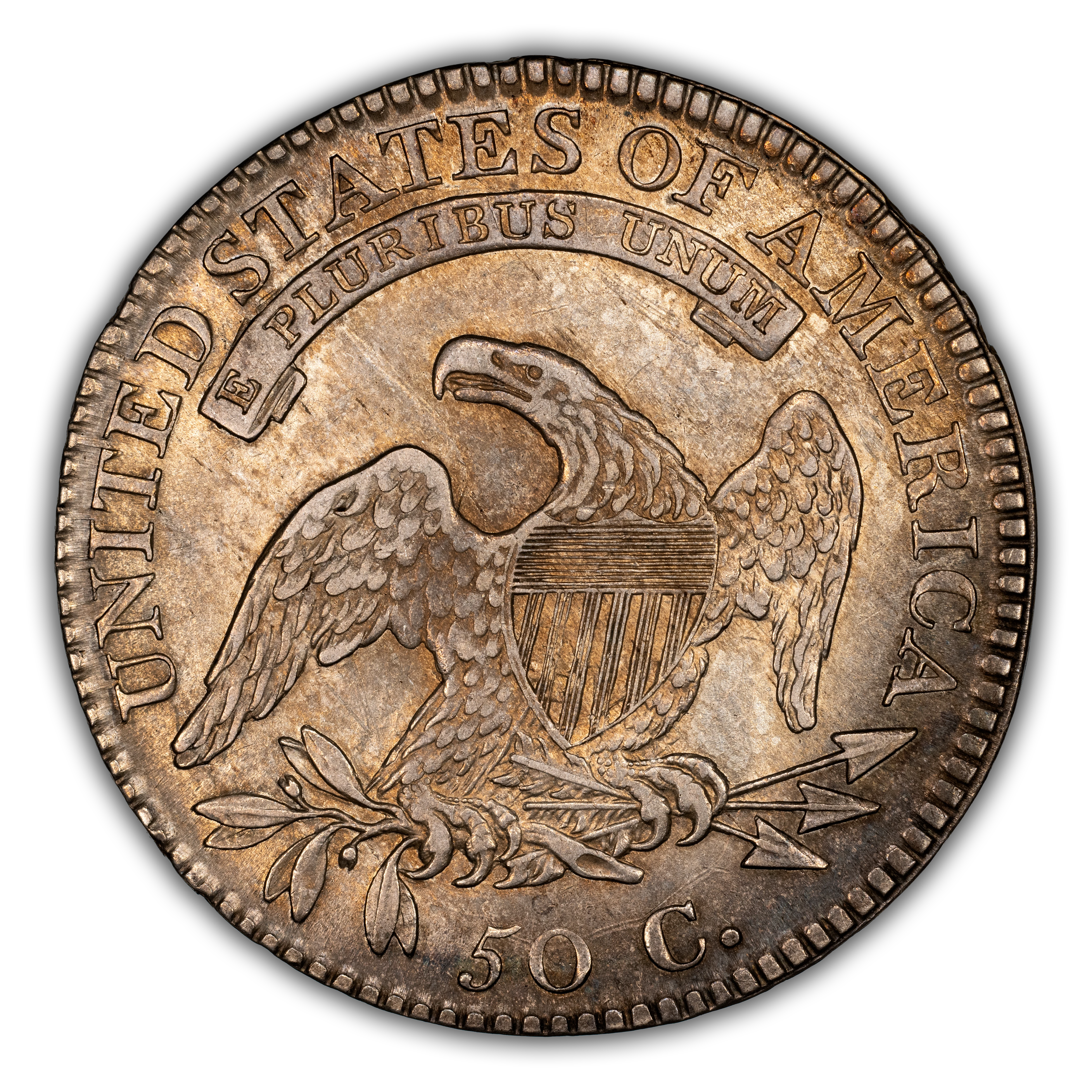 Reverse: An heraldic eagle holding olive branches and 3 arrows in its claws is surrounded by the words UNITED STATES OF AMERICA around the periphery. A ribbon below bears the motto E PLURIBUS UNUM. The denomination of 50C is centered below the eagle.
