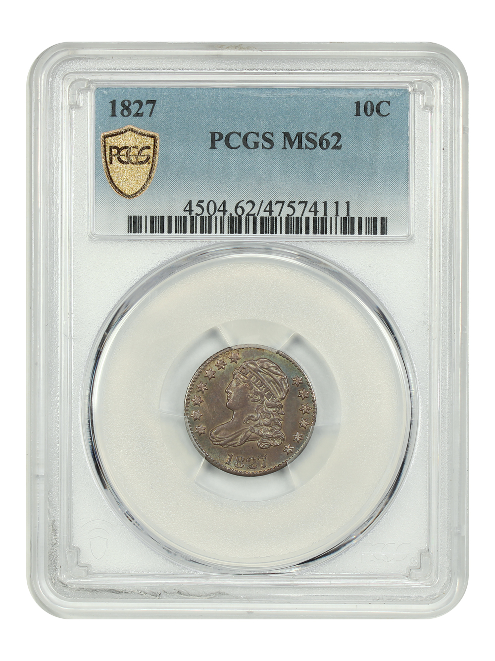 Capped Bust dimes, designed by John Reich, are generally more common than the Draped Bust issues. However, like their earlier counterparts they are challenging to locate in the better Mint States grades. The 1822 and 1829 Curl Base 2 are the rarest issues, with both regularly trading in the four-figure range.