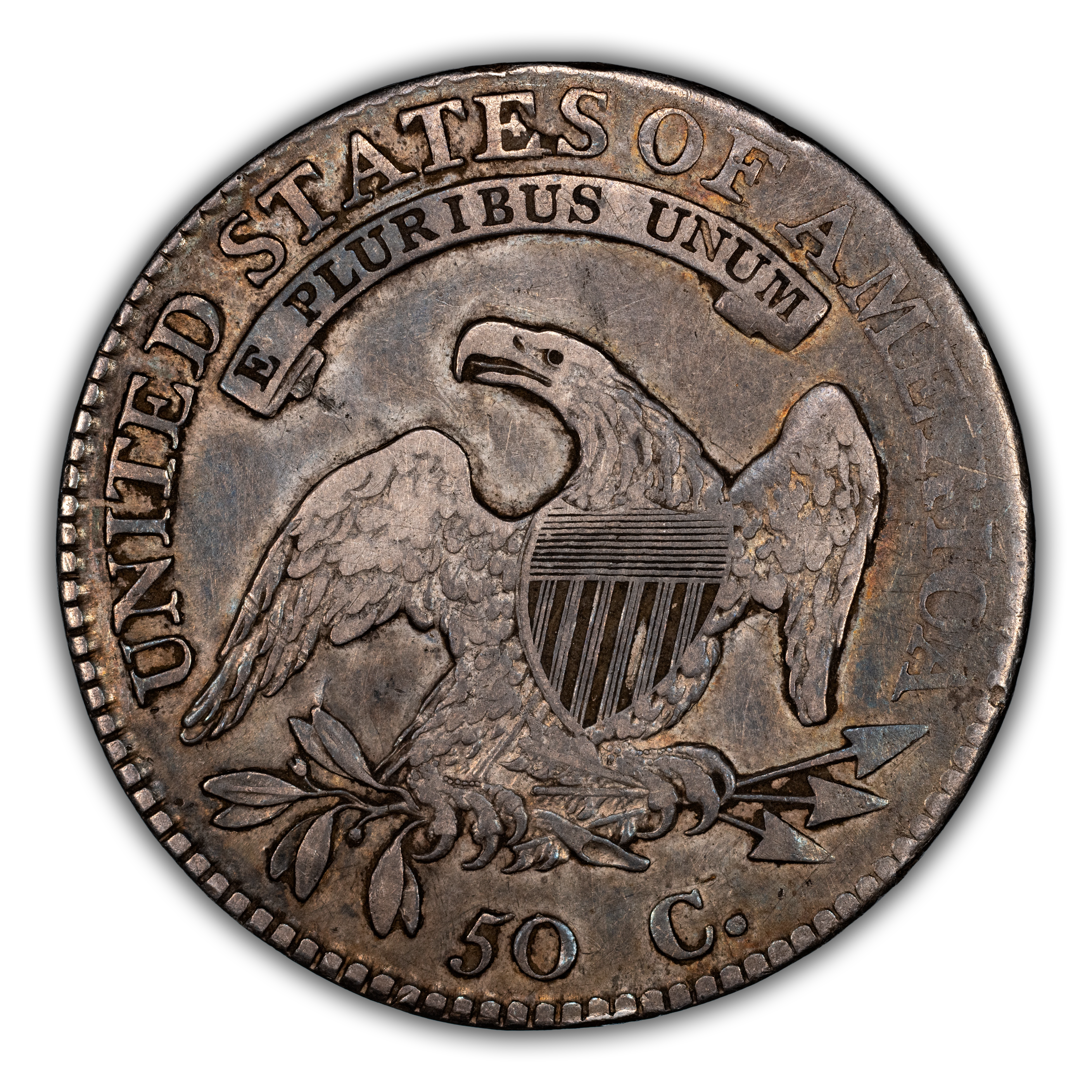 Reverse: An heraldic eagle holding olive branches and 3 arrows in its claws is surrounded by the words UNITED STATES OF AMERICA around the periphery. A ribbon below bears the motto E PLURIBUS UNUM. The denomination of 50C is centered below the eagle.