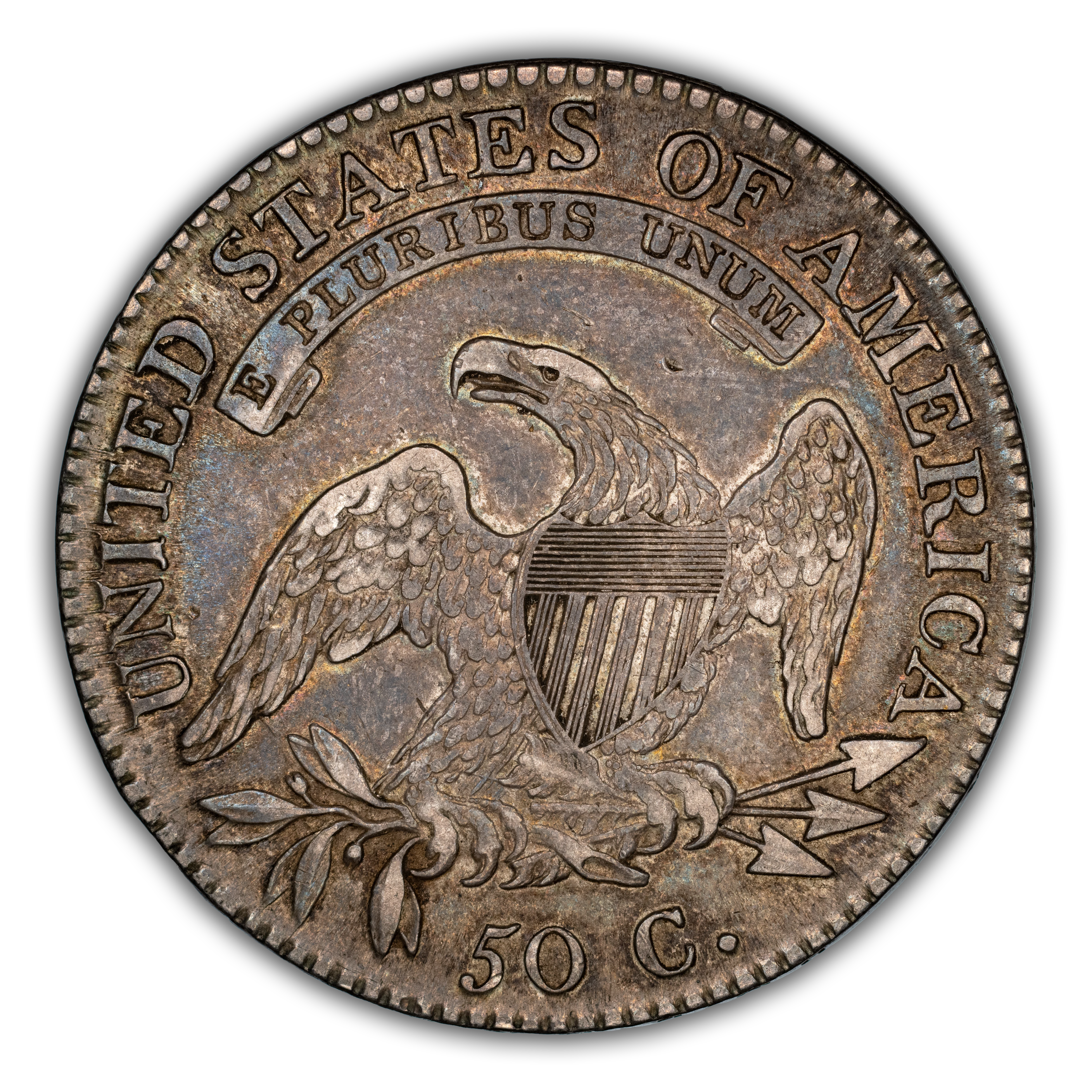 Reverse: An heraldic eagle holding olive branches and 3 arrows in its claws is surrounded by the words UNITED STATES OF AMERICA around the periphery. A ribbon below bears the motto E PLURIBUS UNUM. The denomination of 50C is centered below the eagle.