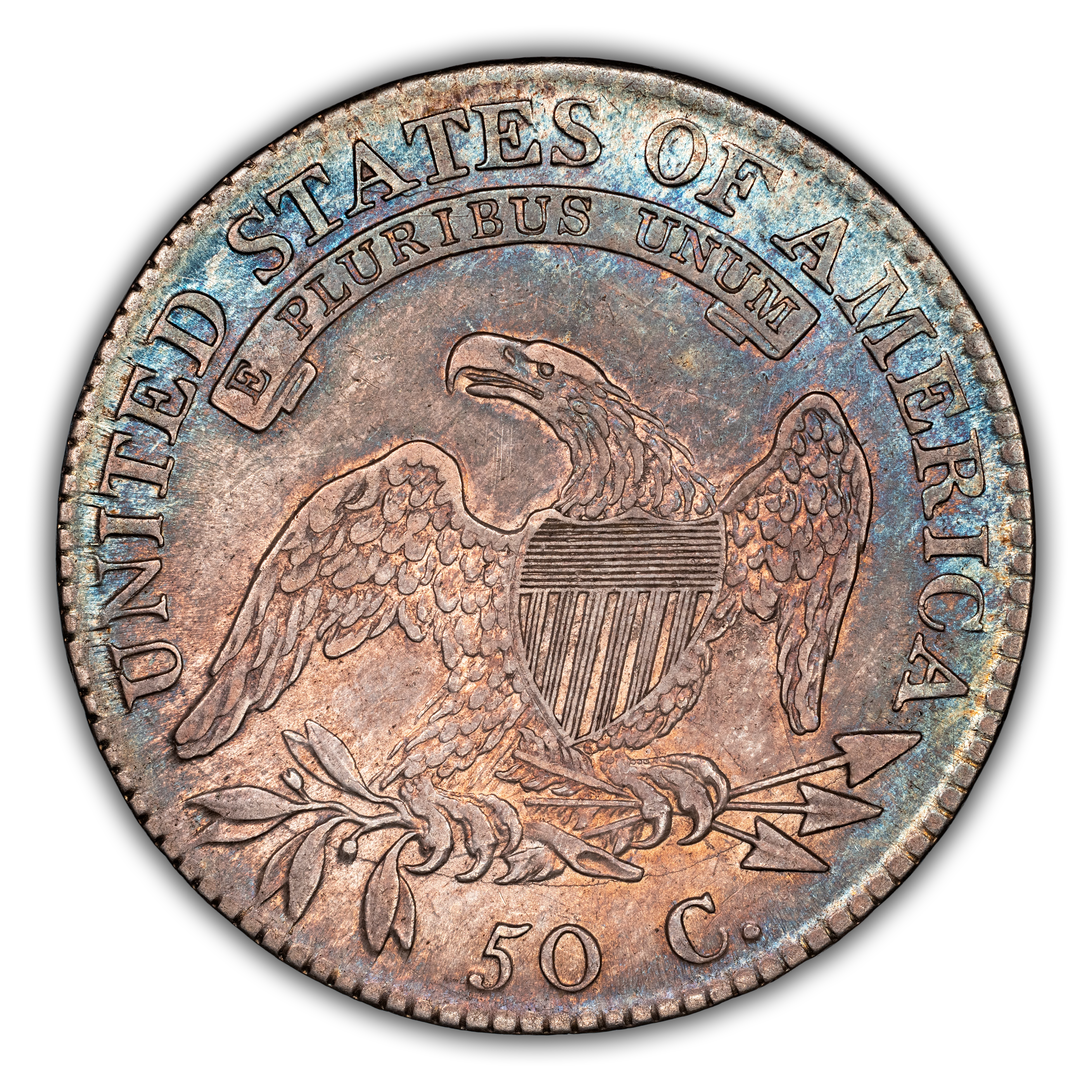 Reverse: An heraldic eagle holding olive branches and 3 arrows in its claws is surrounded by the words UNITED STATES OF AMERICA around the periphery. A ribbon below bears the motto E PLURIBUS UNUM. The denomination of 50C is centered below the eagle.