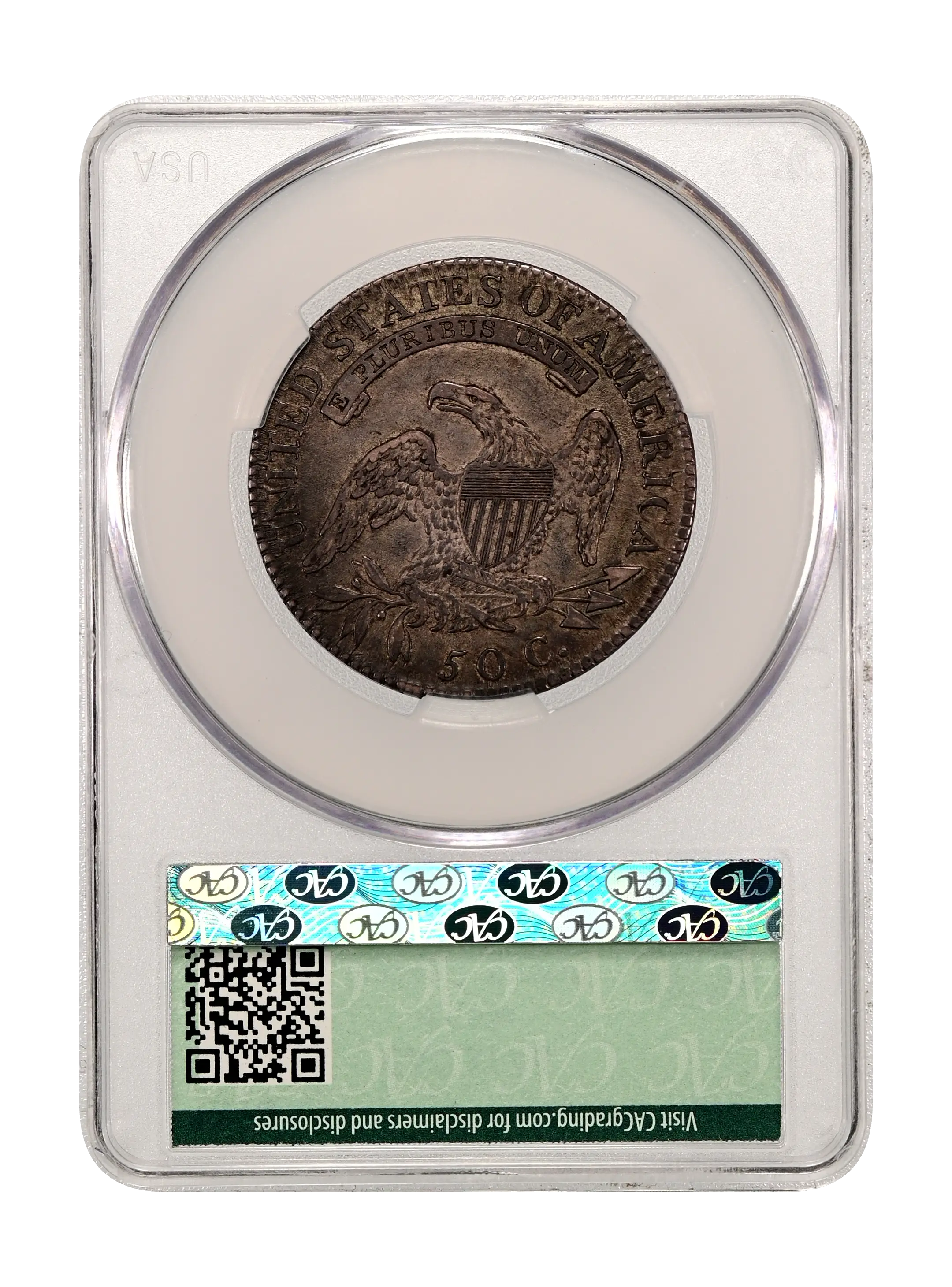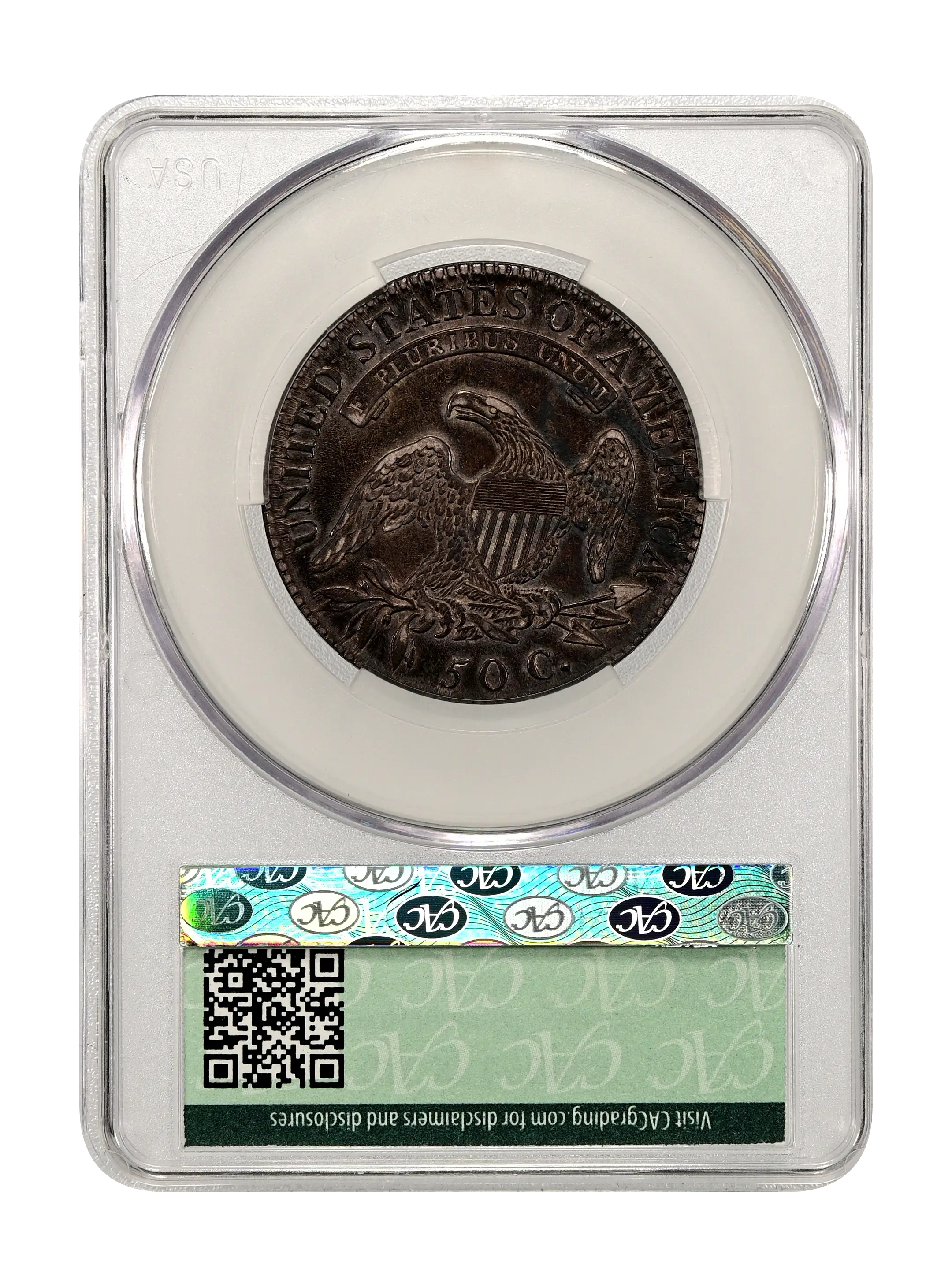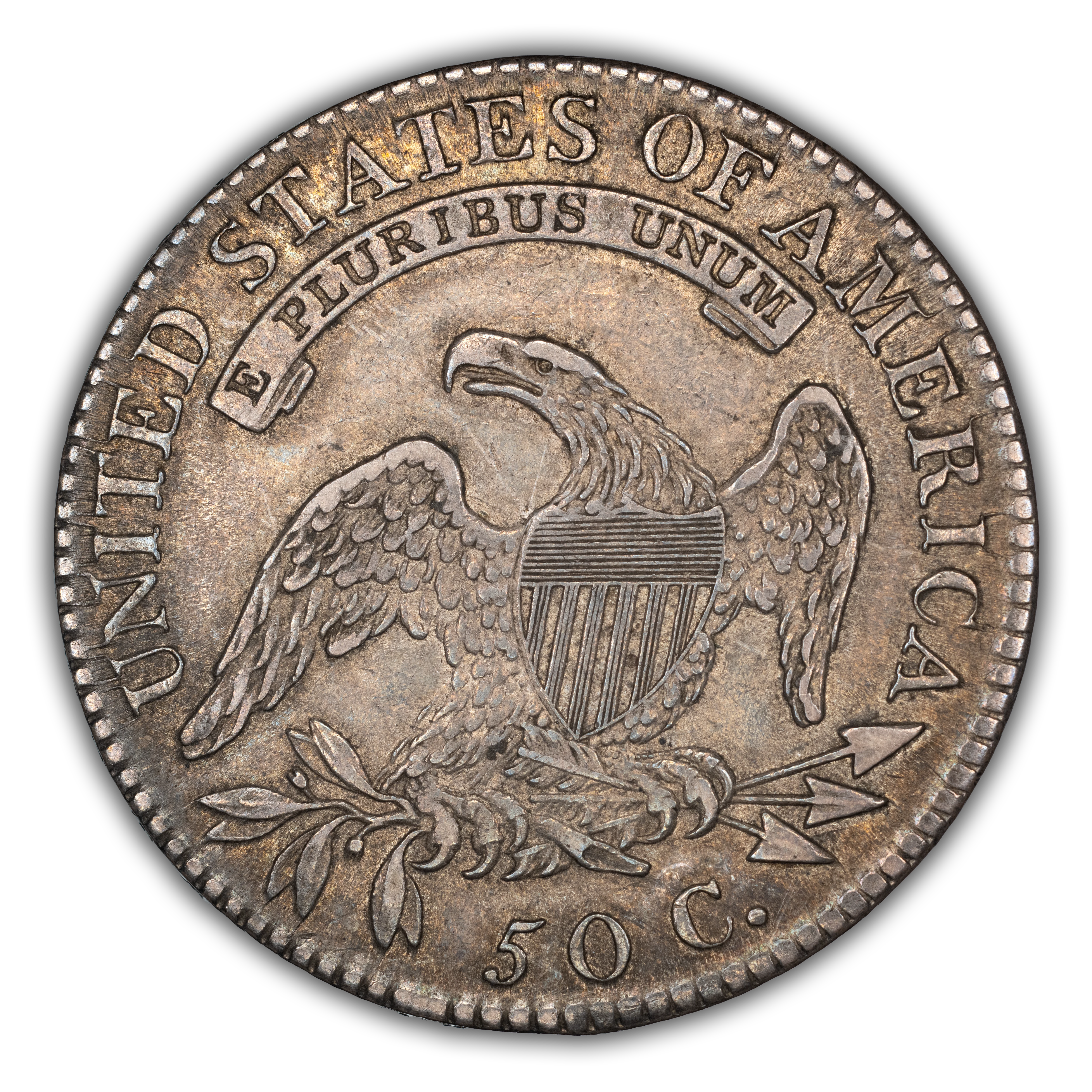Reverse: An heraldic eagle holding olive branches and 3 arrows in its claws is surrounded by the words UNITED STATES OF AMERICA around the periphery. A ribbon below bears the motto E PLURIBUS UNUM. The denomination of 50C is centered below the eagle.