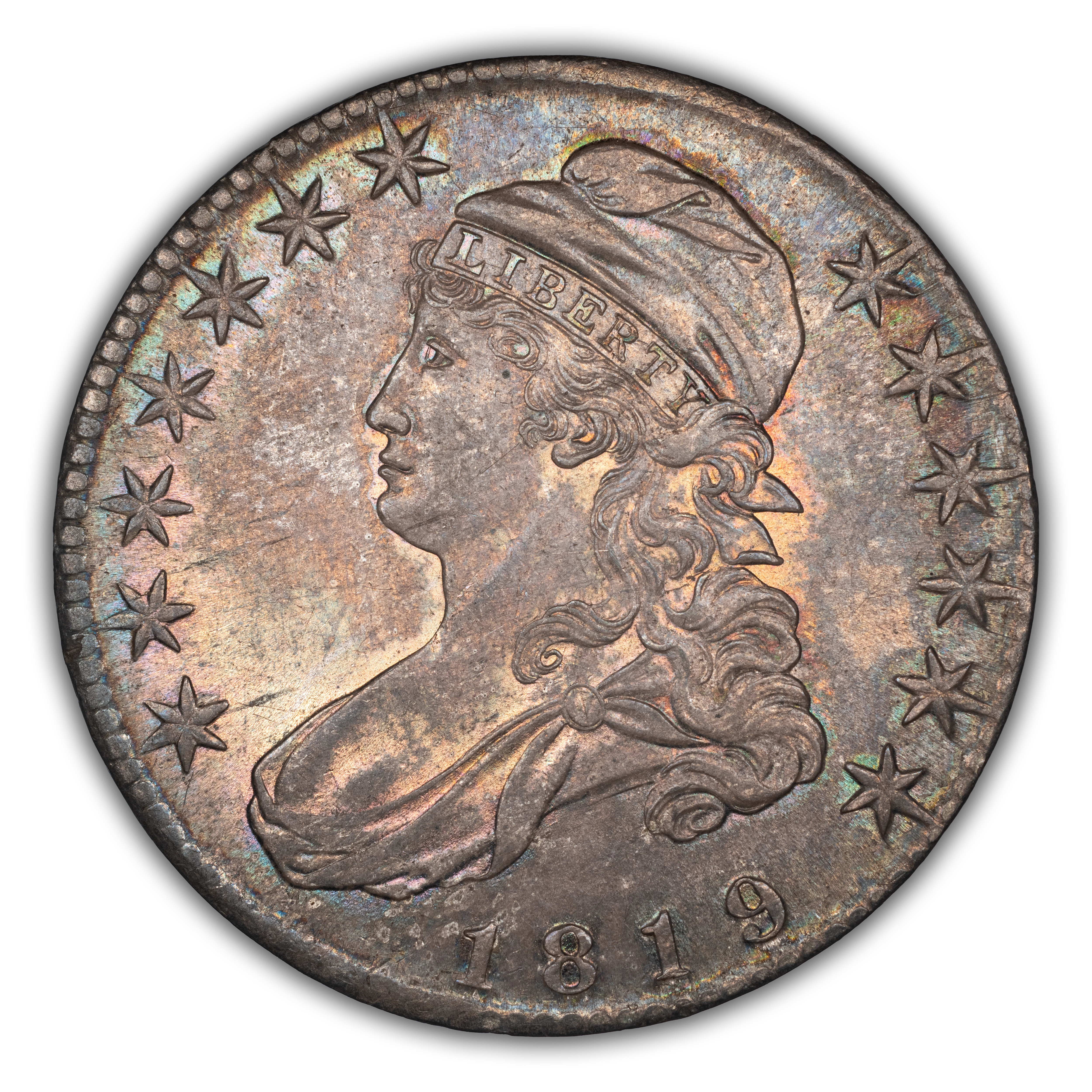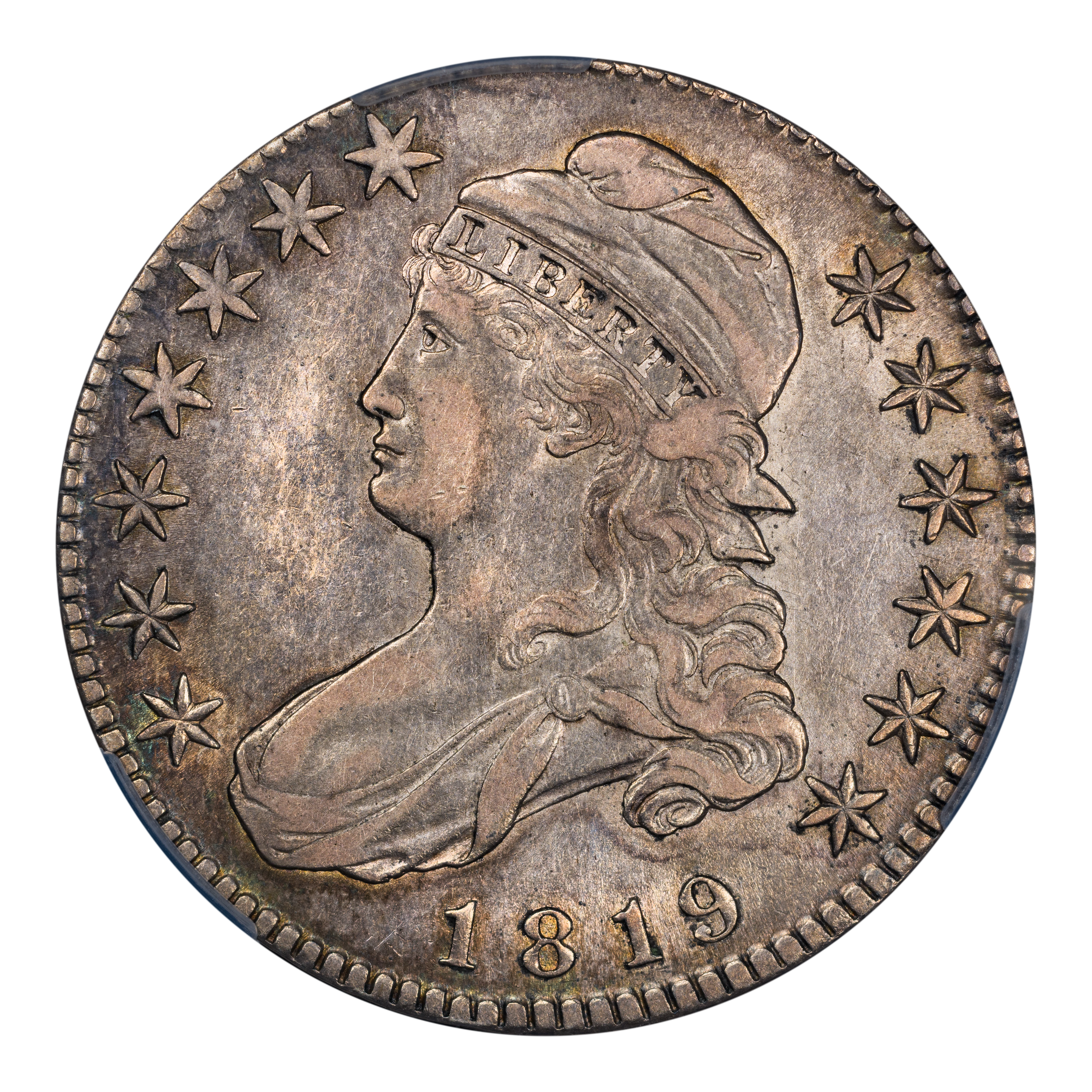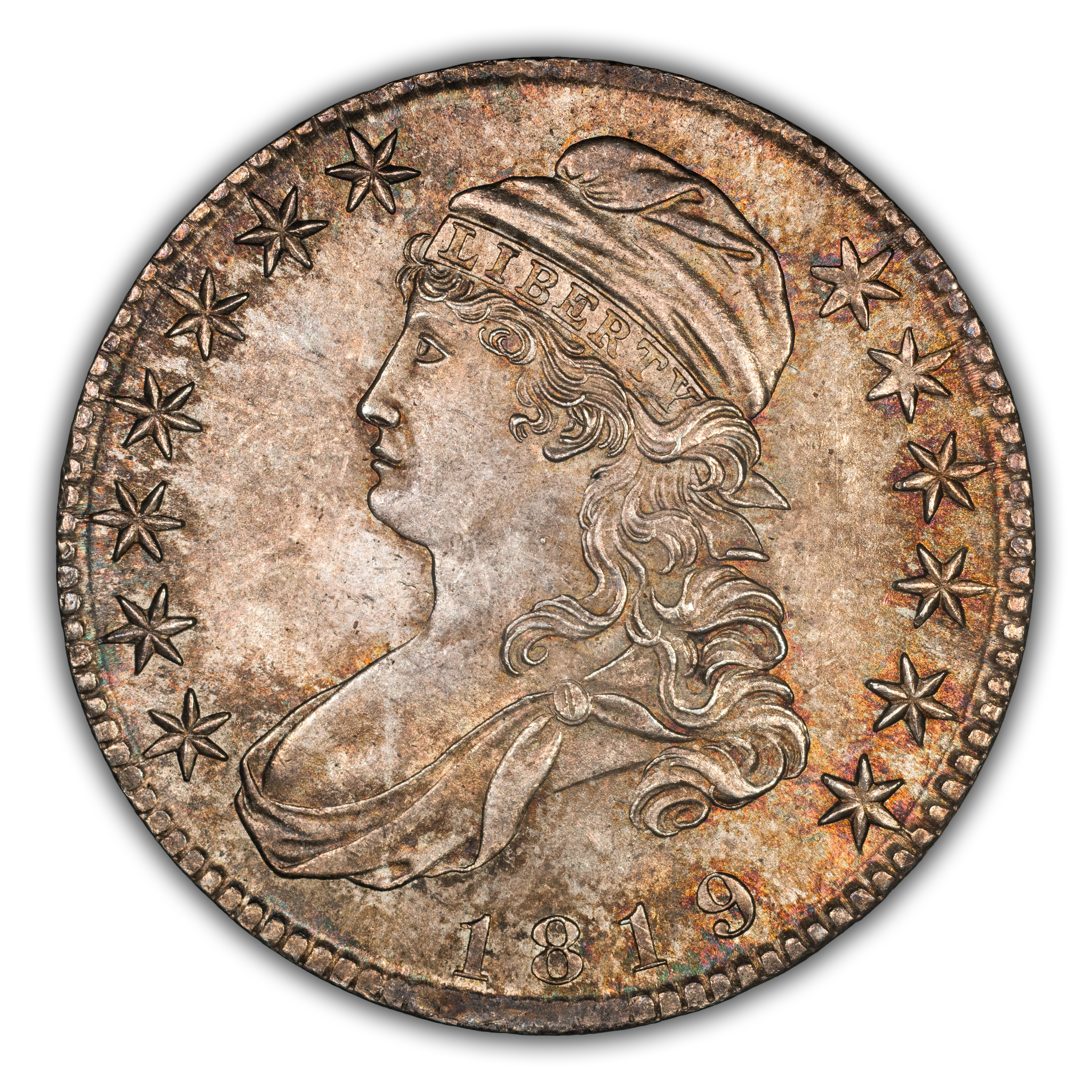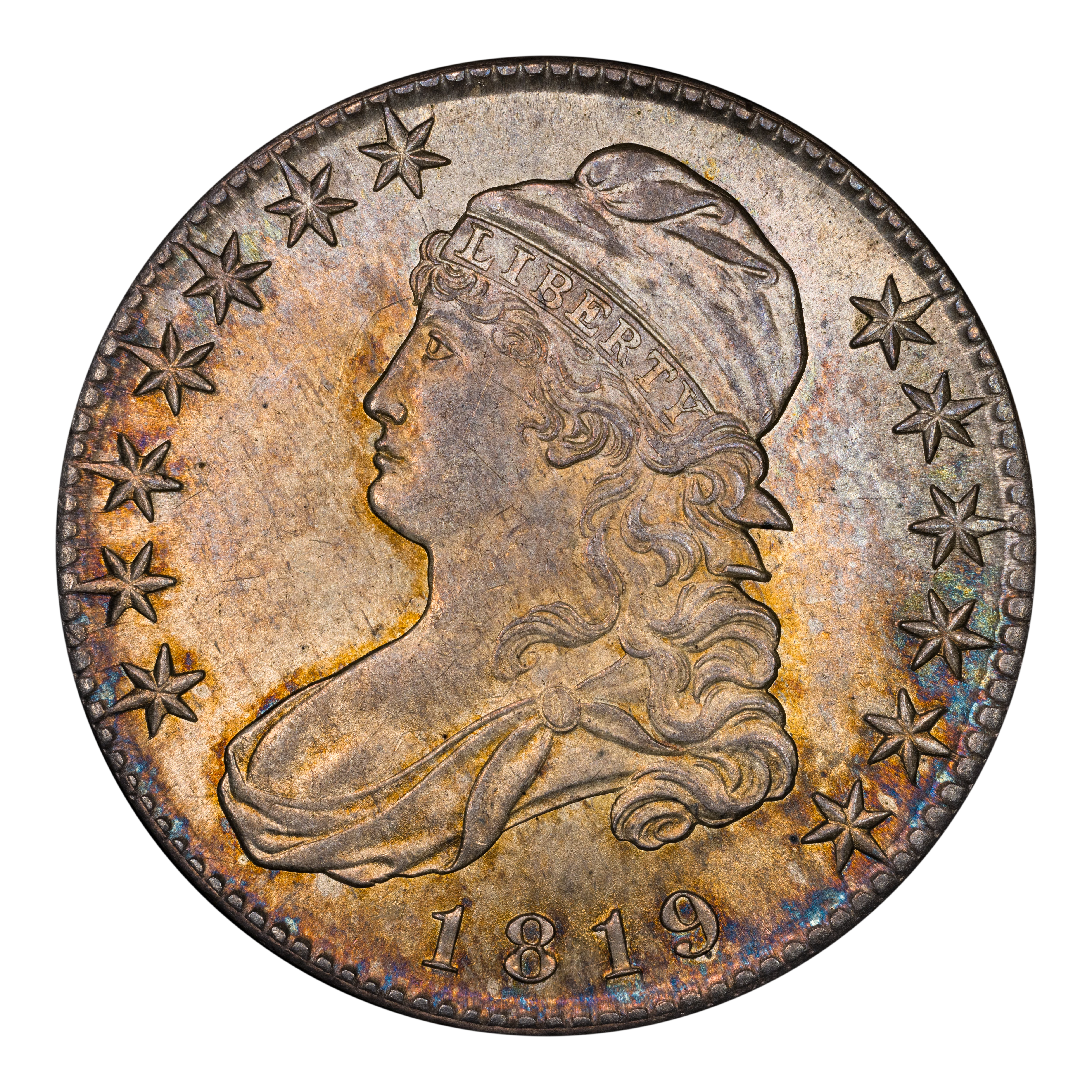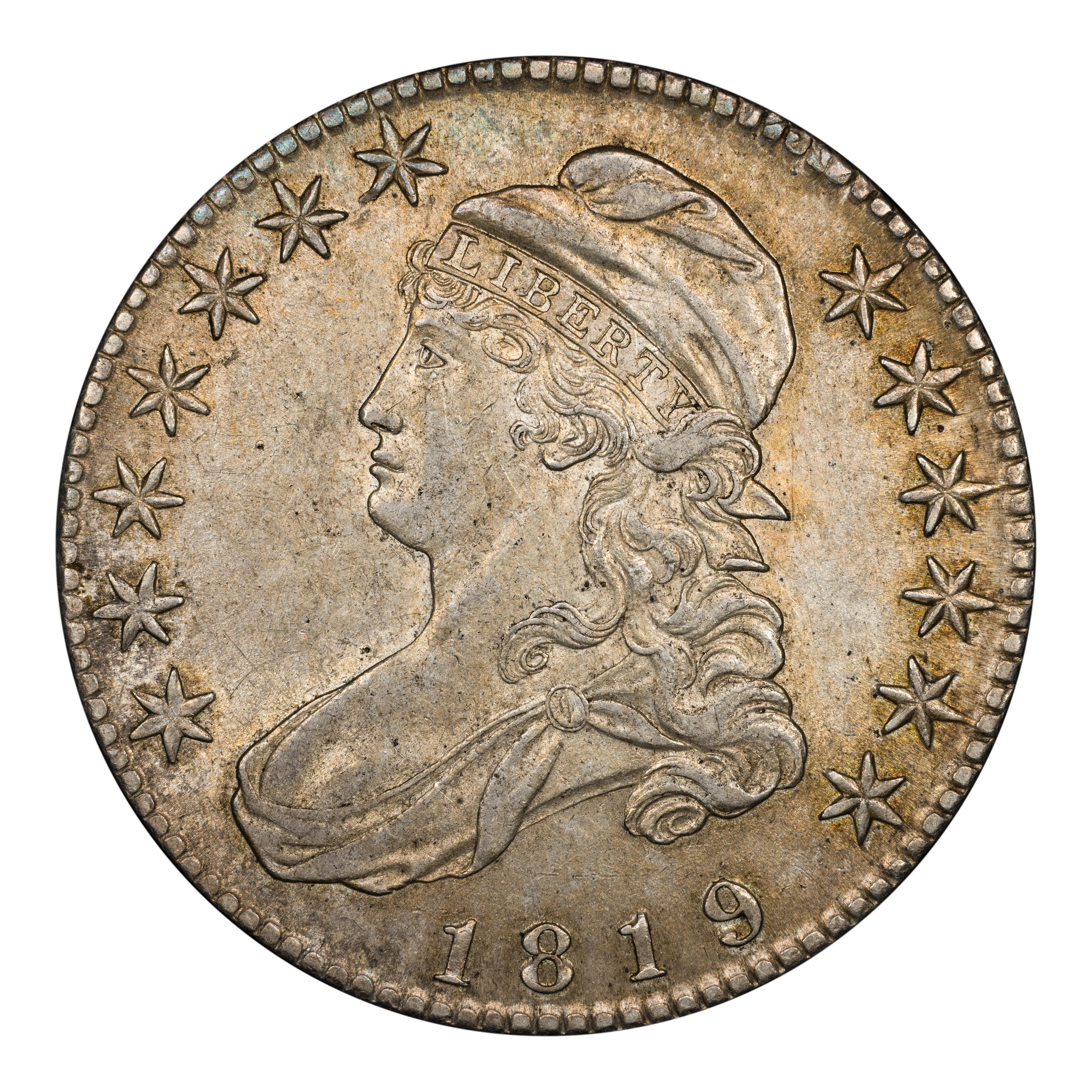 Reverse: An heraldic eagle holding olive branches and 3 arrows in its claws is surrounded by the words UNITED STATES OF AMERICA around the periphery. A ribbon below bears the motto E PLURIBUS UNUM. The denomination of 50C is centered below the eagle.