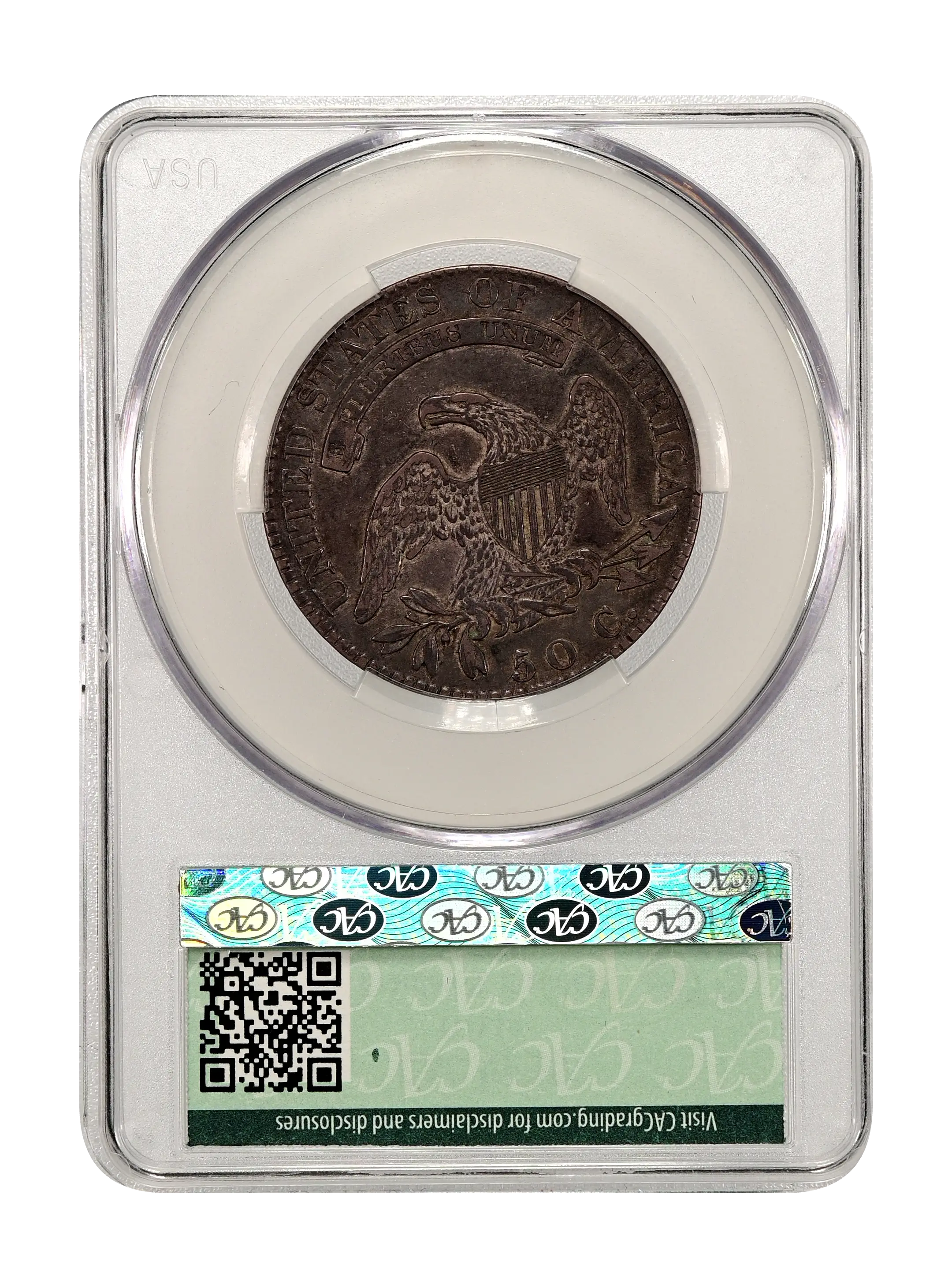 Reverse: An heraldic eagle holding olive branches and 3 arrows in its claws is surrounded by the words UNITED STATES OF AMERICA around the periphery. A ribbon below bears the motto E PLURIBUS UNUM. The denomination of 50C is centered below the eagle.