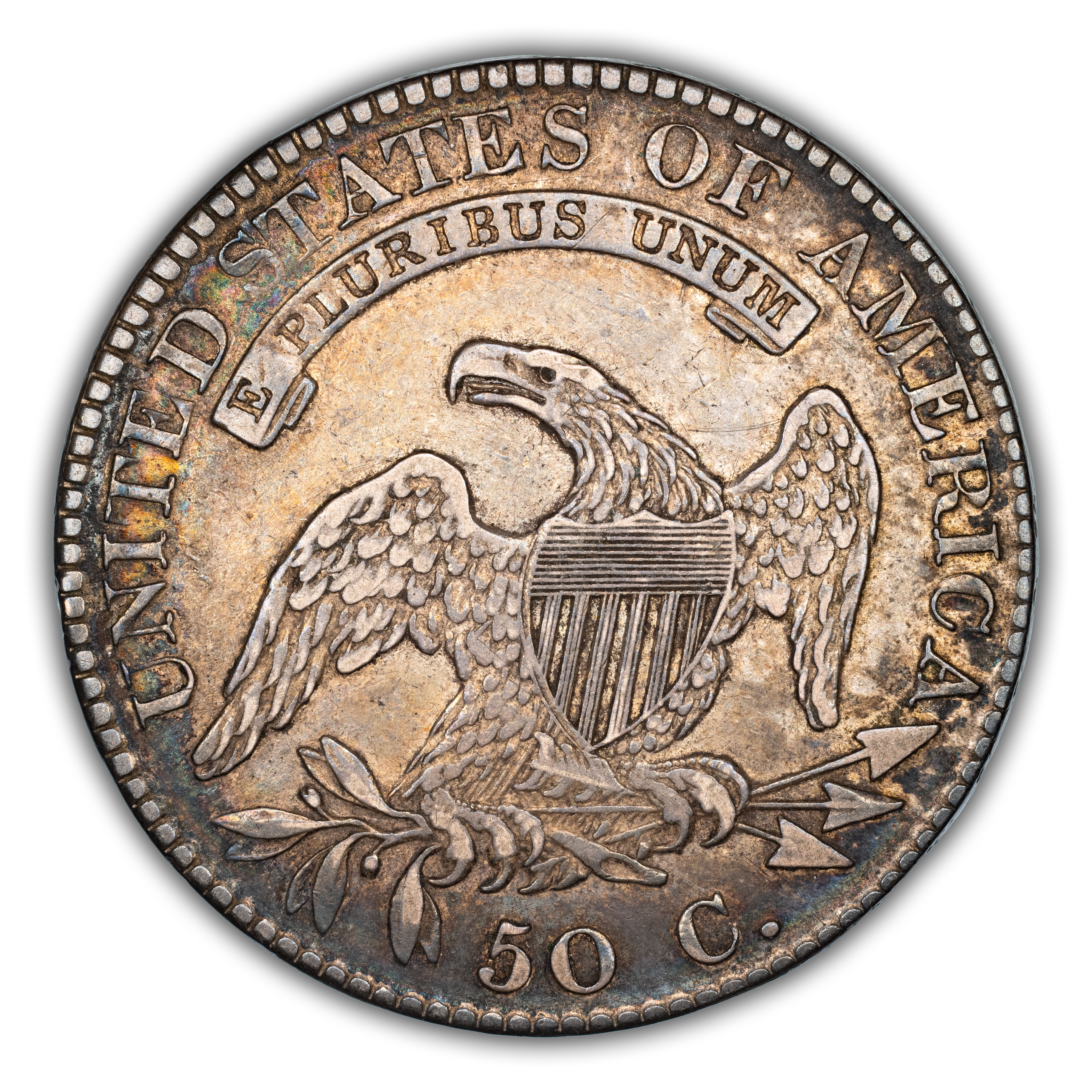 Reverse: An heraldic eagle holding olive branches and 3 arrows in its claws is surrounded by the words UNITED STATES OF AMERICA around the periphery. A ribbon below bears the motto E PLURIBUS UNUM. The denomination of 50C is centered below the eagle.