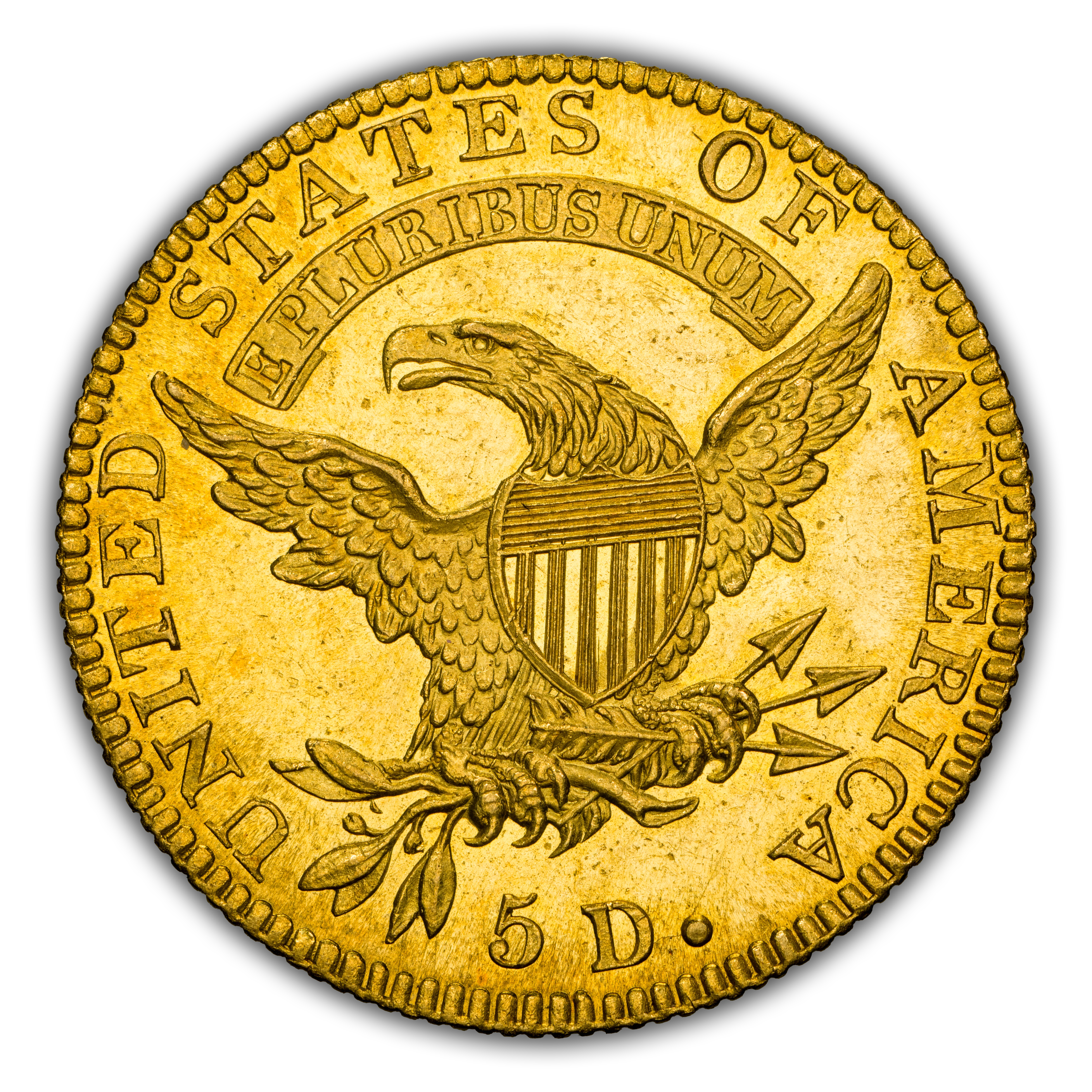 Reverse: An eagle with wings fully spread with a ribbon above its head bearing the motto E PLURIBUS UNUM. The words UNITED STATES OF AMERICA around the periphery with "5 D." at the bottom.