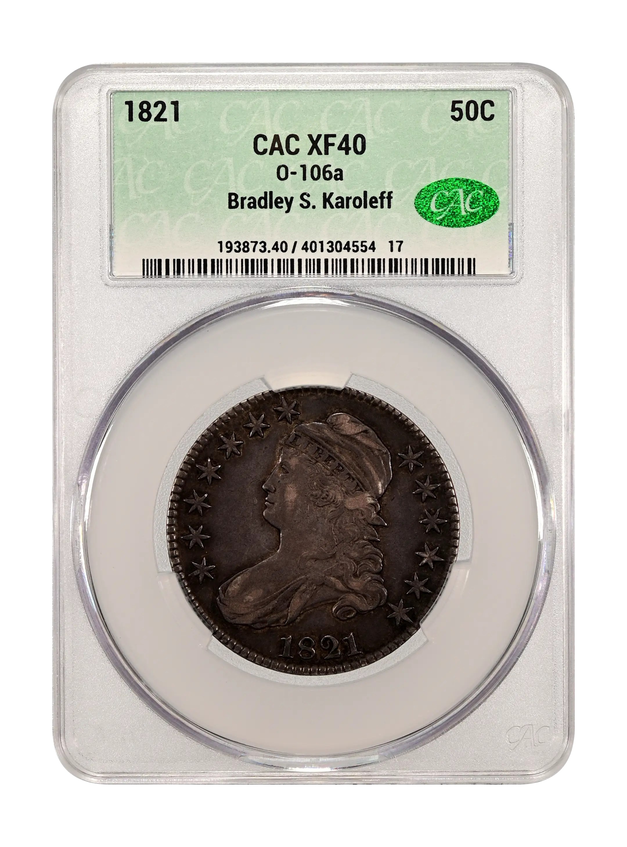 1821 50C O-106a, R.2, XF45 PCGS. PCGS Population (1/2). NGC Census: (0/7). Mintage: 1,305,797. ...