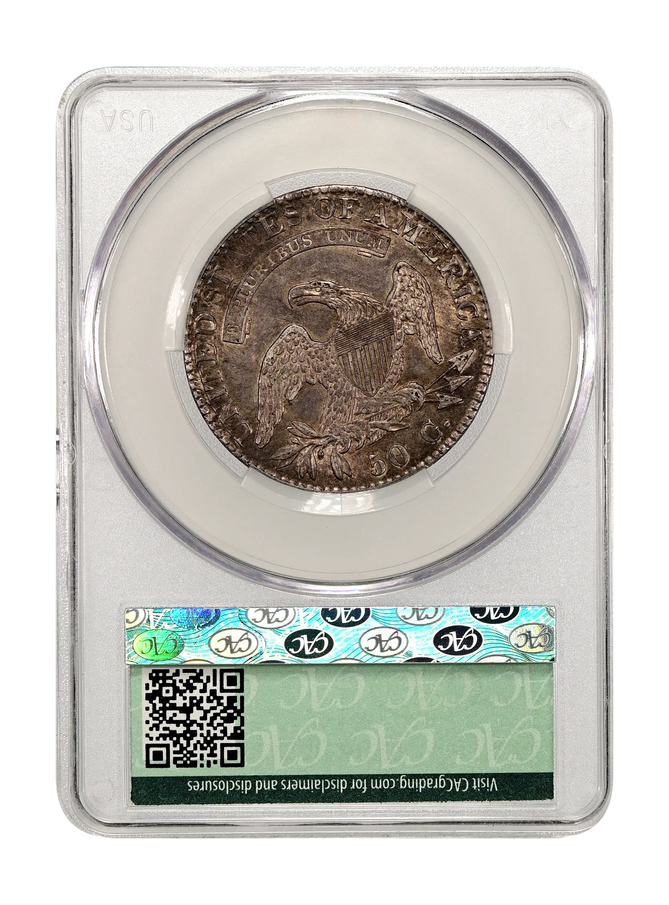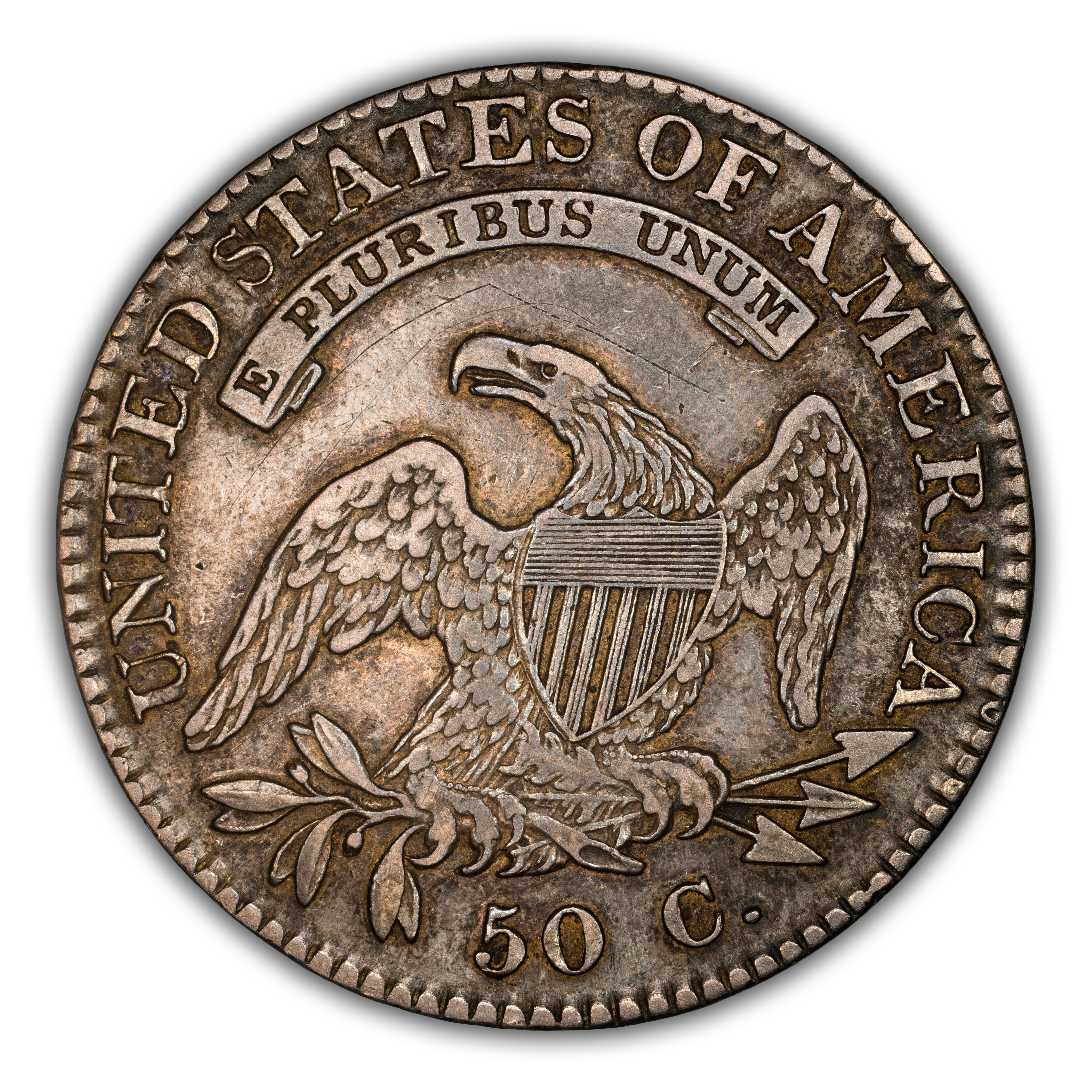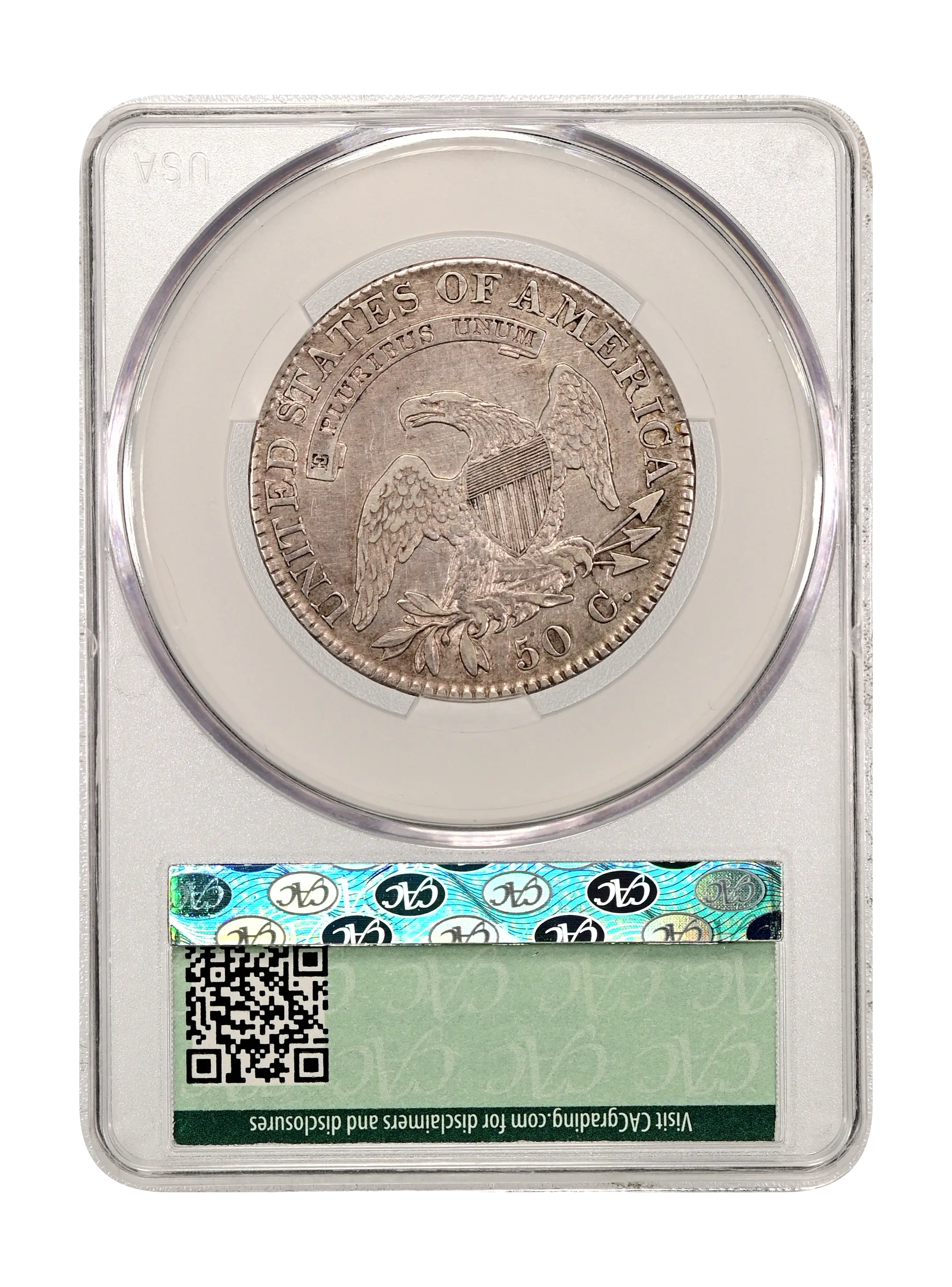 Reverse: An heraldic eagle holding olive branches and 3 arrows in its claws is surrounded by the words UNITED STATES OF AMERICA around the periphery. A ribbon below bears the motto E PLURIBUS UNUM. The denomination of 50C is centered below the eagle.