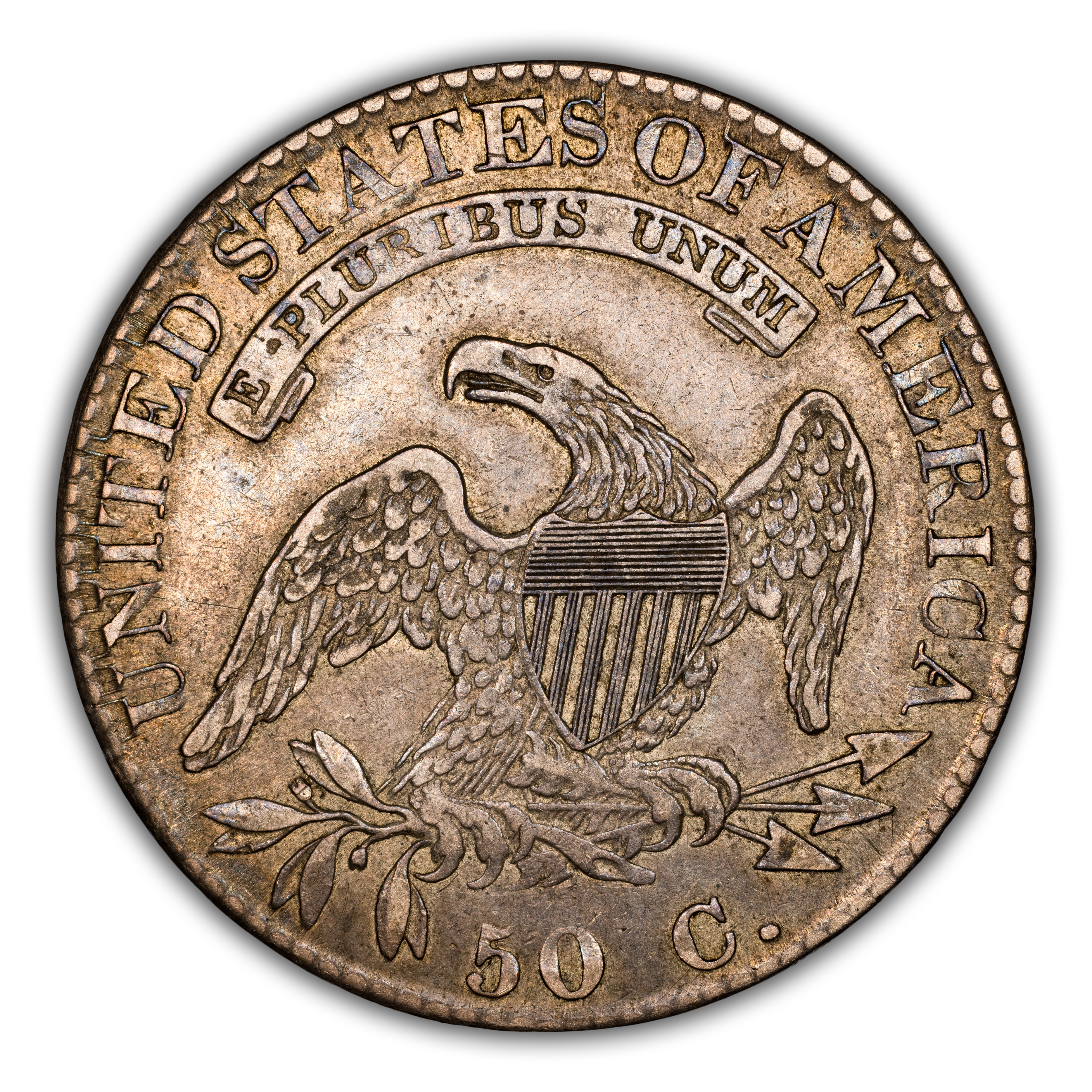 Reverse: An heraldic eagle holding olive branches and 3 arrows in its claws is surrounded by the words UNITED STATES OF AMERICA around the periphery. A ribbon below bears the motto E PLURIBUS UNUM. The denomination of 50C is centered below the eagle.