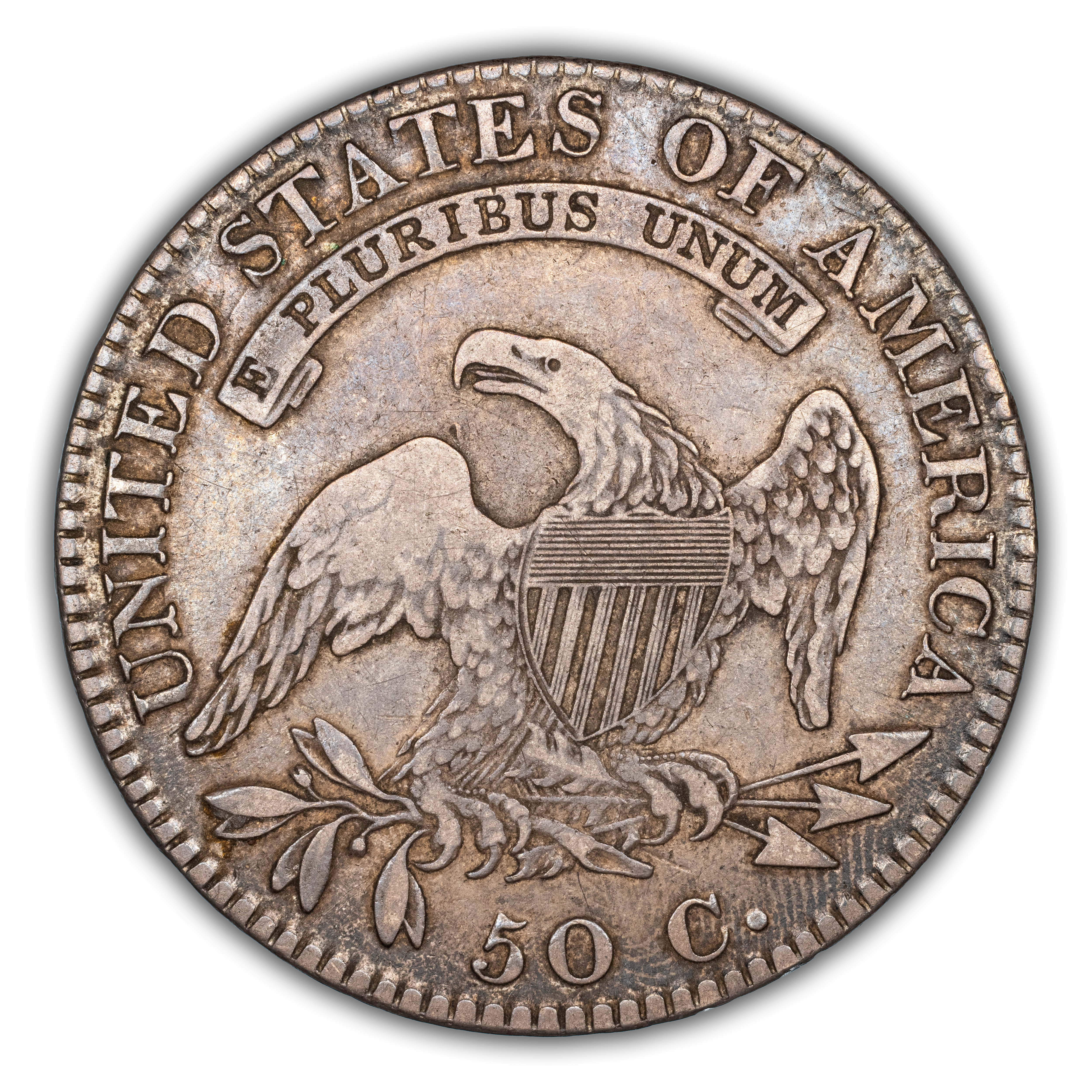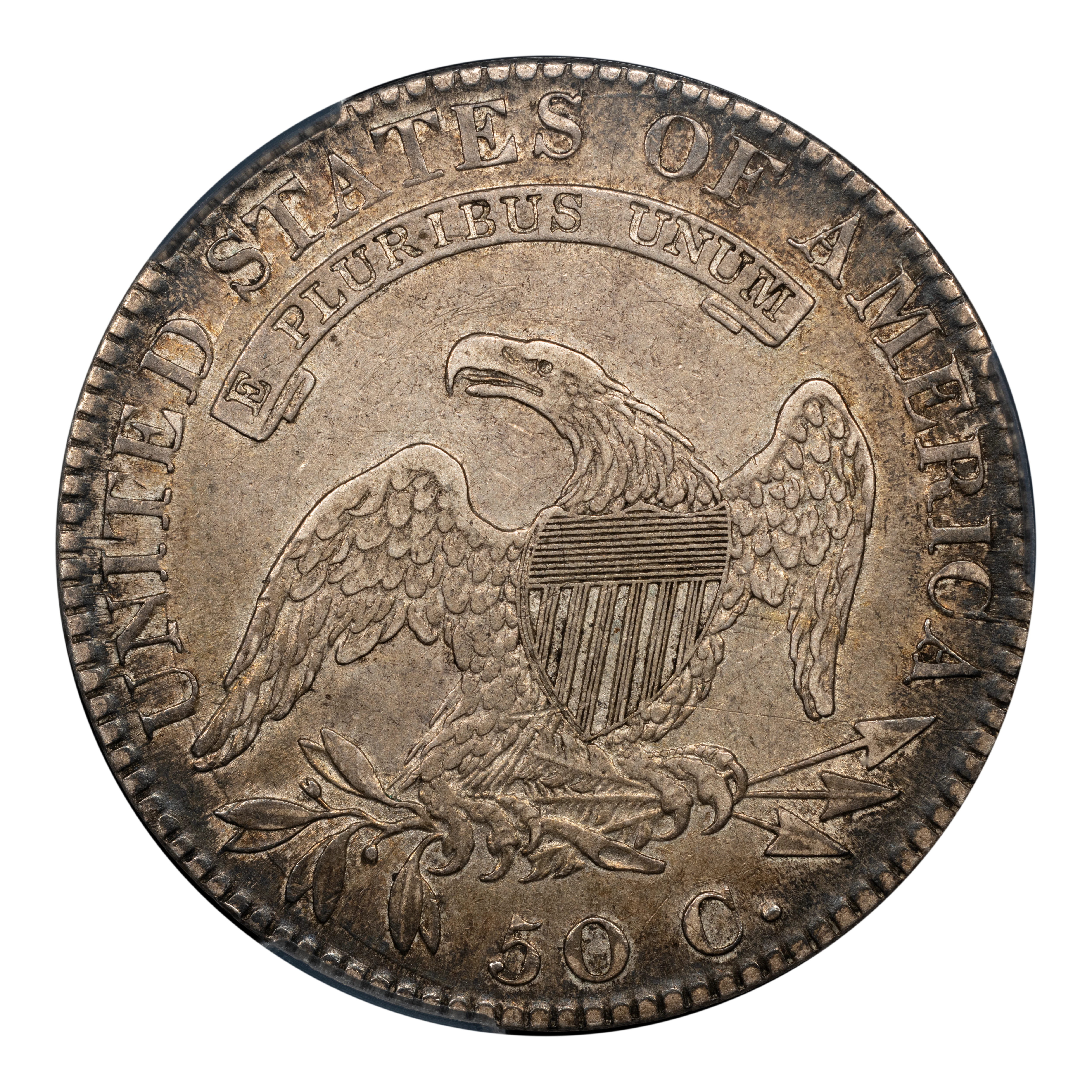 Reverse: An heraldic eagle holding olive branches and 3 arrows in its claws is surrounded by the words UNITED STATES OF AMERICA around the periphery. A ribbon below bears the motto E PLURIBUS UNUM. The denomination of 50C is centered below the eagle.