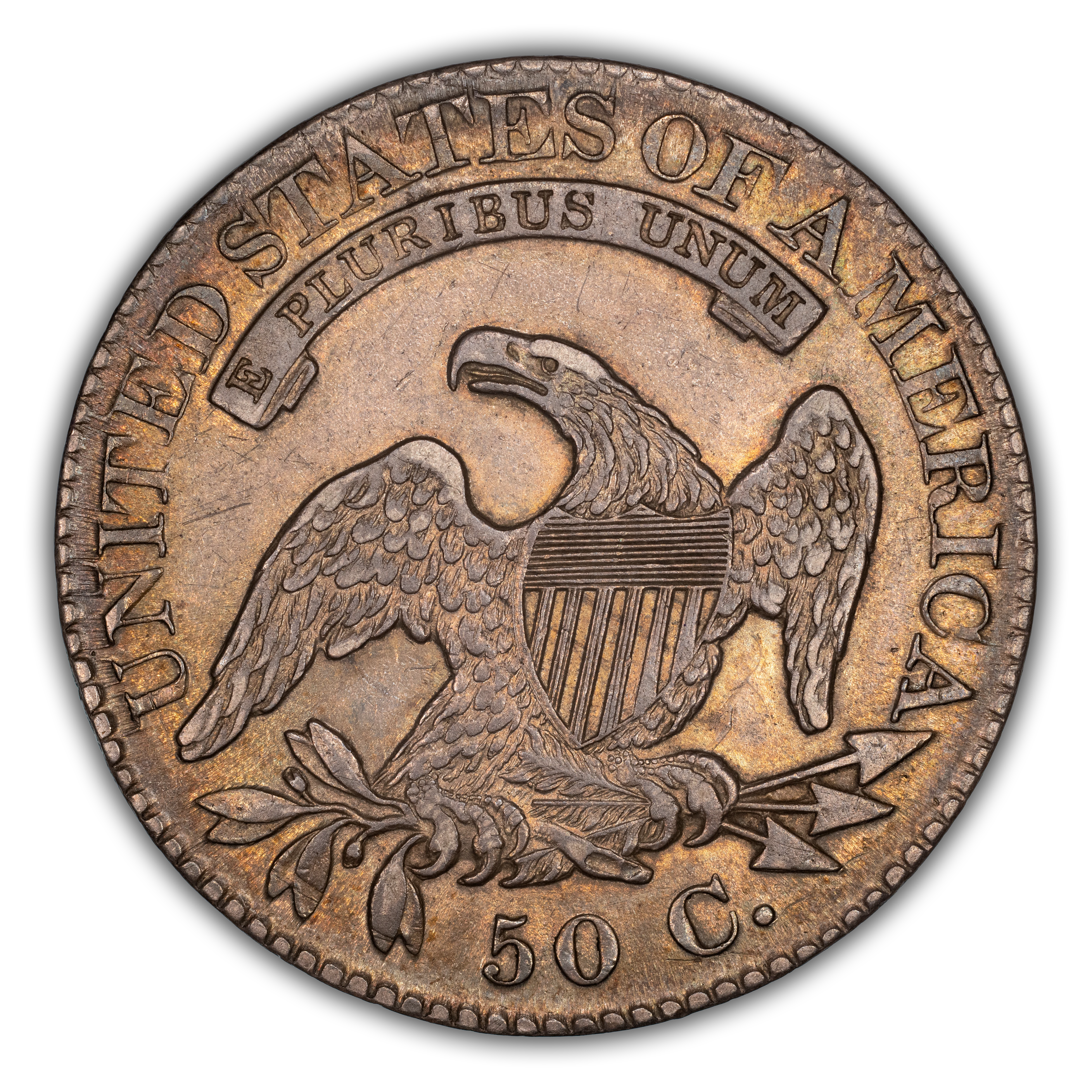 Reverse: An heraldic eagle holding olive branches and 3 arrows in its claws is surrounded by the words UNITED STATES OF AMERICA around the periphery. A ribbon below bears the motto E PLURIBUS UNUM. The denomination of 50C is centered below the eagle.