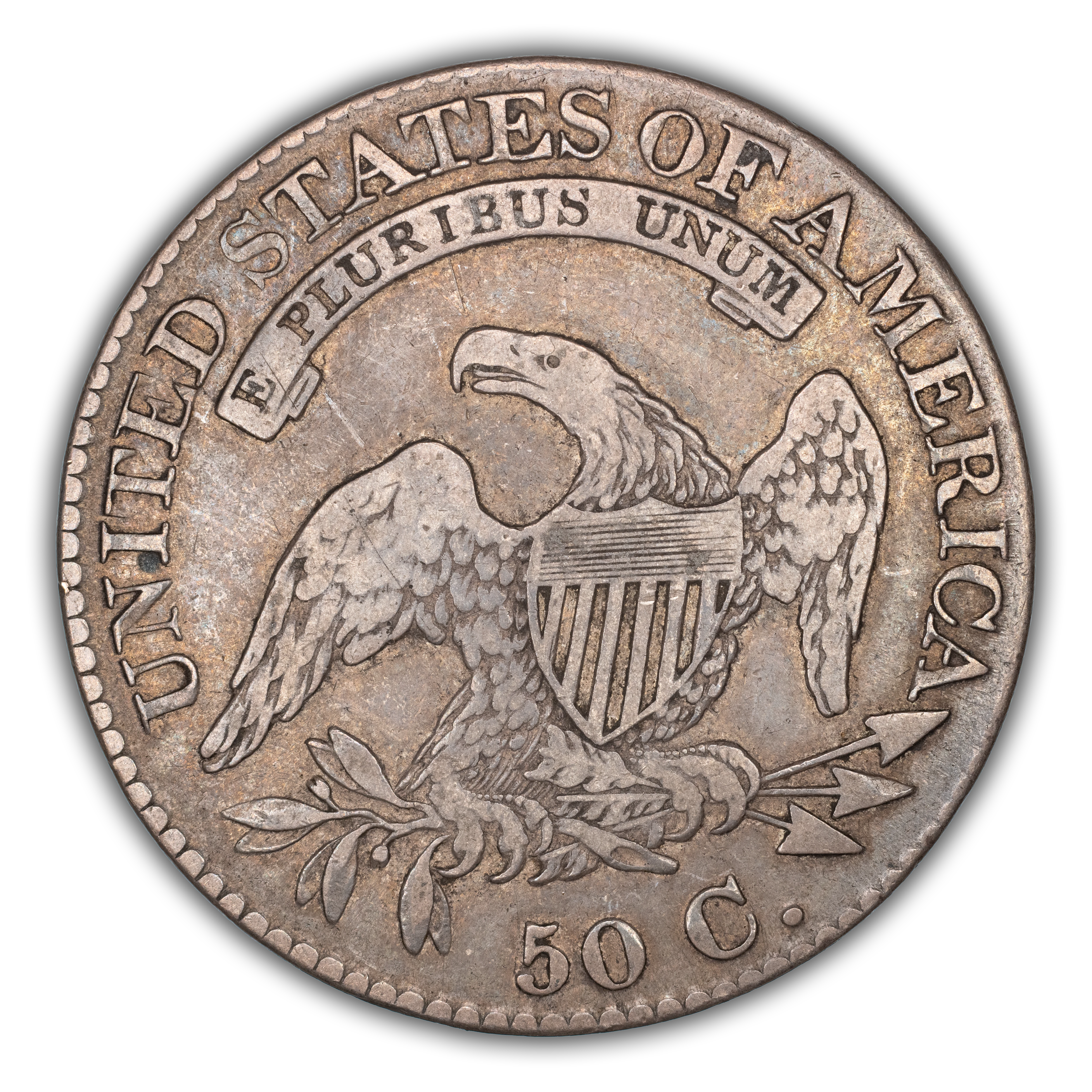 Reverse: An heraldic eagle holding olive branches and 3 arrows in its claws is surrounded by the words UNITED STATES OF AMERICA around the periphery. A ribbon below bears the motto E PLURIBUS UNUM. The denomination of 50C is centered below the eagle.