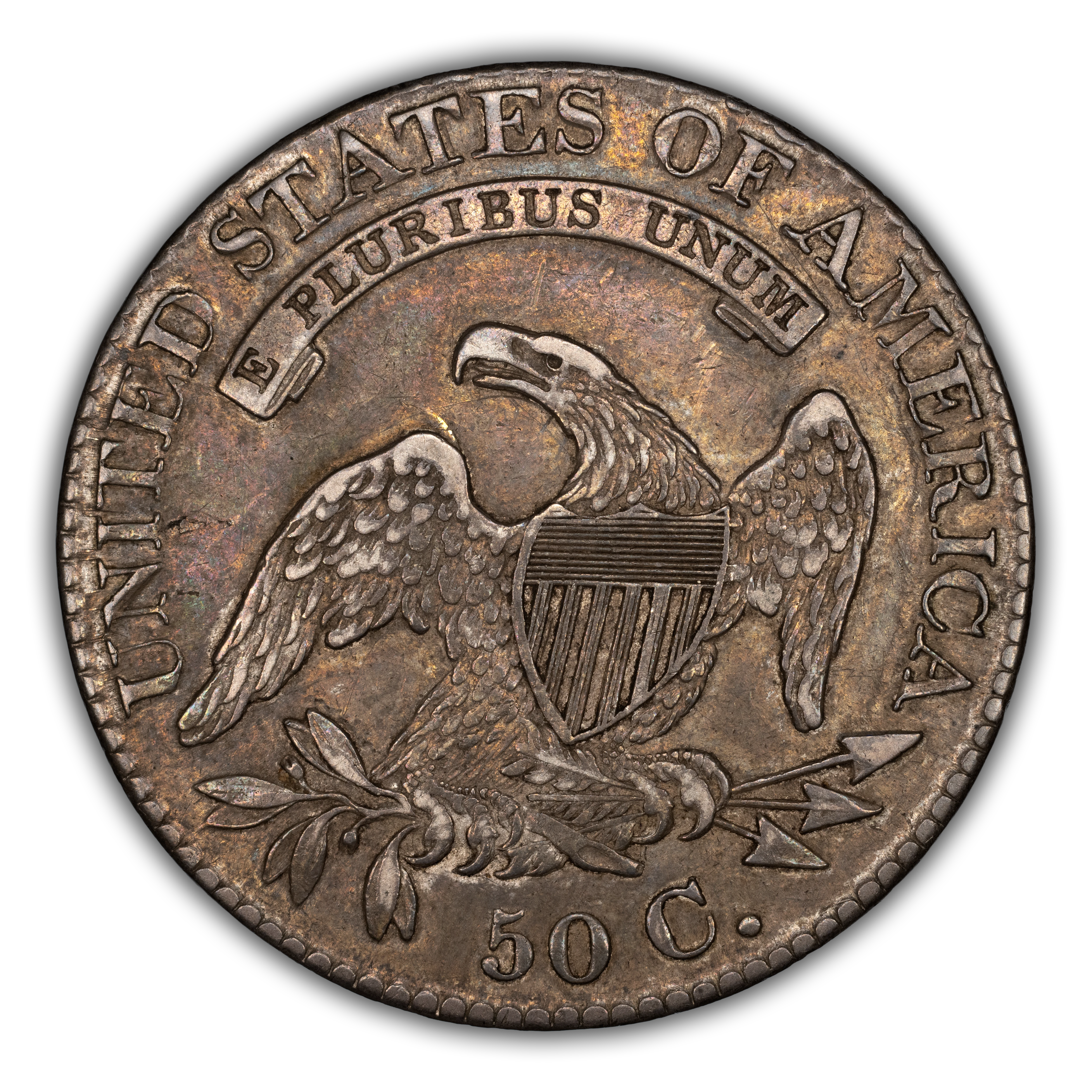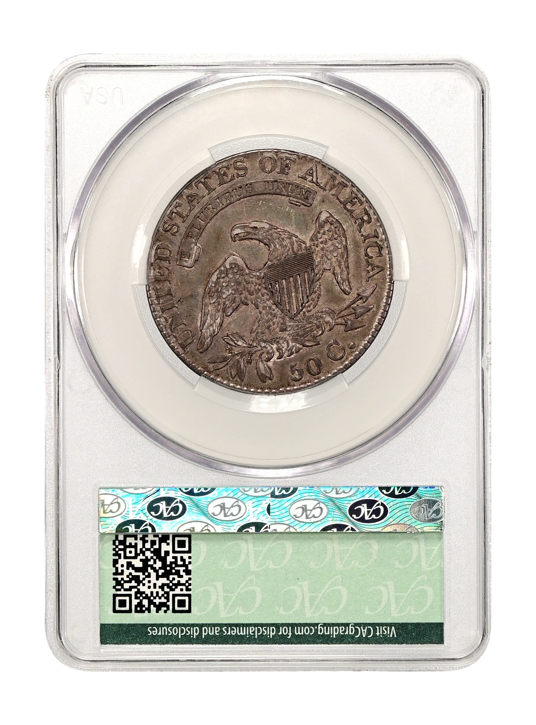 Reverse: An heraldic eagle holding olive branches and 3 arrows in its claws is surrounded by the words UNITED STATES OF AMERICA around the periphery. A ribbon below bears the motto E PLURIBUS UNUM. The denomination of 50C is centered below the eagle.
