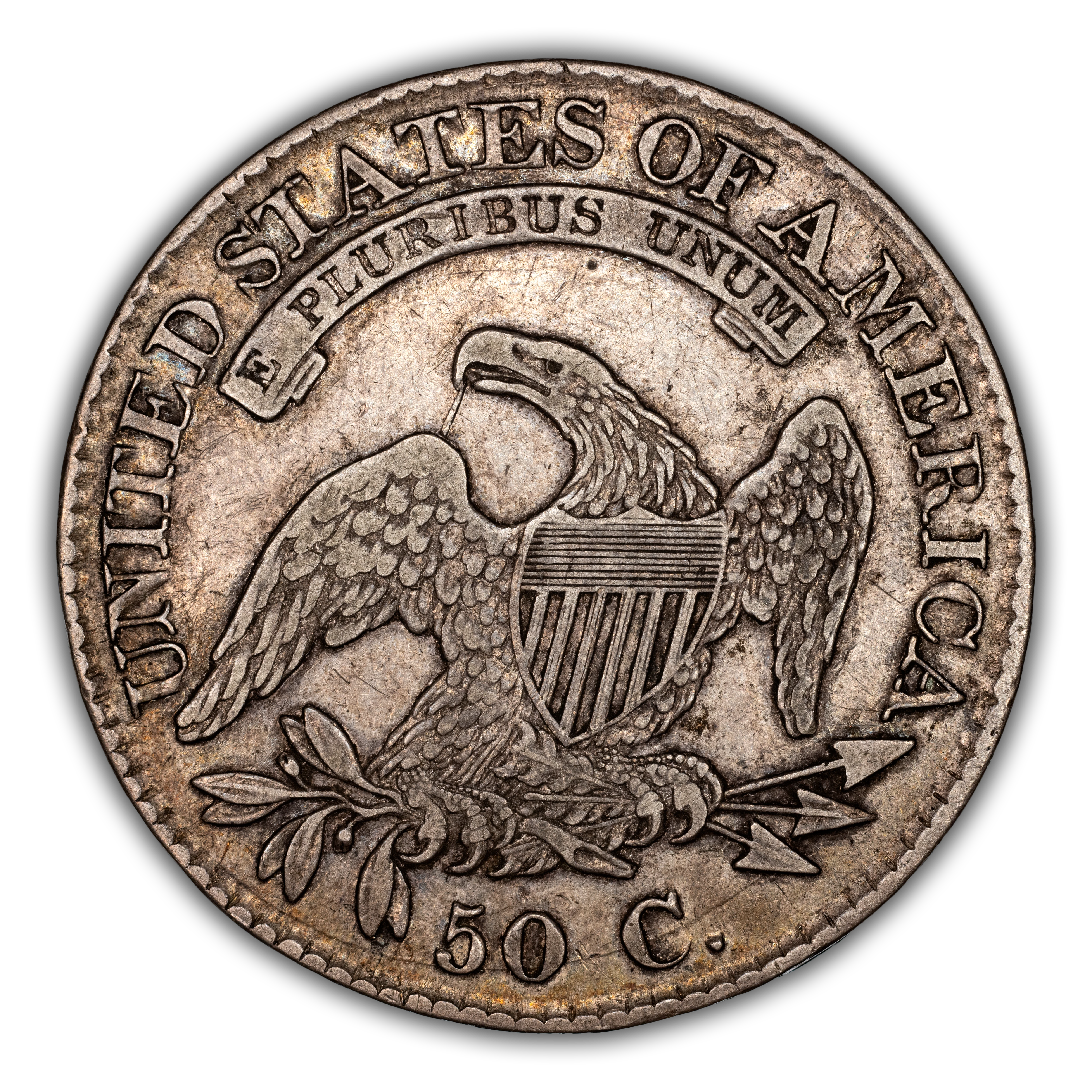 Reverse: An heraldic eagle holding olive branches and 3 arrows in its claws is surrounded by the words UNITED STATES OF AMERICA around the periphery. A ribbon below bears the motto E PLURIBUS UNUM. The denomination of 50C is centered below the eagle.