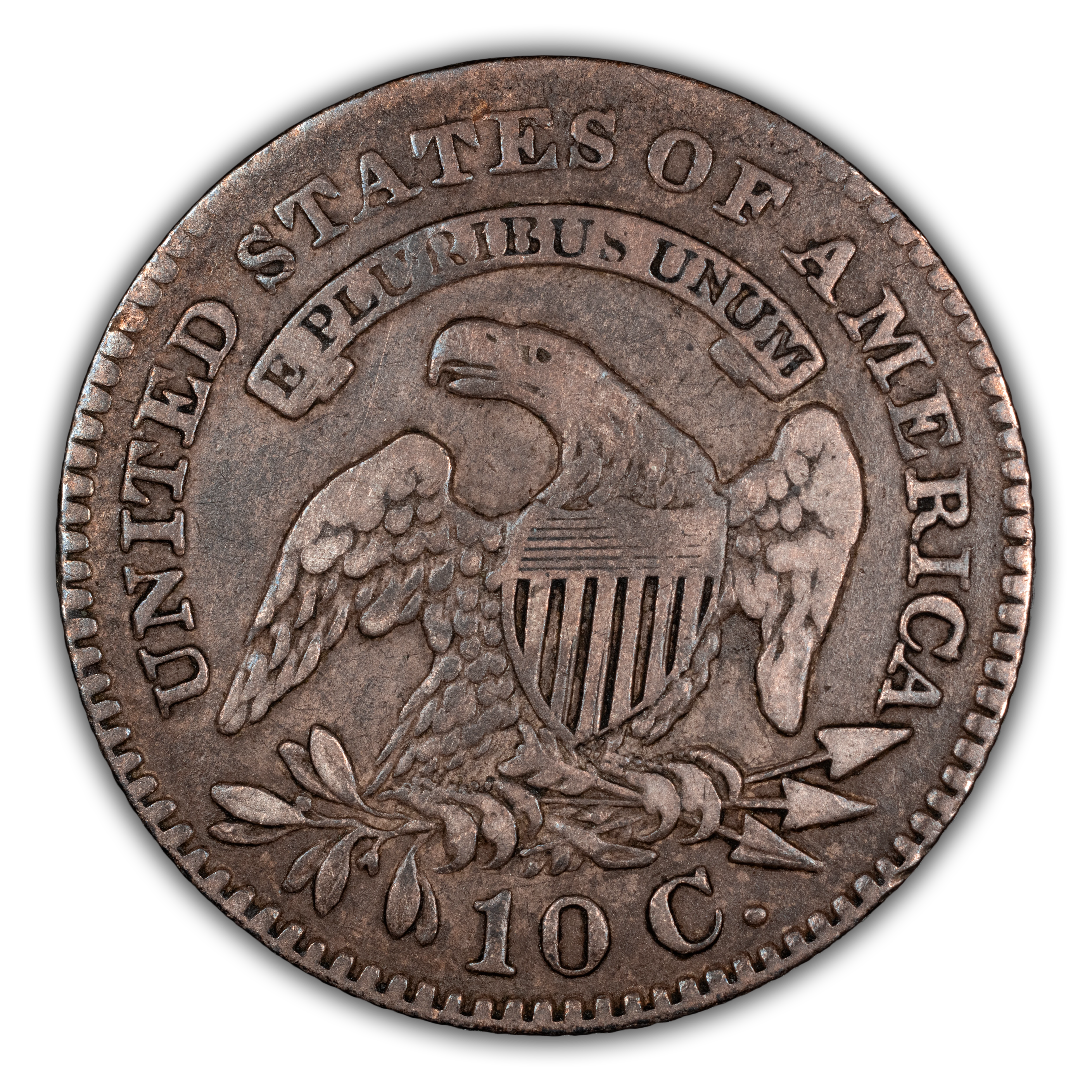 Capped Bust dimes, designed by John Reich, are generally more common than the Draped Bust issues. However, like their earlier counterparts they are challenging to locate in the better Mint States grades. The 1822 and 1829 Curl Base 2 are the rarest issues, with both regularly trading in the four-figure range.