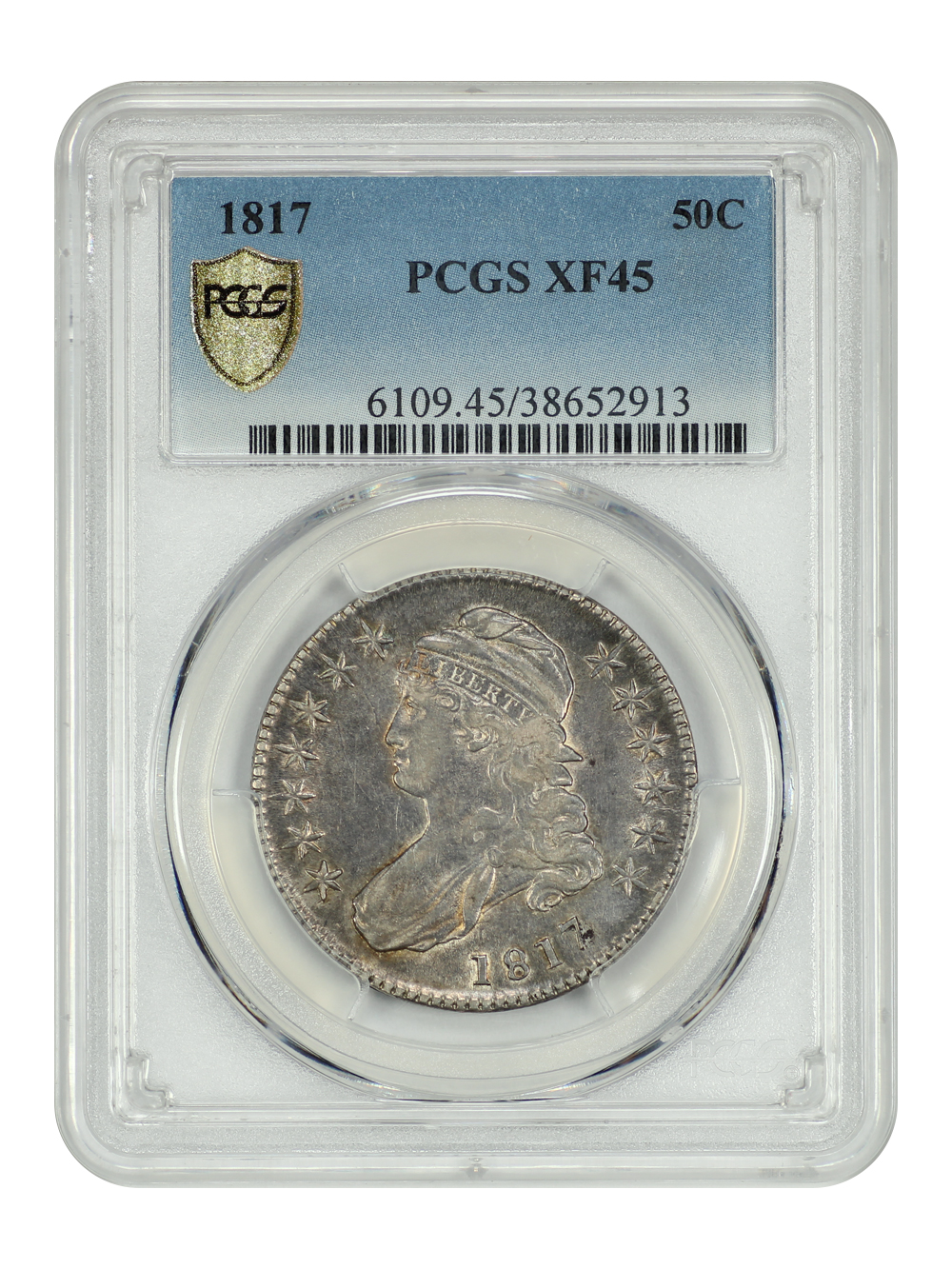 Reverse: An heraldic eagle holding olive branches and 3 arrows in its claws is surrounded by the words UNITED STATES OF AMERICA around the periphery. A ribbon below bears the motto E PLURIBUS UNUM. The denomination of 50C is centered below the eagle.
