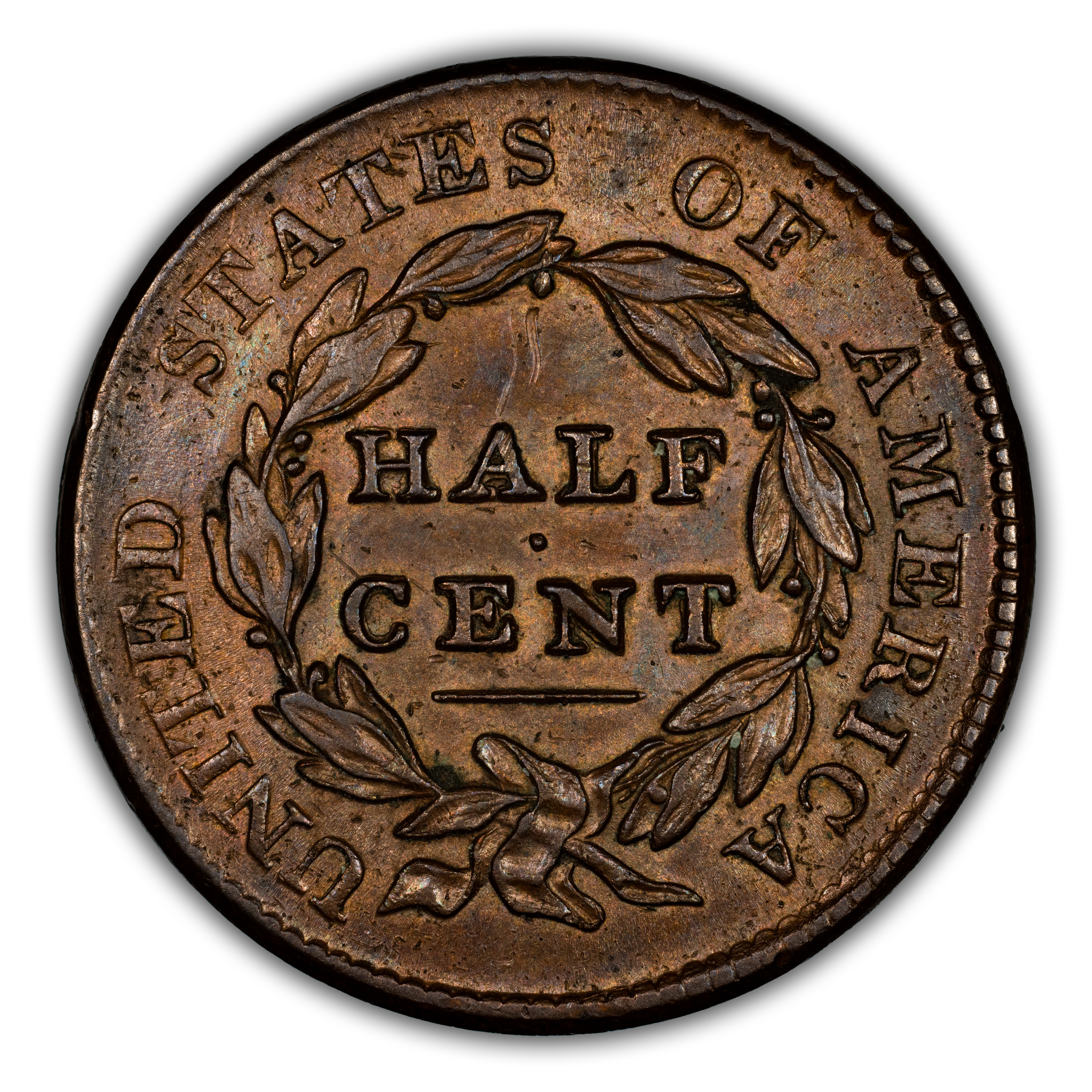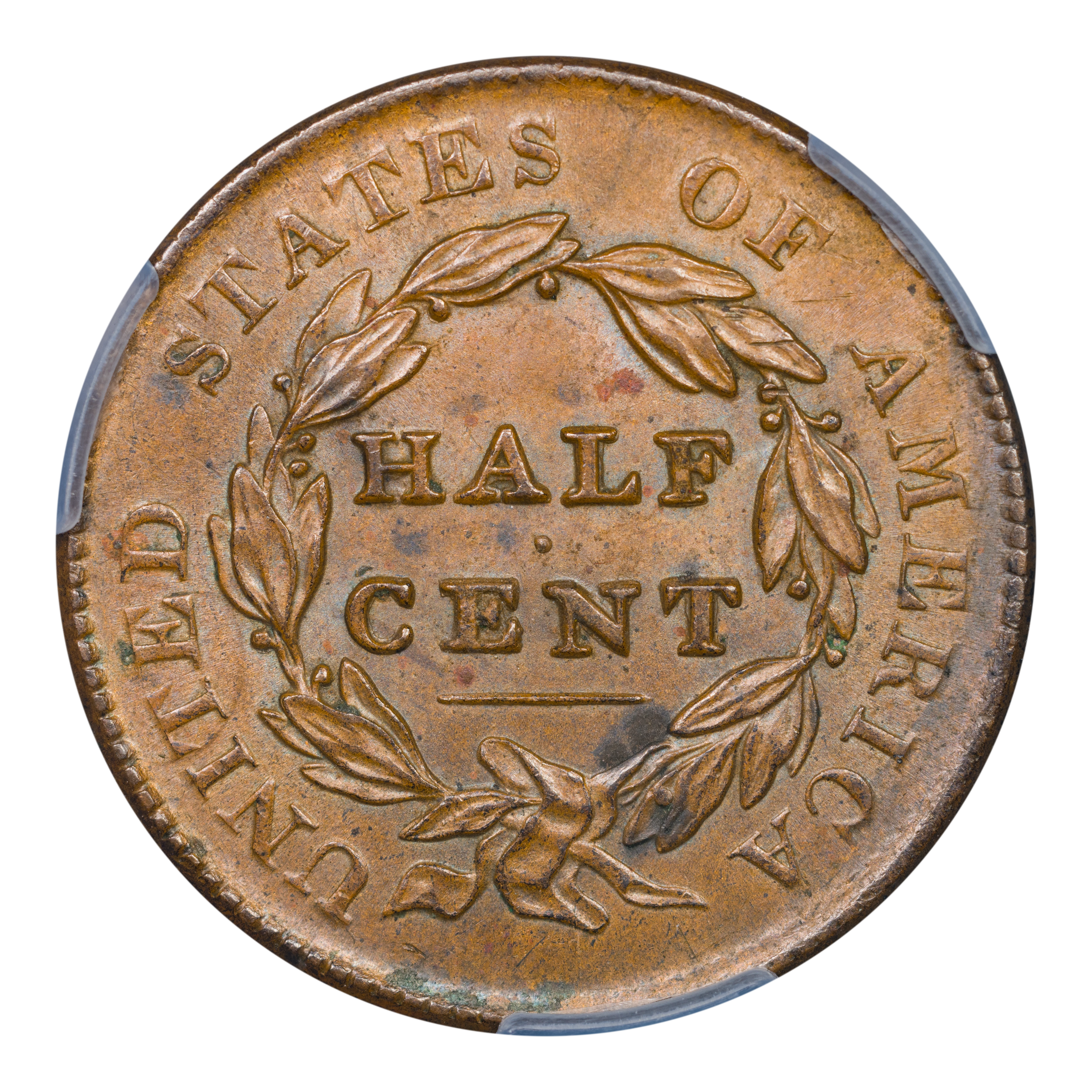 Reverse: The words UNITED STATES OF AMERICA around the periphery surround a wreath framing the words HALF CENT. The wreath is tied by a bow at the bottom.