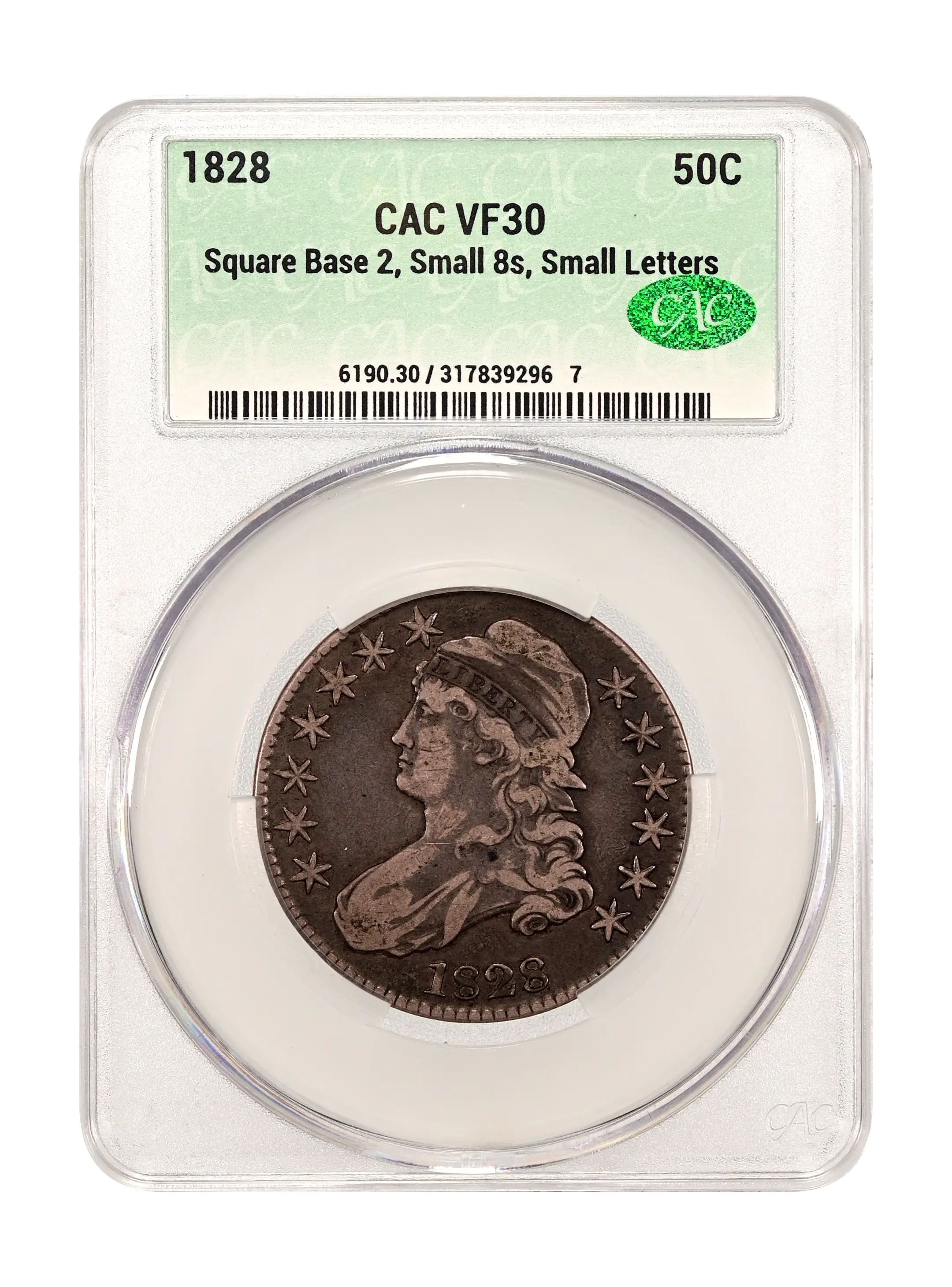 1828 Square Base 2, Small 8s, Small Letters 50c CAC VF30