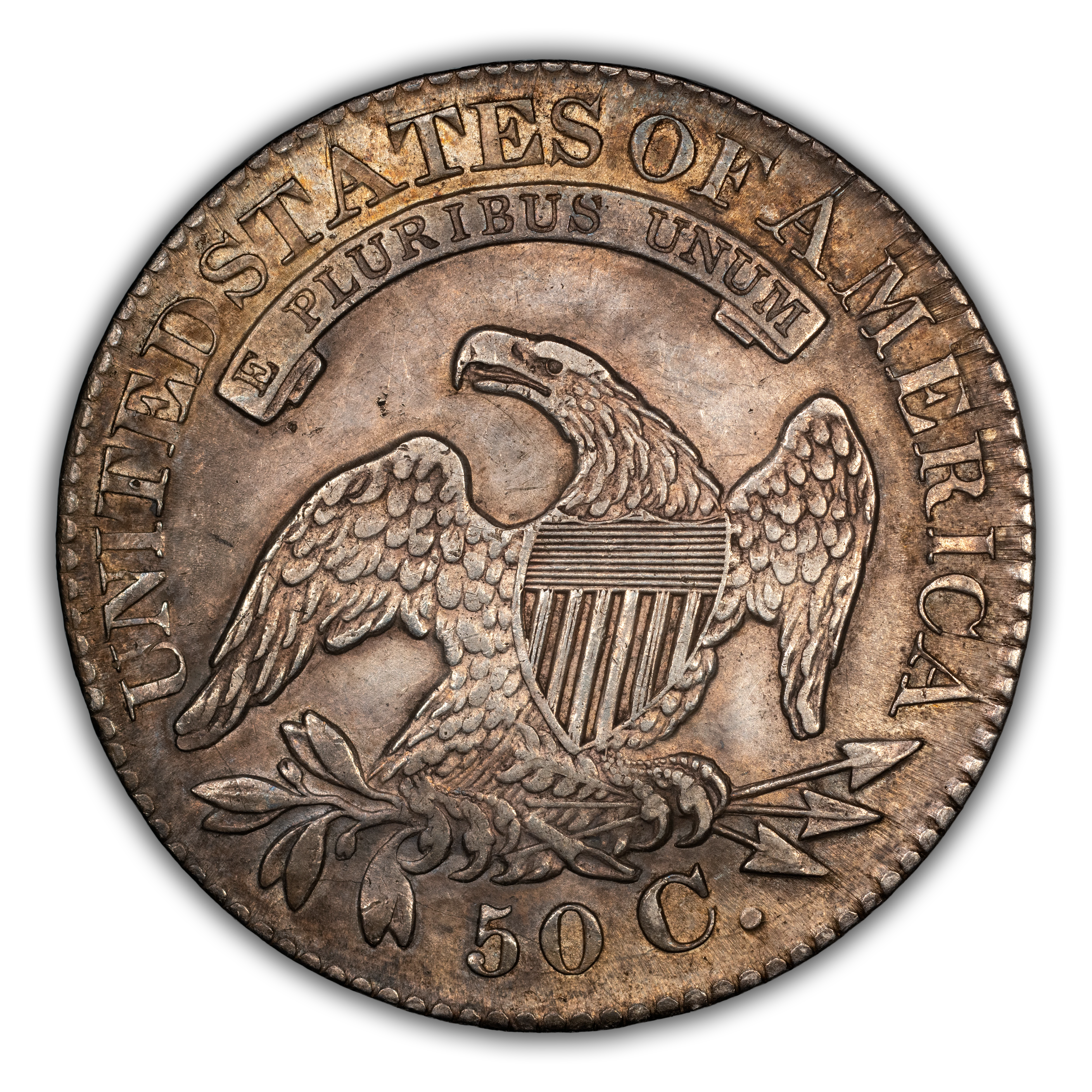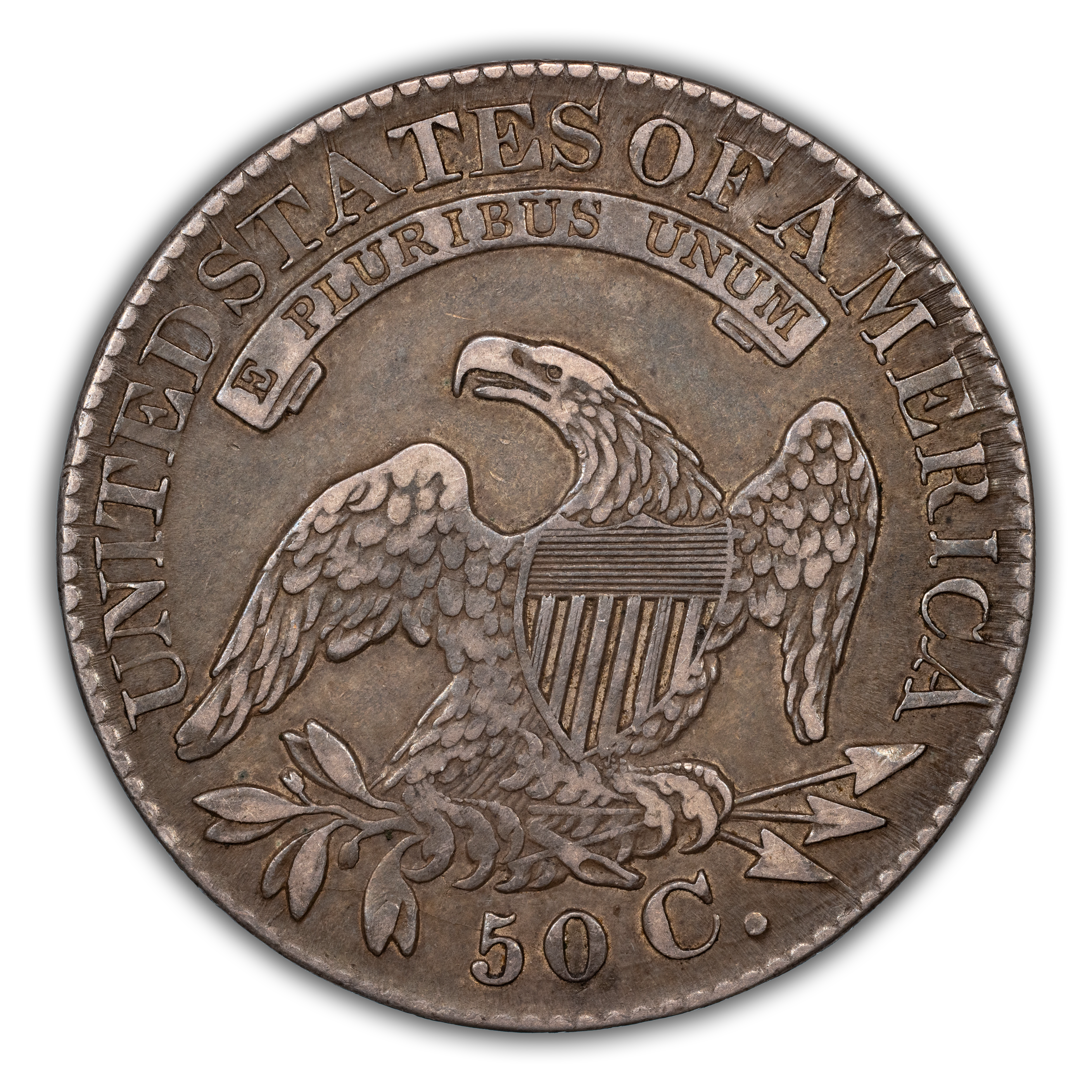 Reverse: An heraldic eagle holding olive branches and 3 arrows in its claws is surrounded by the words UNITED STATES OF AMERICA around the periphery. A ribbon below bears the motto E PLURIBUS UNUM. The denomination of 50C is centered below the eagle.
