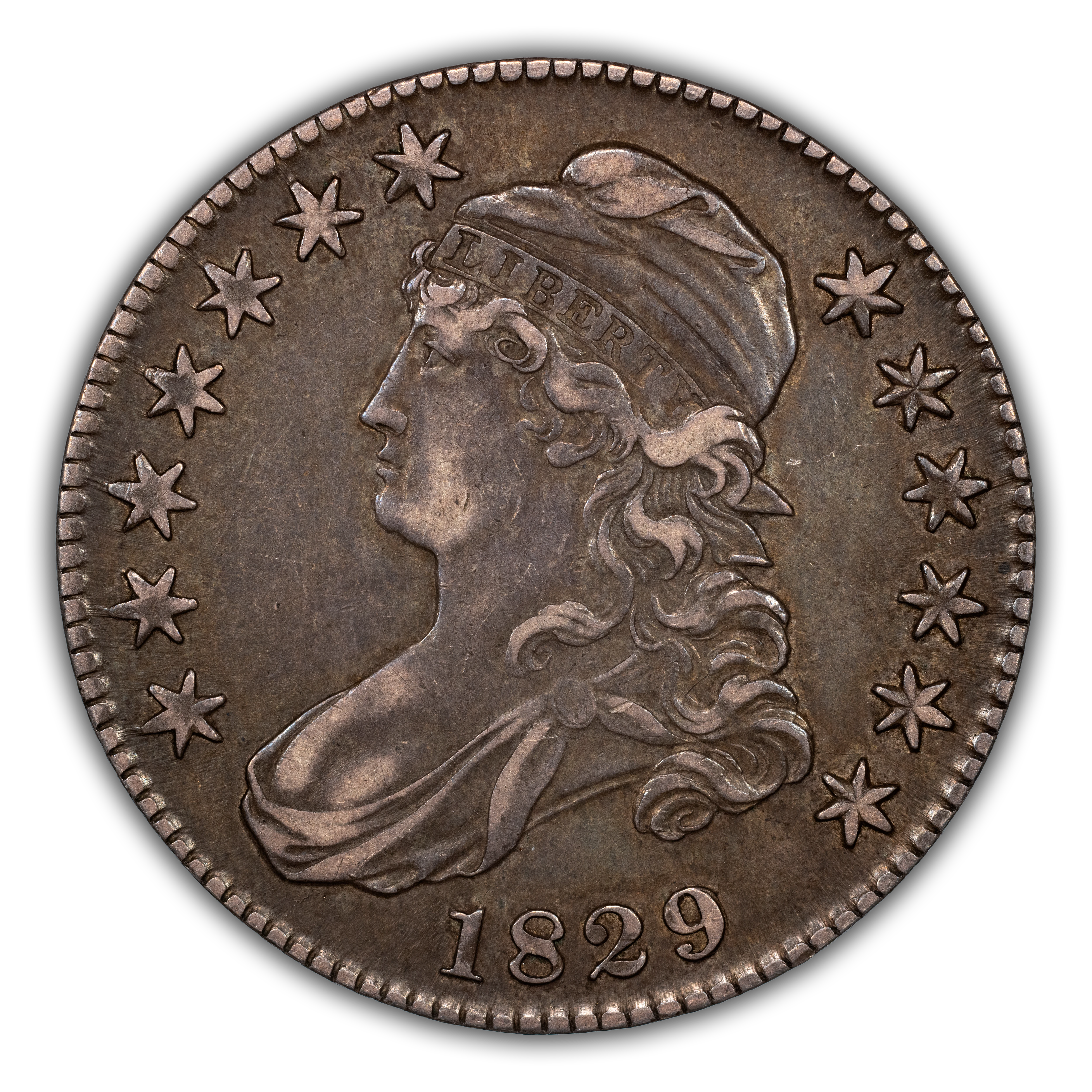1829 50C Large Letters, O-110a, R.3, AU58 NGC. NGC Census: (3/2)....