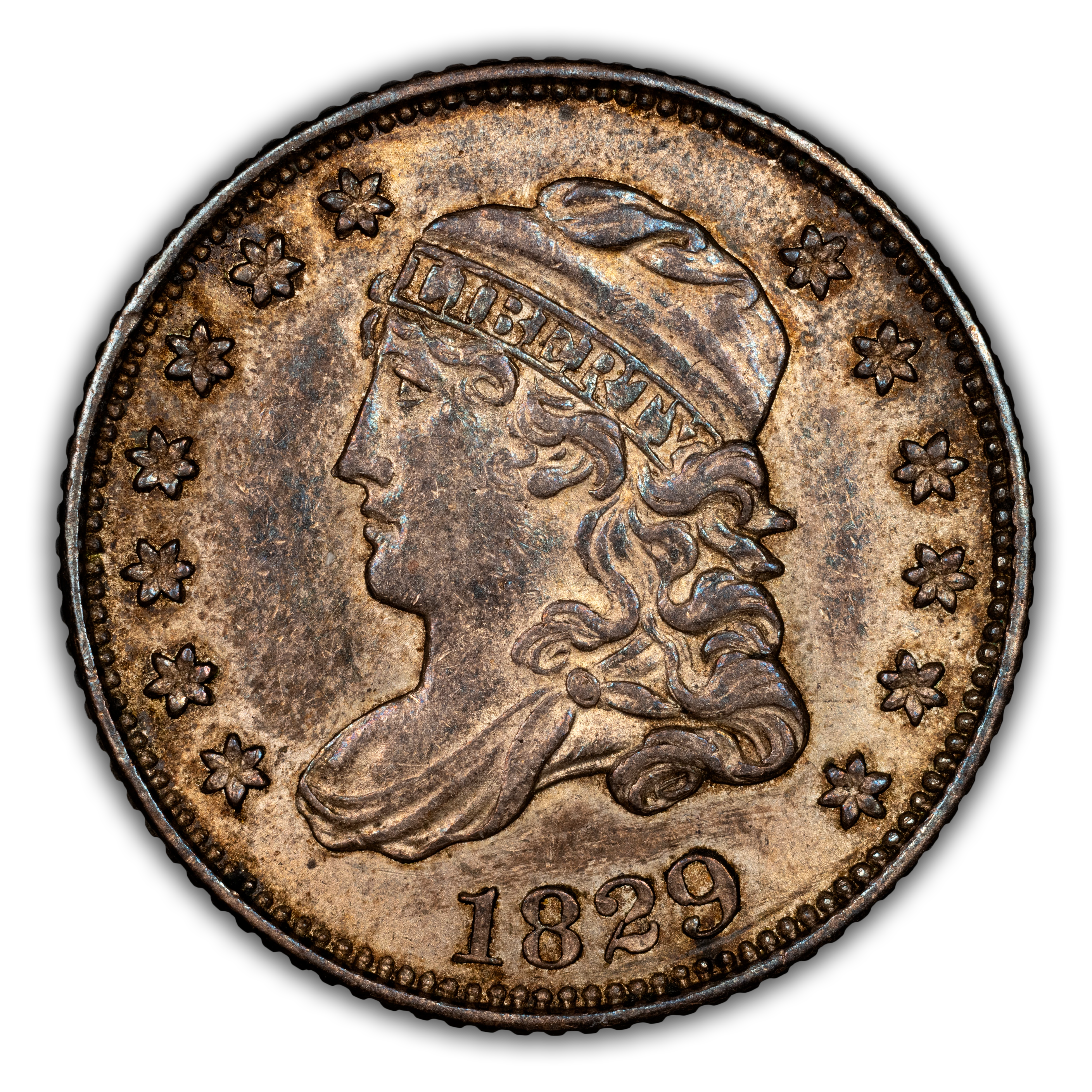 Greysheet Catalog Details (GSID: 212533) 3 pale gules: the heraldic shield held by the eagle is the Union Shield with its red, white, and blue colors and 13 vertical bars (called pales) for the 13 original states. The horizontal lines at top are blue, and the 13 pales are red and white. The colors are represented on coins by heraldic hatching, or thin lines - horizontal stripes for blue, vertical for red, and no stripes for white. The first three reverse dies in 1829 had three thin stripes for red ("3 pale gules") but this was amended to two stripes ("2 pale gules") for the remainder of the series. From "Federal Half Dimes 1792-1837" by Logan and McCloskey: "All 1829 half dimes were struck from dies using the same basic design except that there are two distinct variations for the reverse. Chief Engraver William Kneass wanted as much detail as possible on the reverse, so he initially engraved three pale gules in the shield. Unfortunately, these delicate gules merged into a single broad stripe on the struck coins, forcing Kneass to use two pale gules. Only the first three working dies that were used to strike (1829) die marriages LM-1, LM-2, and LM-3 have three pale gules.” An eagle is centered in the design with a shield over its chest, holding arrows and olive branches in its talons. A ribbon above bears the motto E PLURIBUS UNUM with UNITED STATES OF AMERICA around the periphery. The denomination listed as "5C." appears at the bottom.
