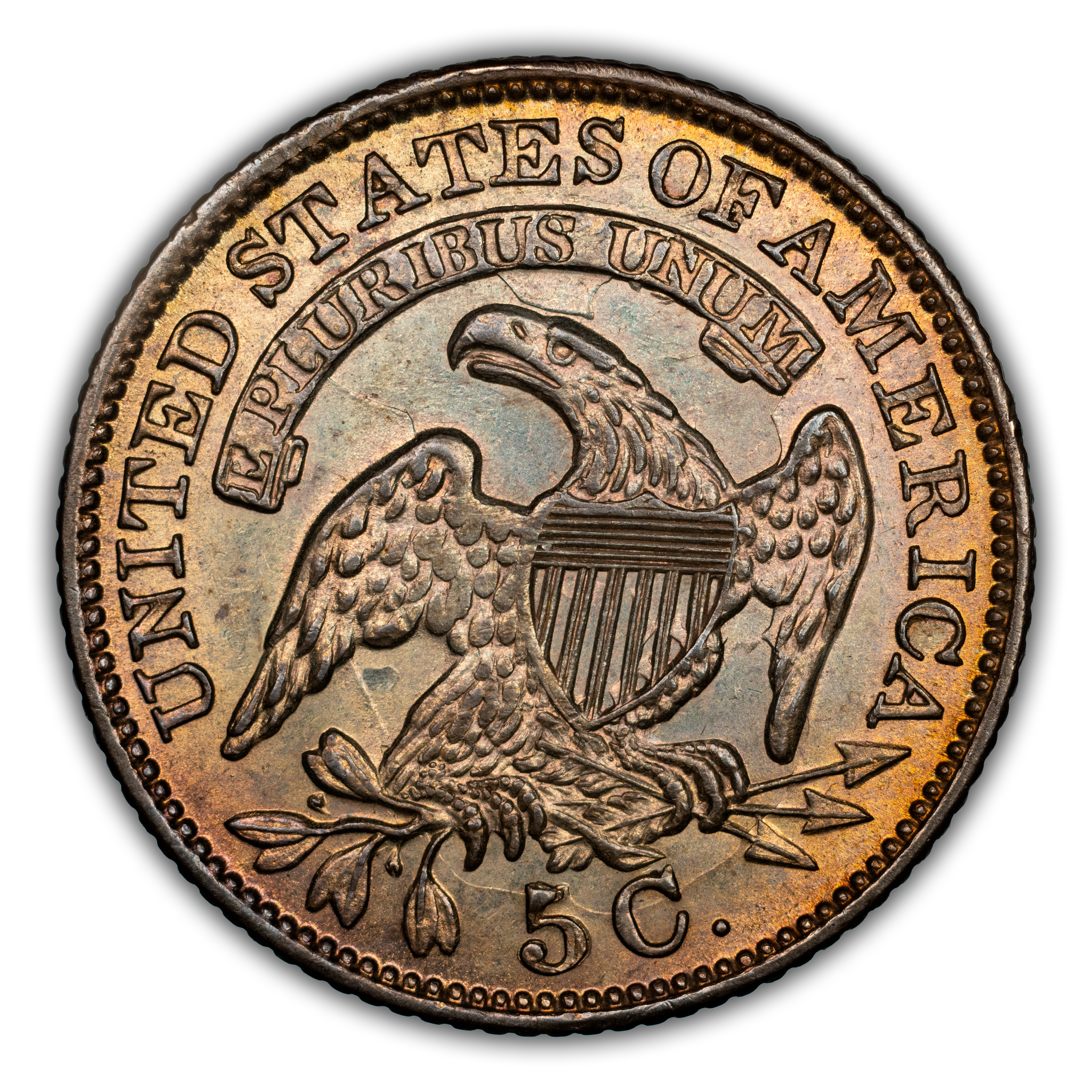 Reverse: An eagle is centered in the design with a shield over its chest, holding arrows and olive branches in its talons. A ribbon above bears the motto E PLURIBUS UNUM with UNITED STATES OF AMERICA around the periphery. The denomination listed as "5C." appears at the bottom.