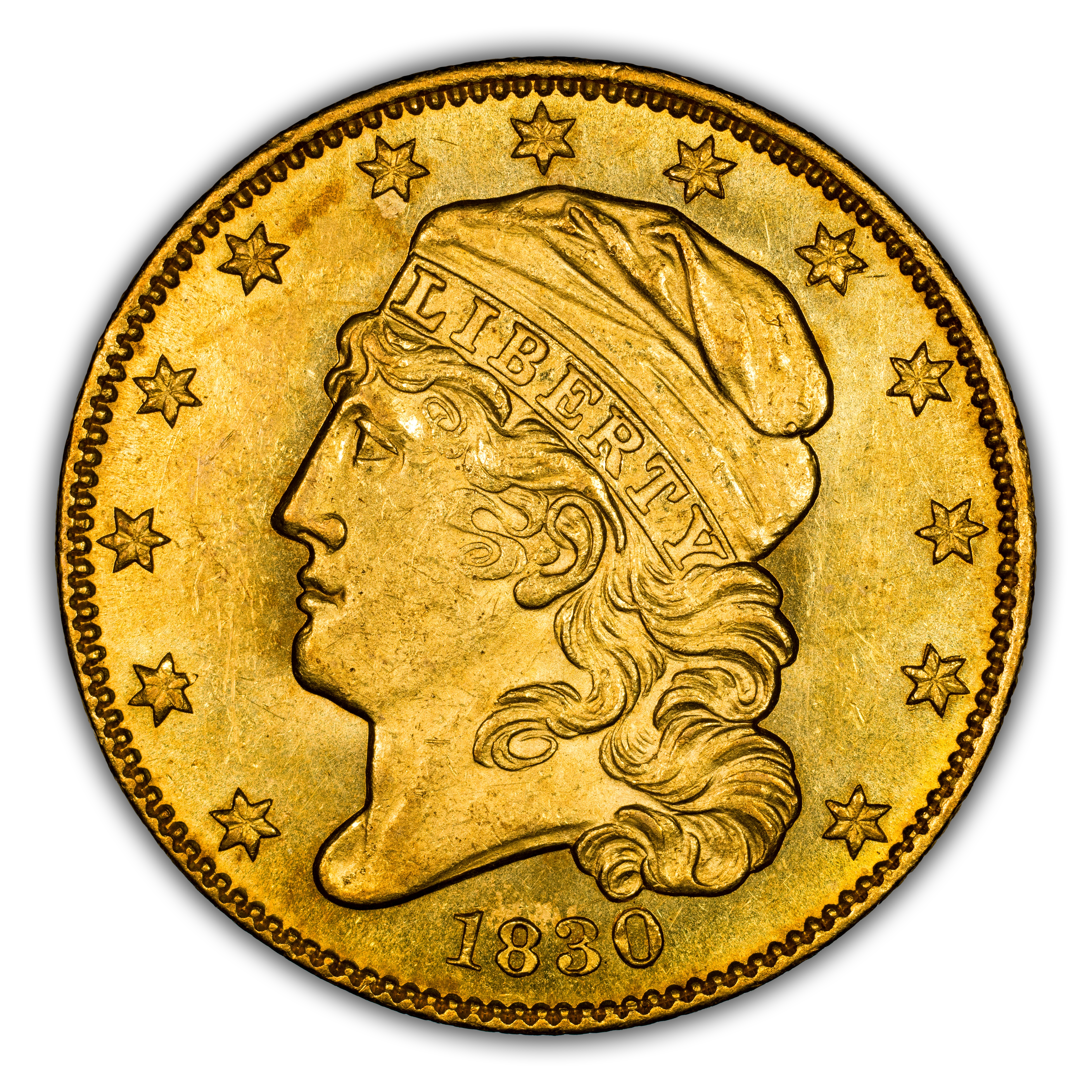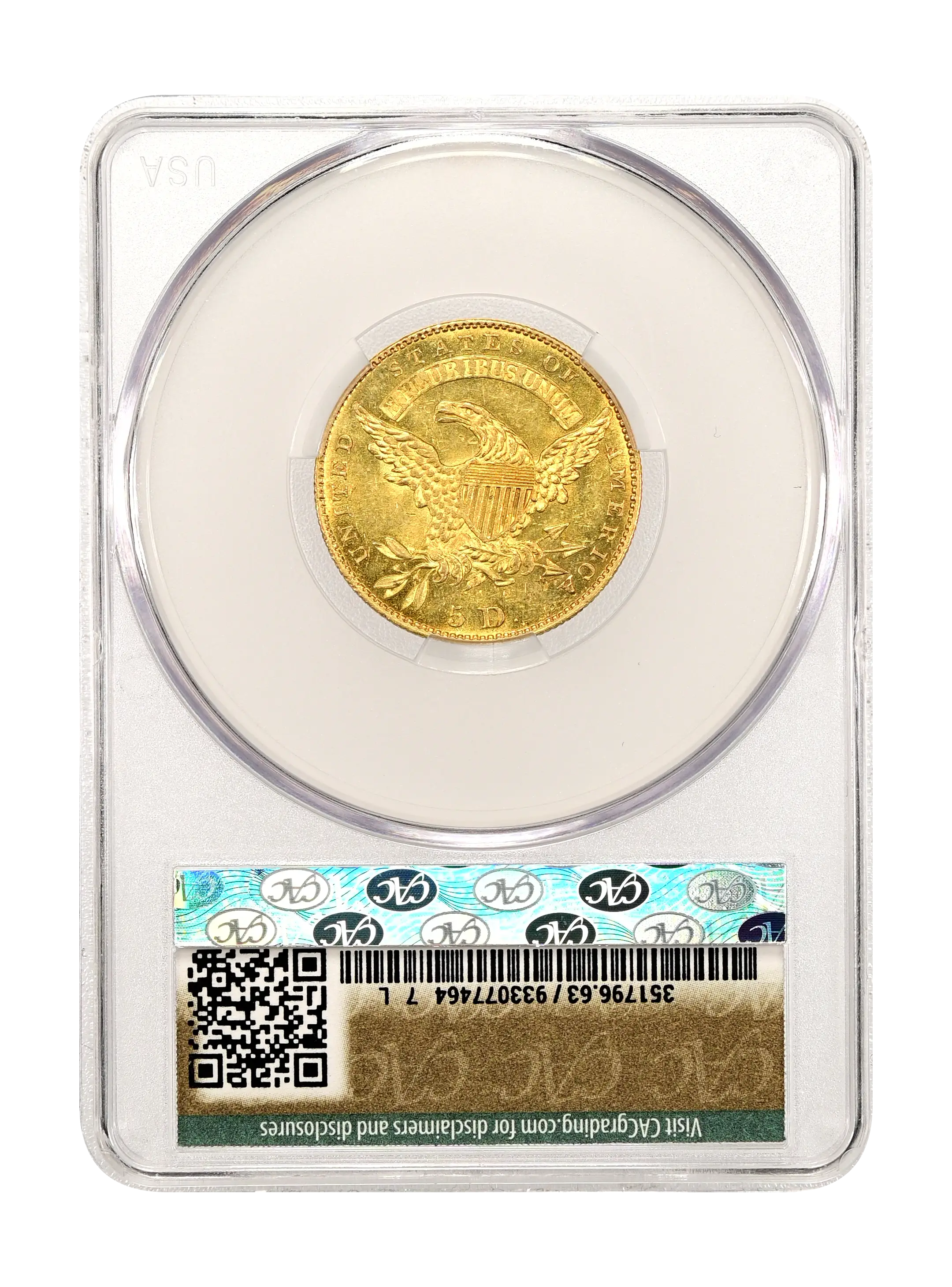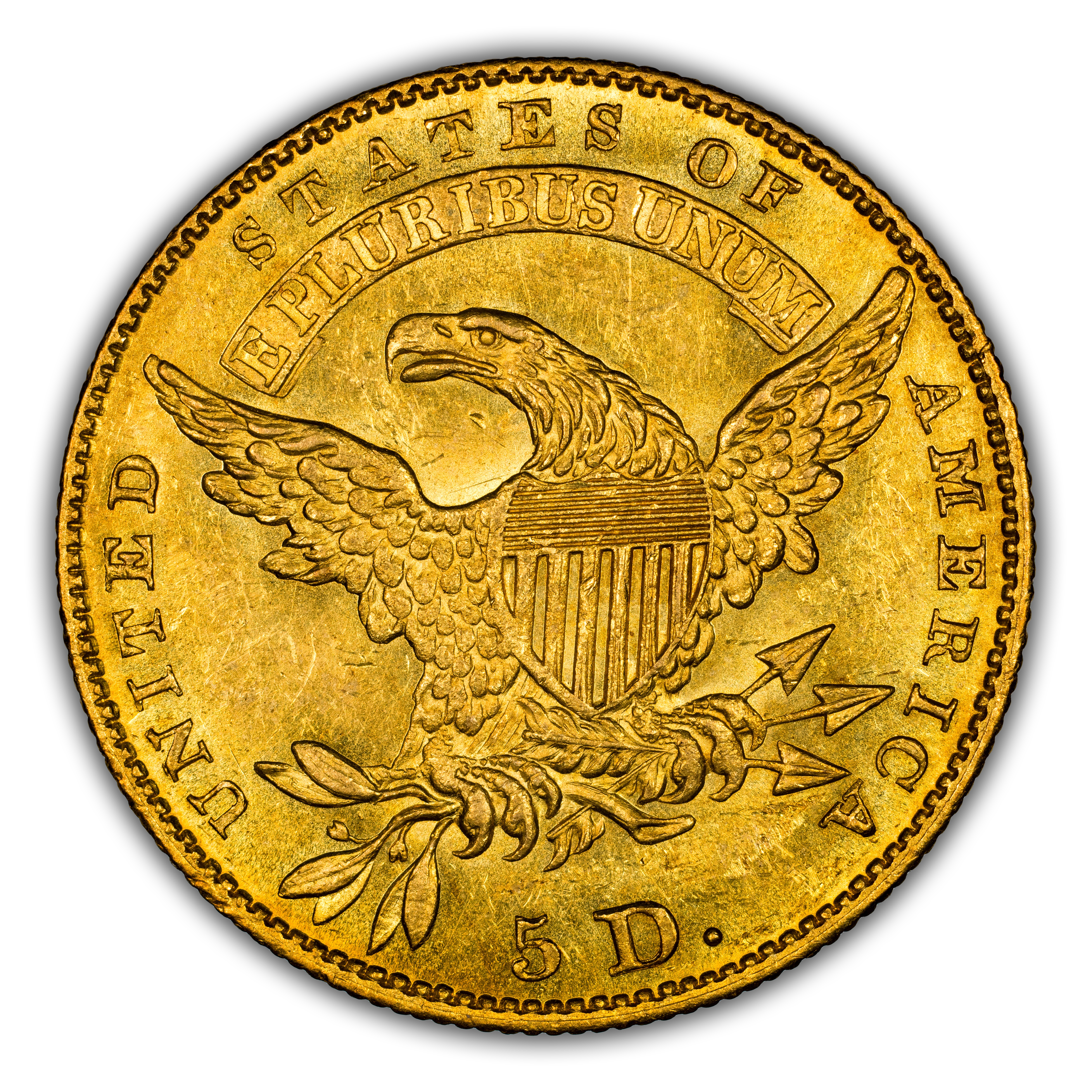 Reverse: An eagle with wings fully spread with a ribbon above its head bearing the motto E PLURIBUS UNUM. The words UNITED STATES OF AMERICA around the periphery with "5 D." at the bottom.