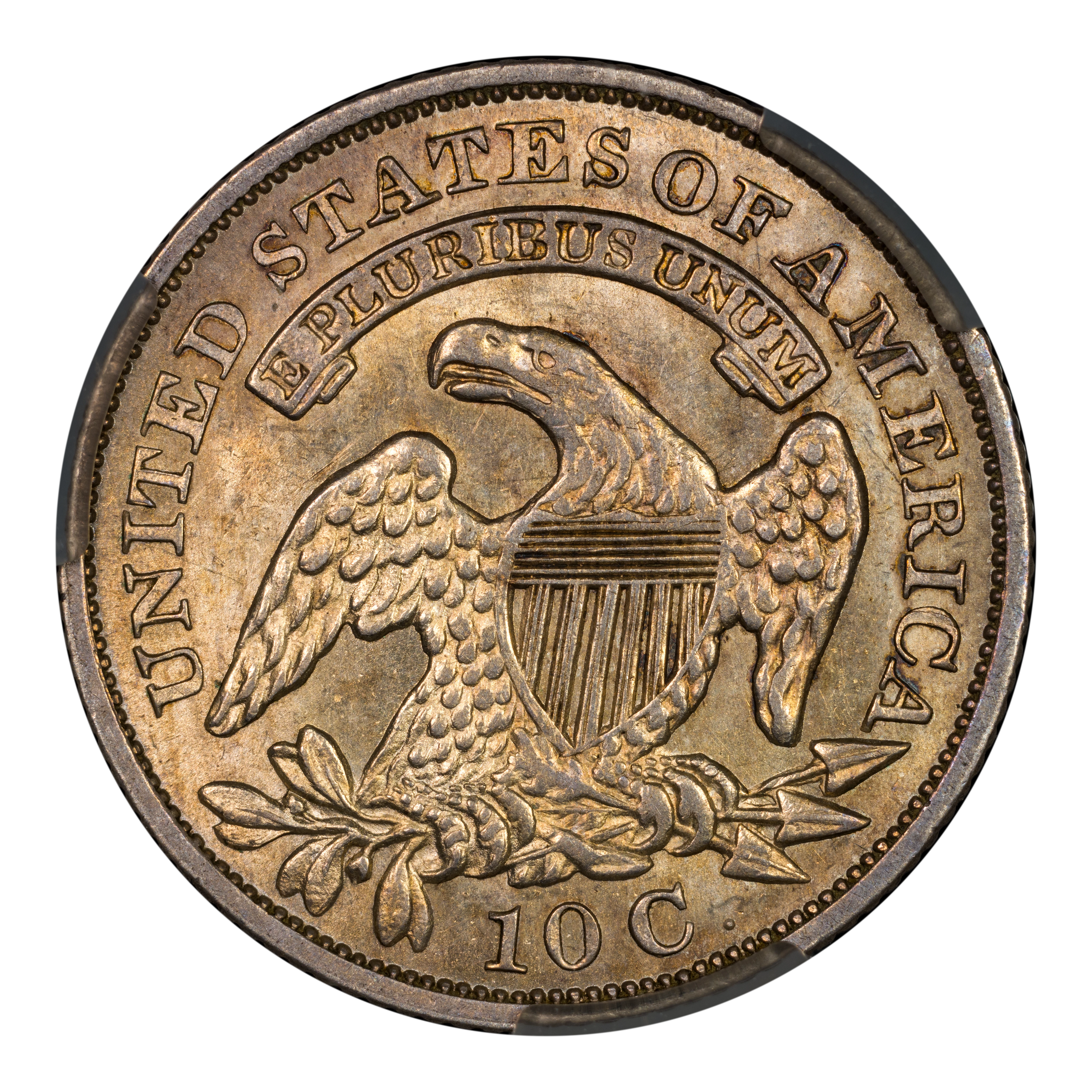 Reverse: An eagle is centered in the design with a shield over its chest, holding arrows and olive branches in its talons. A ribbon above bears the motto E PLURIBUS UNUM with UNITED STATES OF AMERICA around the periphery. The denomination listed as "10 C." appears at the bottom.
