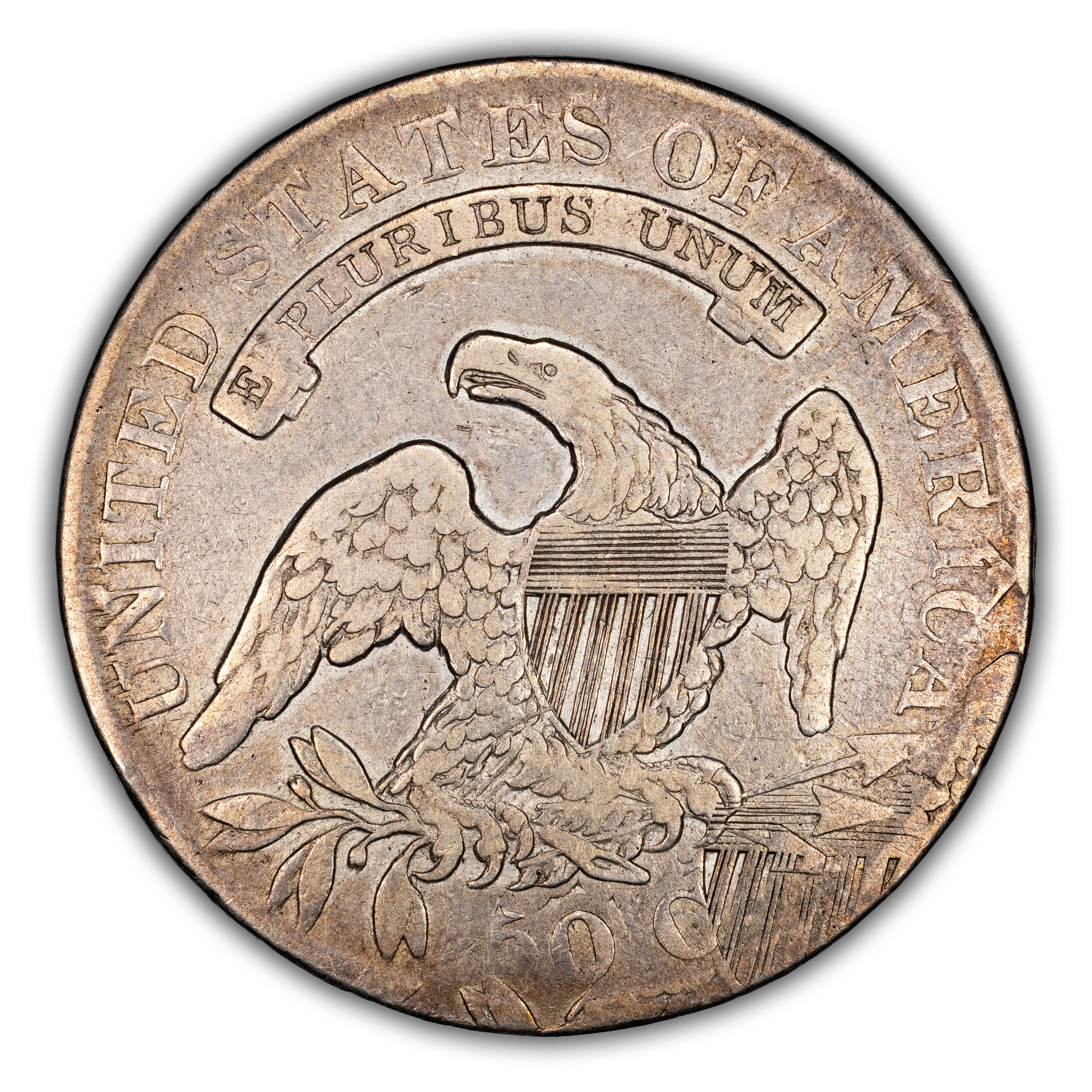 Reverse: An heraldic eagle holding olive branches and 3 arrows in its claws is surrounded by the words UNITED STATES OF AMERICA around the periphery. A ribbon below bears the motto E PLURIBUS UNUM. The denomination of 50C is centered below the eagle.